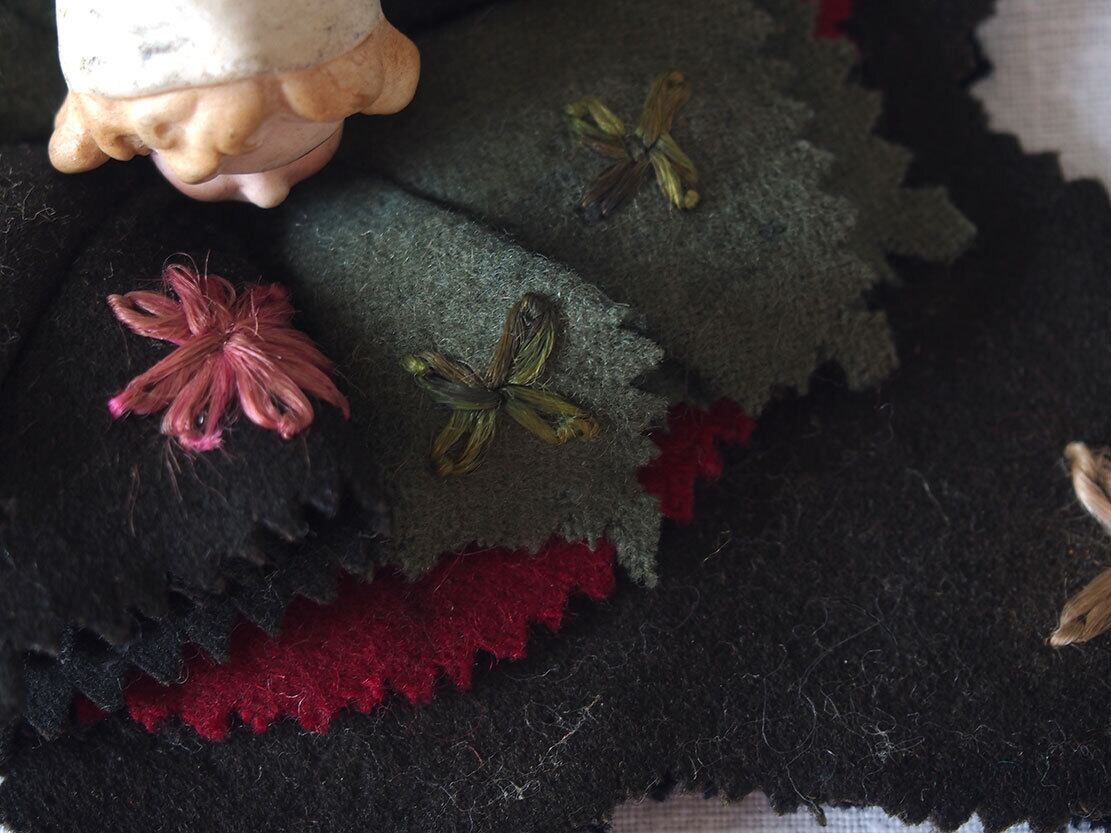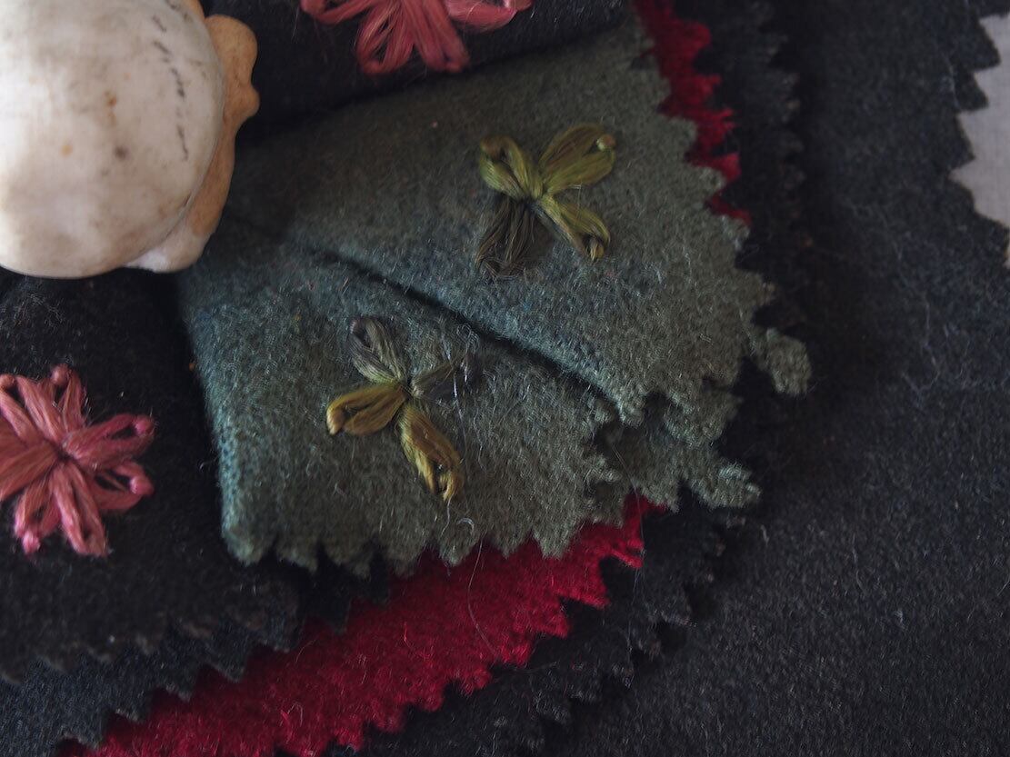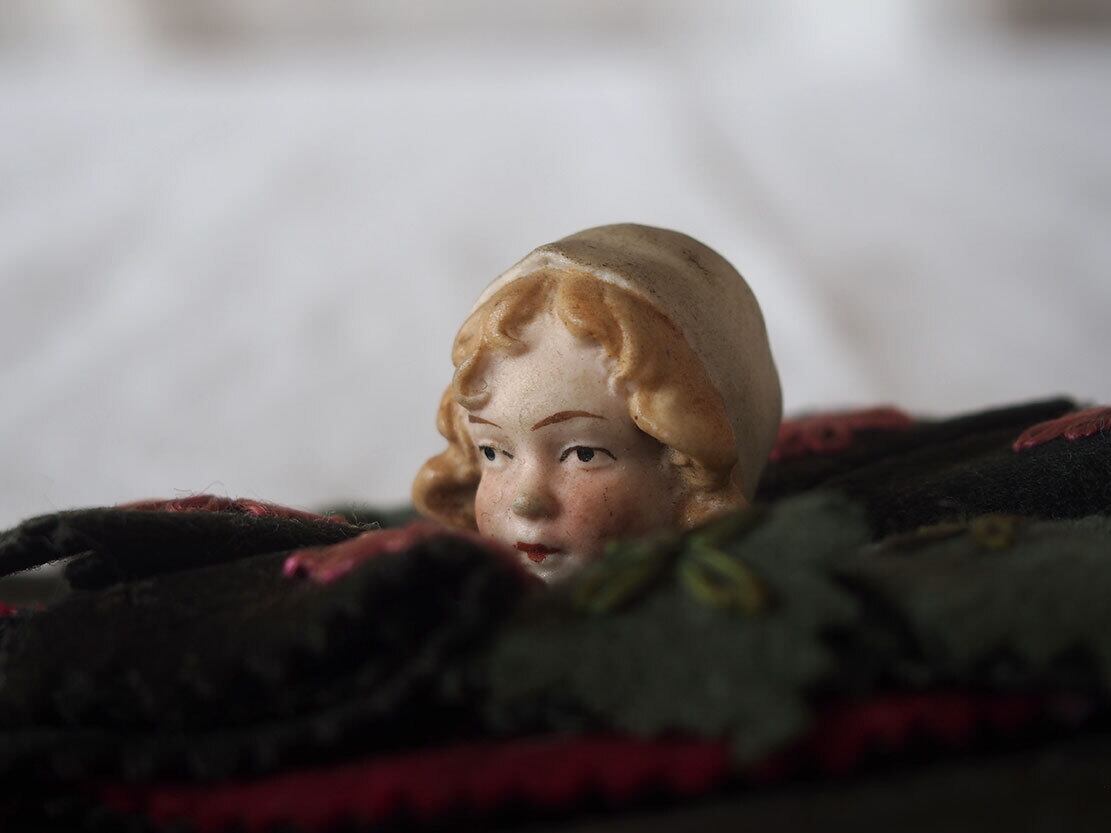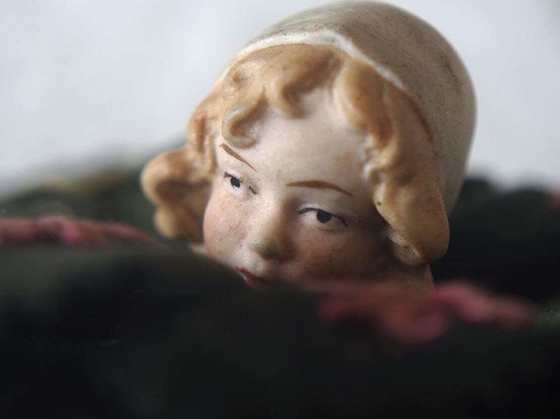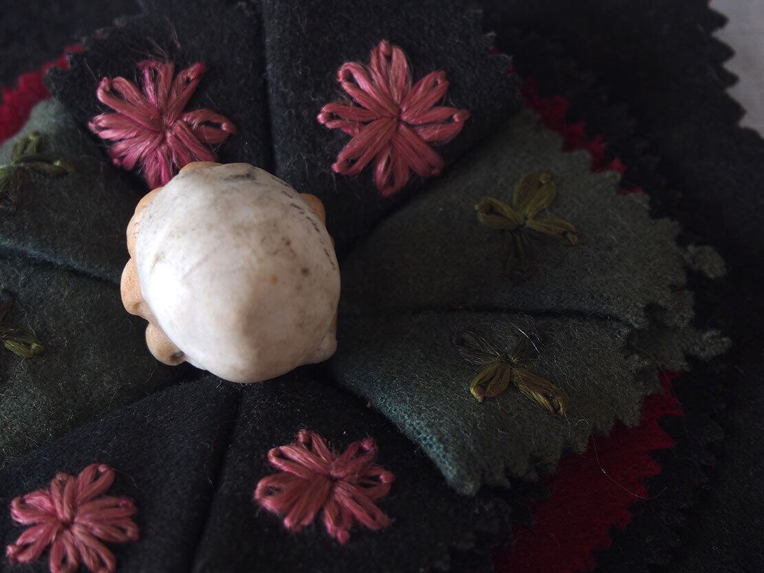 欧州のアンティーク市で入手。ドールヘッド付きのピンクッションまたは小物入れの蓋として手作りされた物だとおもわれます。1900年前後〜1920年頃。フェルトに痛みが少々あります。詳細は写真でご確認いただけます。ブラッシング程度の手入れをしてあります。古い物だと言う事をご理解の上のご入札をお願い致します。材質及び年代の判定は困難な場合があります、差異についてはあらかじめご了承下さい。