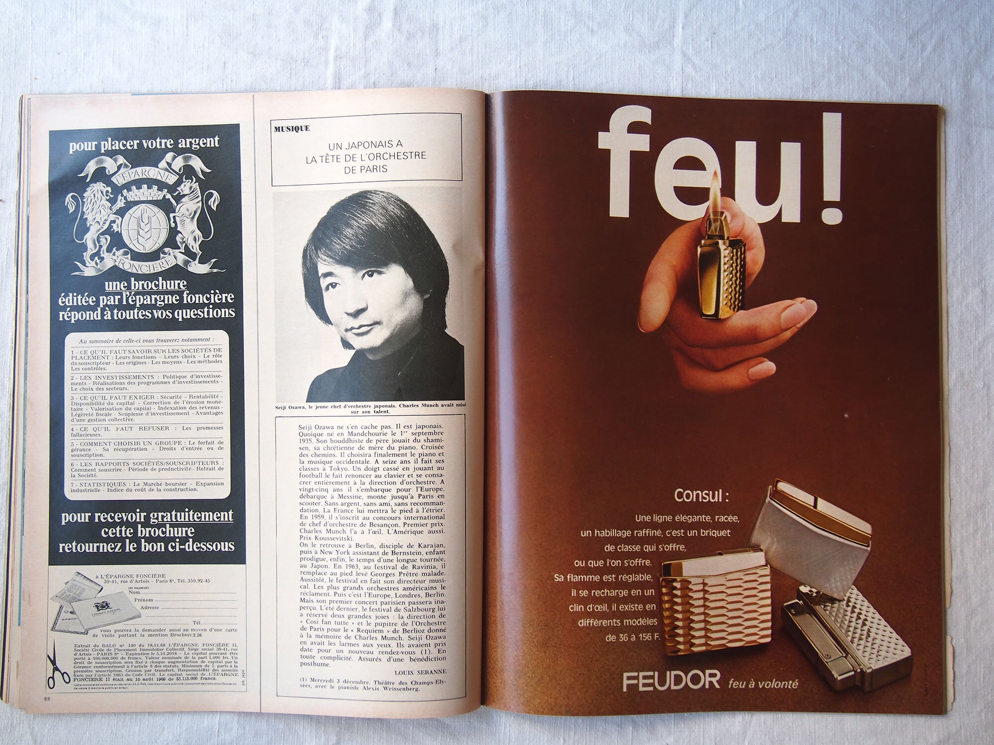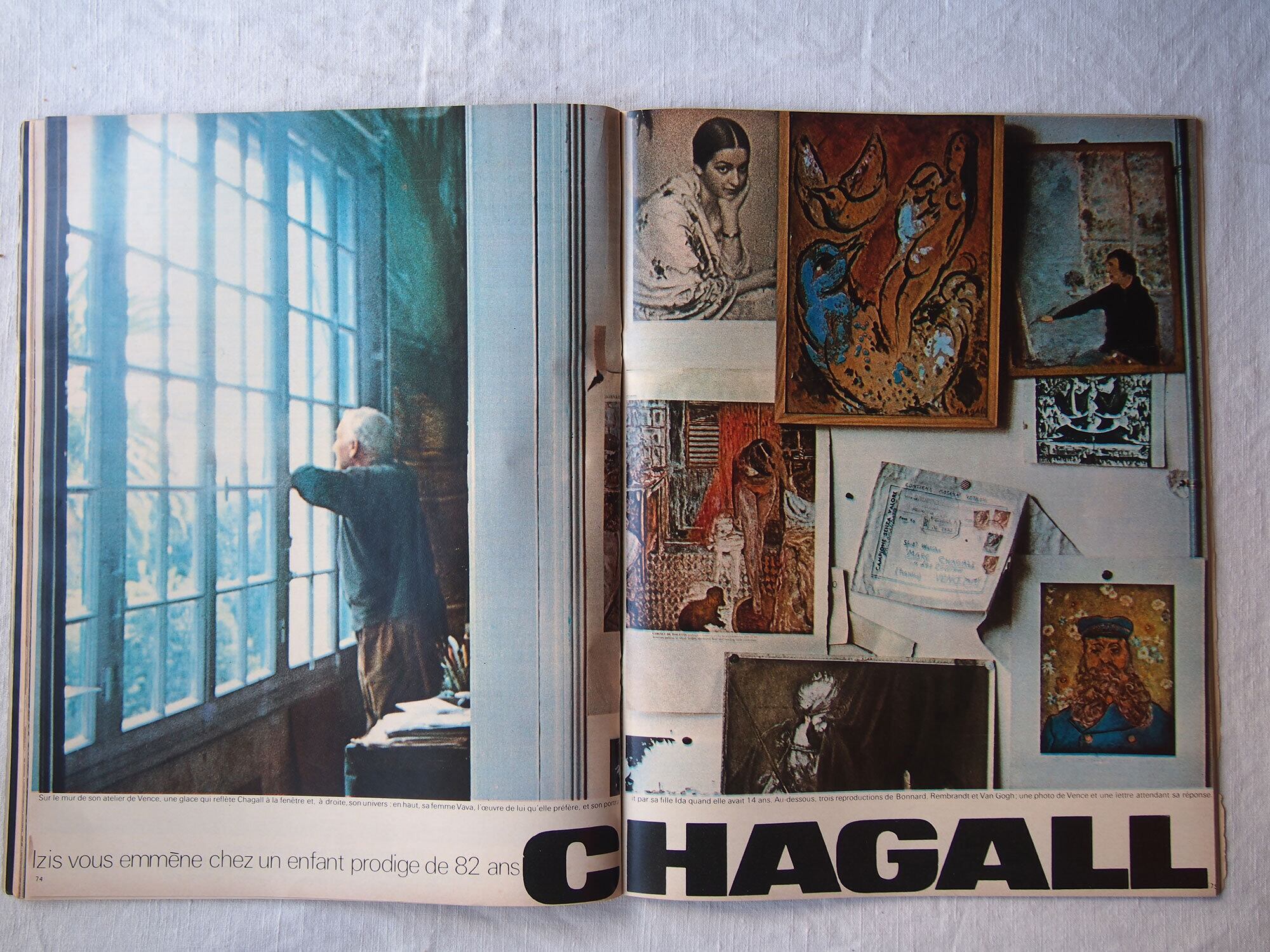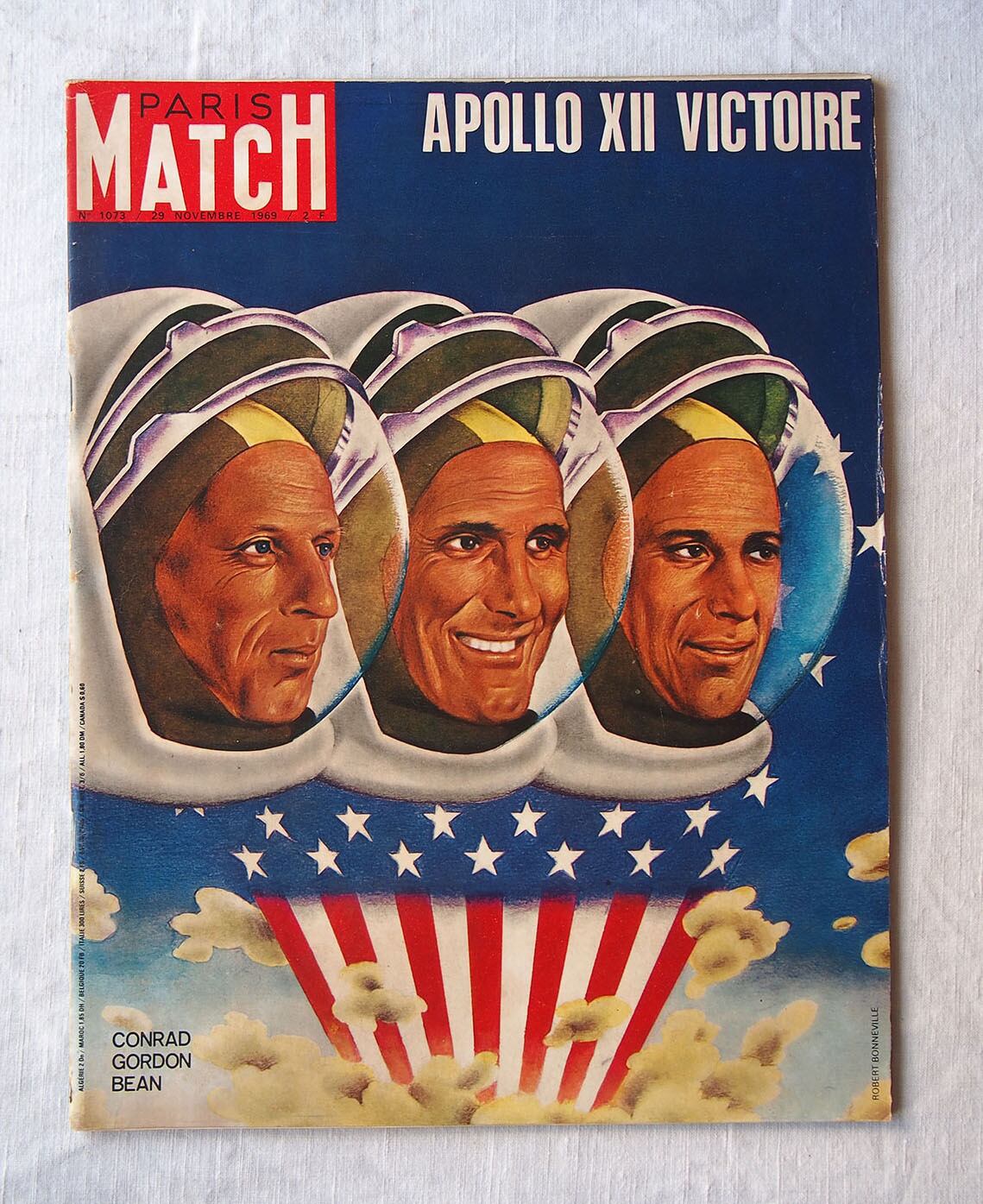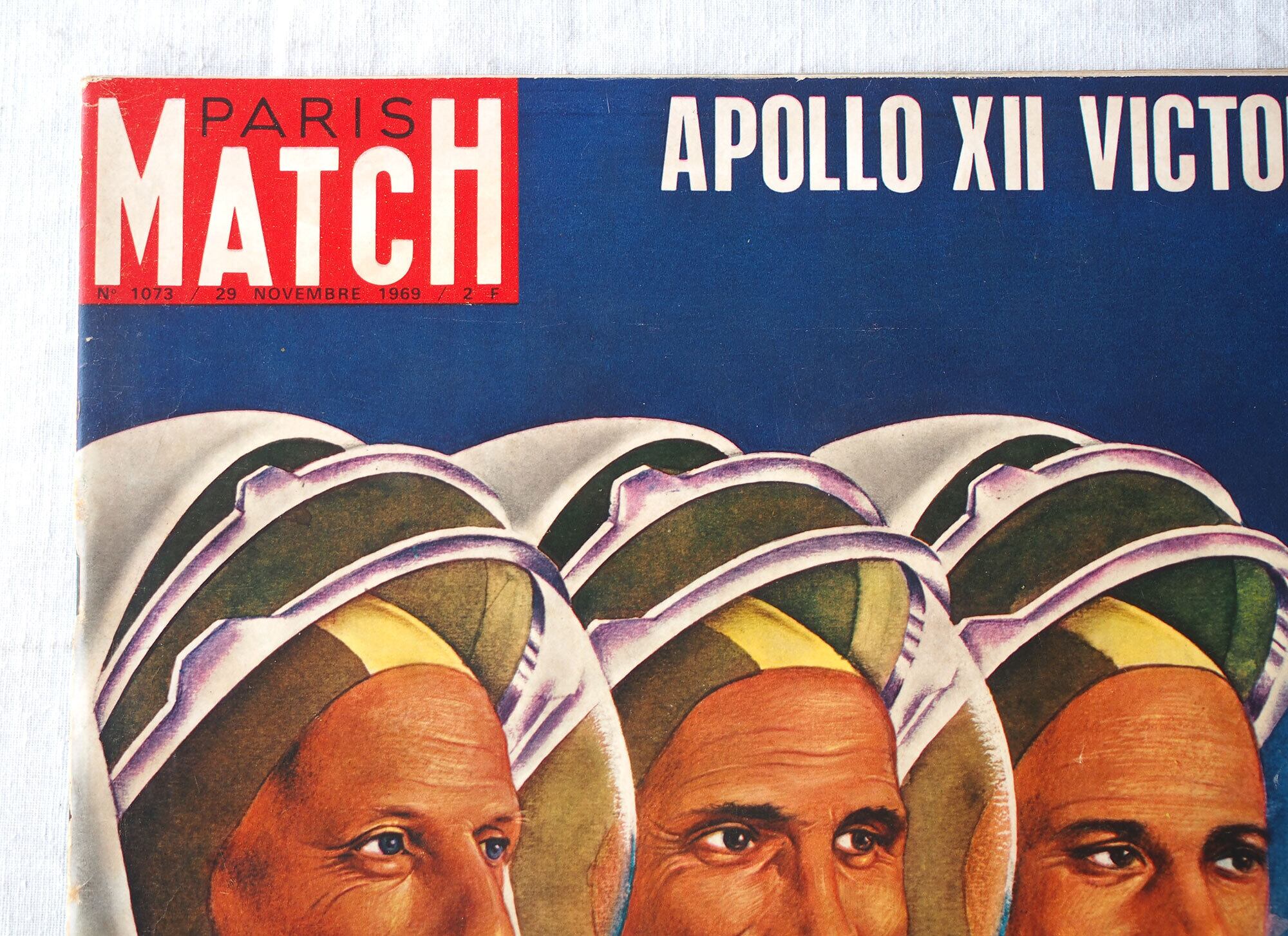 1969年11月29日発行のフランス週刊誌「Paris Match」。本号はアポロ12号の成功(人類による月探査ミッション)を特集した歴史的な一冊で、宇宙開発黄金期の空気を伝える貴重な資料です。他にケネディ家に関する記事や、モナコ公妃グレース・ケリーとレーニエ大公の社交界の様子も掲載されており、当時の政治・王室・文化を一度に楽しむことができます。他にも小澤征爾、マイルス・デイヴィス、シャガールなど。様々な広告、写真などあり資料としてはもちろん、インテリアやコレクションとしてもおすすめです。経年によるヤケ、スレ、角の傷みなどが見られますが、ページの欠損はみあたりませんでした。(詳細は画像をご確認ください)参考資料、リメイクなどにどうぞ。