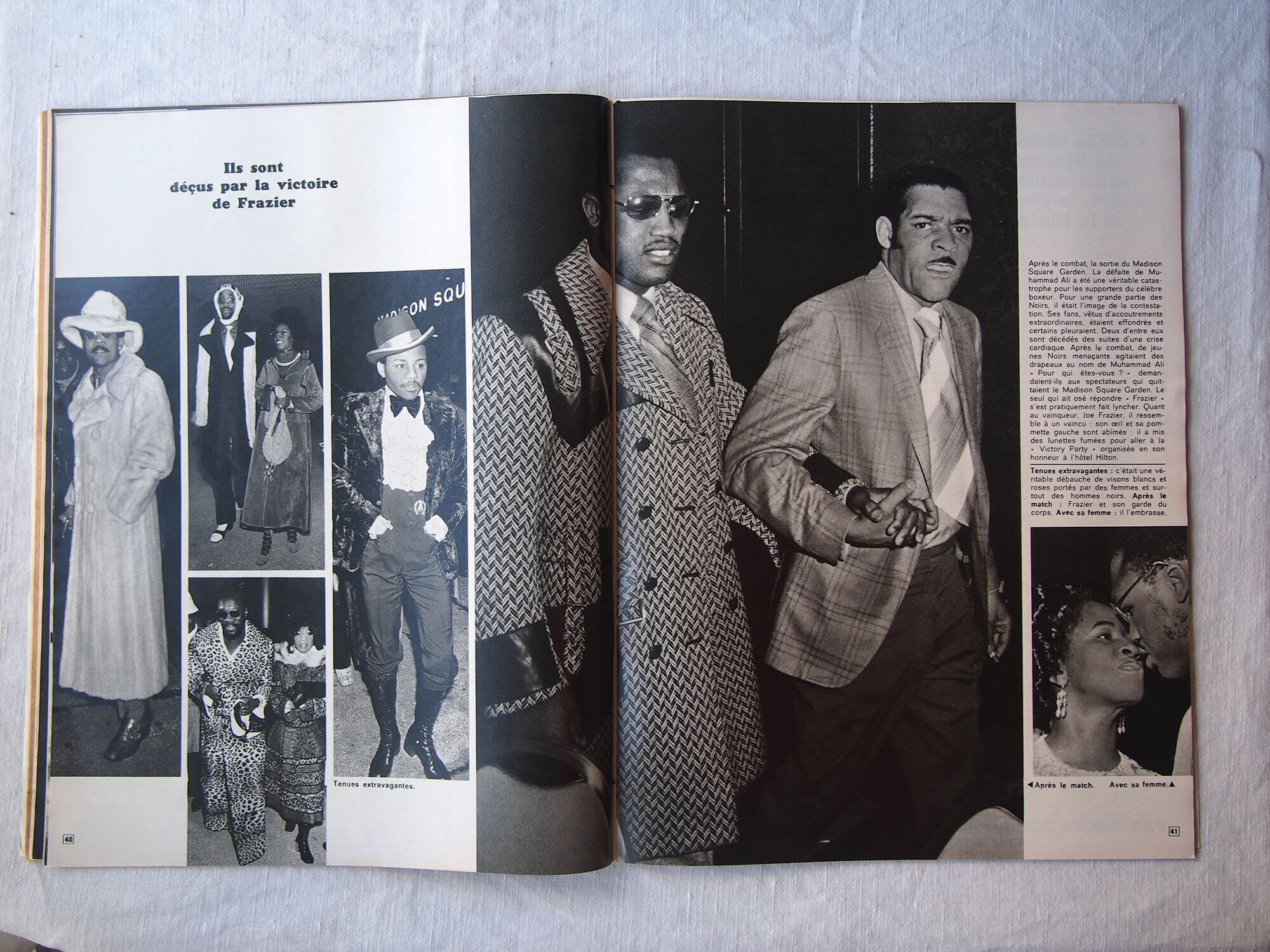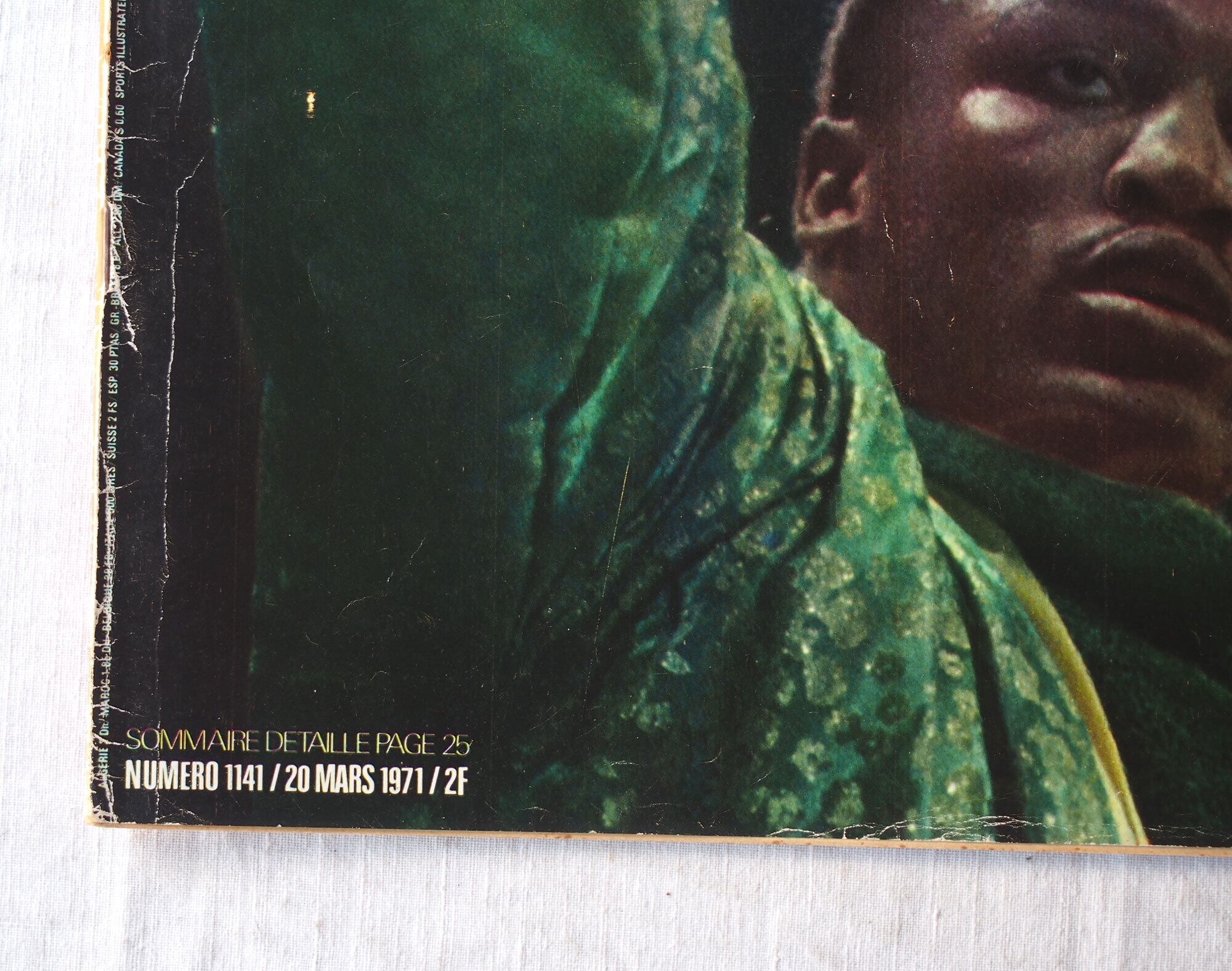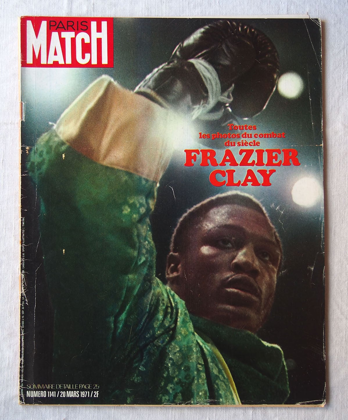 1971年3月20日発行のフランス週刊誌「Paris Match」。ボクシング史に残る名試合「フレージャー vs アリ(当時カシアス・クレイ)」を特集した一冊で、“世紀の一戦”として知られる歴史的試合の貴重な資料です。他にもファッション記事や様々な広告、写真などあり資料としてはもちろん、インテリアやコレクションとしてもおすすめです。経年によるヤケ、スレ、角の傷みなどが見られますが、ページの欠損はみあたりませんでした。(詳細は画像をご確認ください)参考資料、リメイクなどにどうぞ。