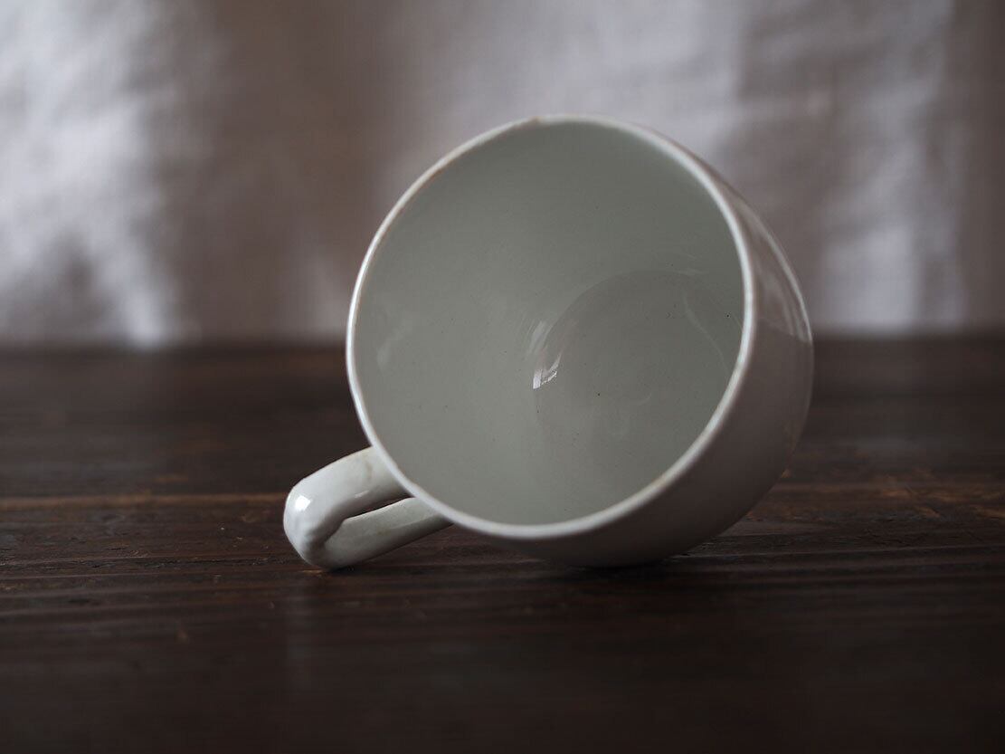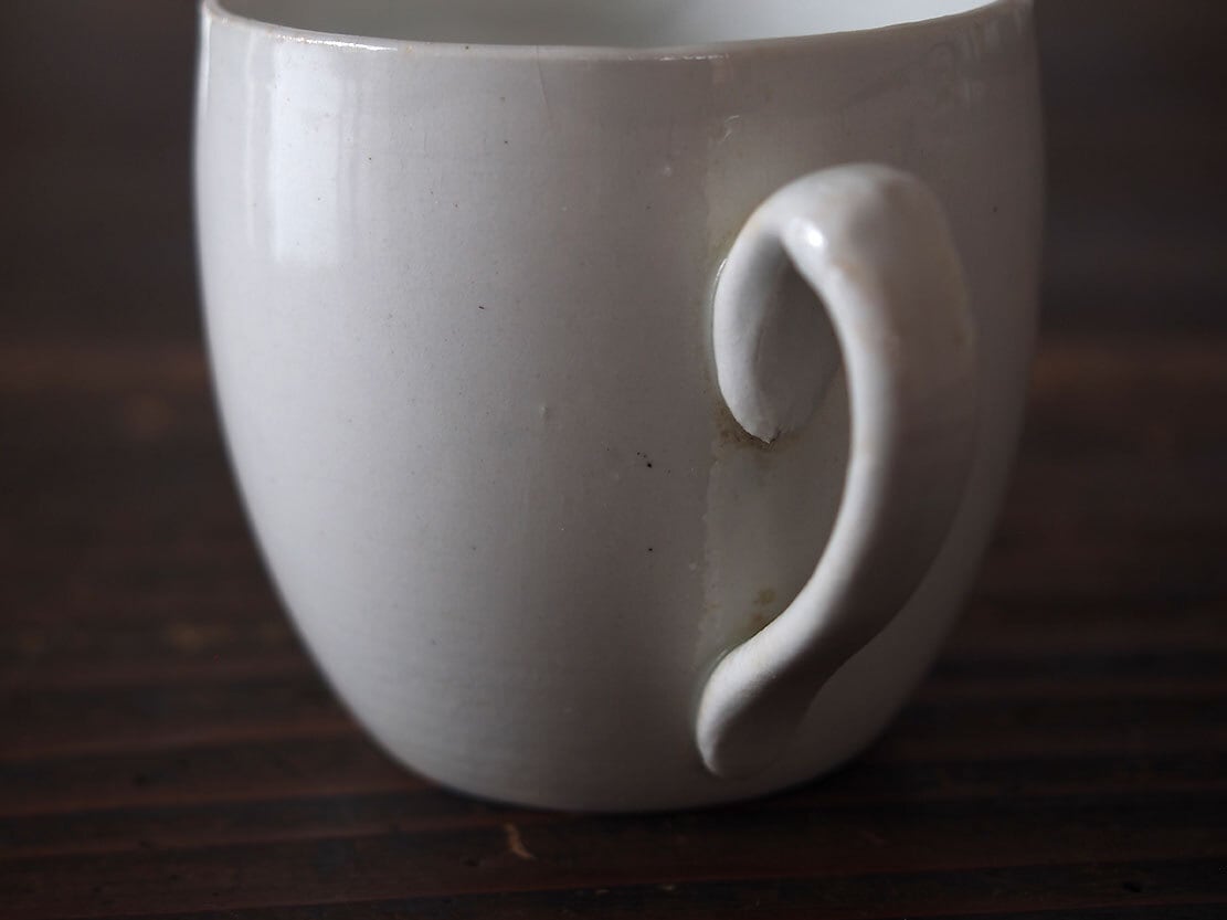 ヨーロッパの蚤の市で入手。1910年代ぐらい。おそらくスペイン、セビージャの陶器。すっぽり手になじむ小ぶりのカップ。ご覧のようにハンドルの側の縁に欠けのように見えますが、釉薬がかかっているので製造時にできたものです。歪み貫入などあります、写真でご確認いただけます。
