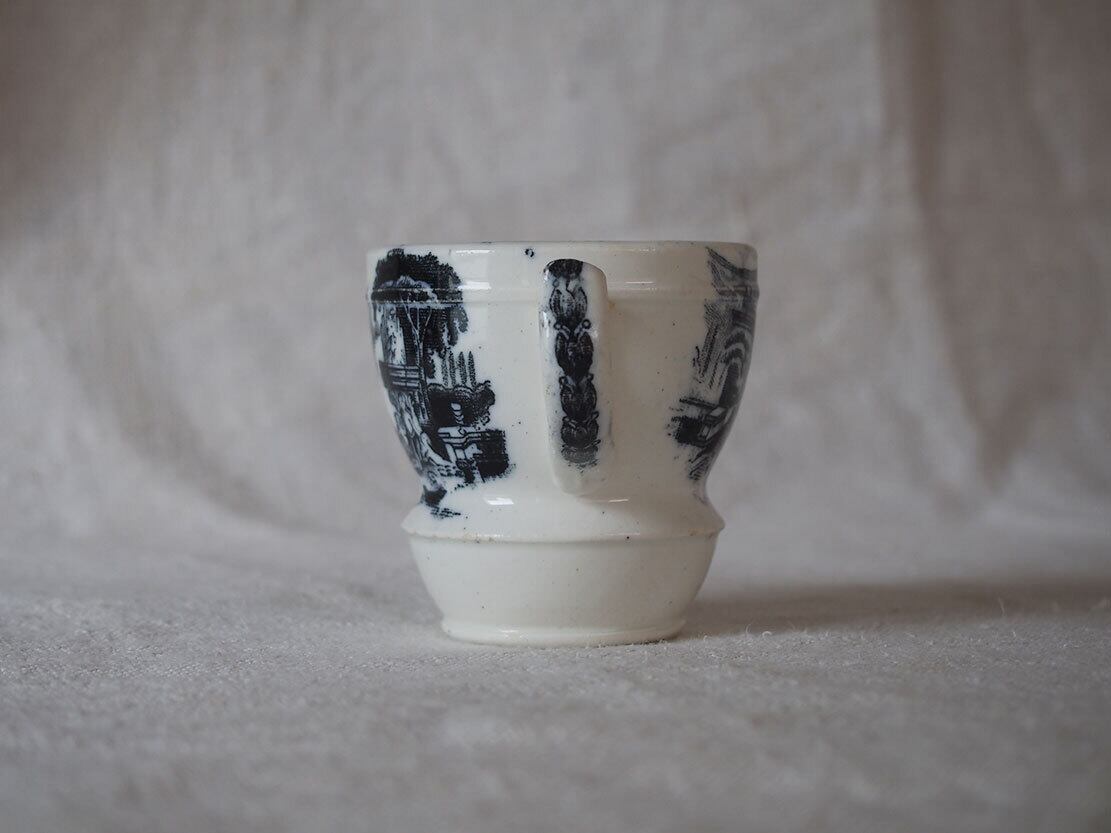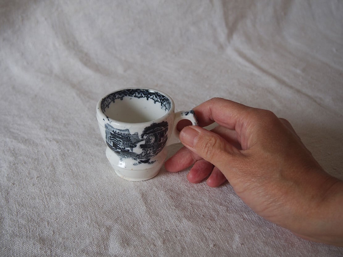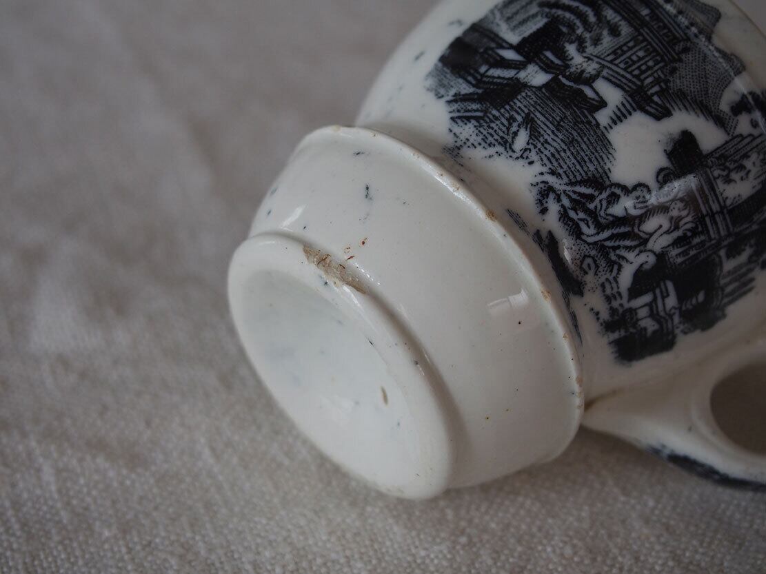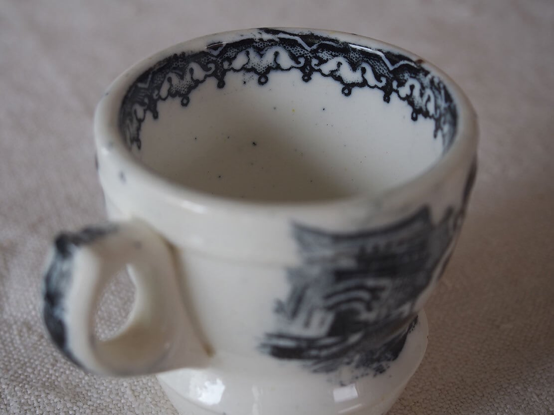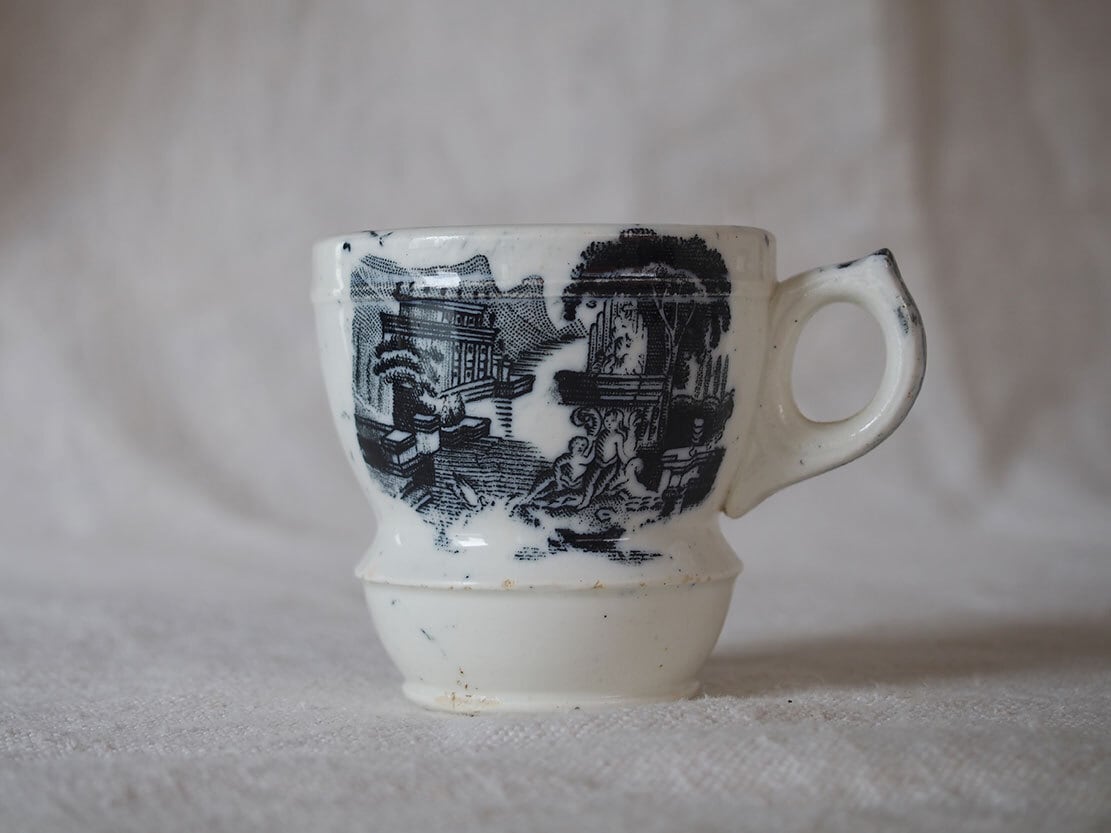 ヨーロッパで入手。ブラック・トランスファーウエァのカップ、19世紀後半〜20世紀初頭頃、スペインで作られた転写絵付けの陶器カップ。1841年創業、英国人のピックマンによってセビリアの修道院を利用して作られたスペインの古陶。1800年初頭に英国からの膨大な陶器製品のスペインへの輸入を禁止されたのち、スペイン国内で生産するために英国から多数のマイスターが派遣され指導したと言われています。水辺の館と水鳥、男女の紋様。底に小さな欠けがあります、写真でご確認いただけます。コレクション、実用にもいかがでしょう。