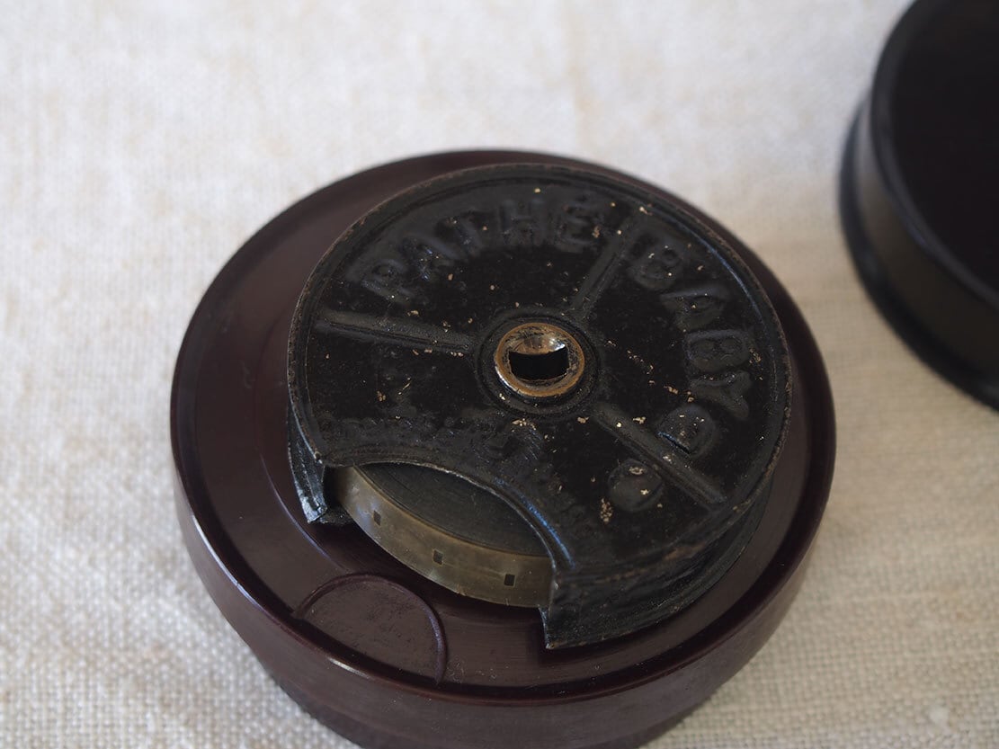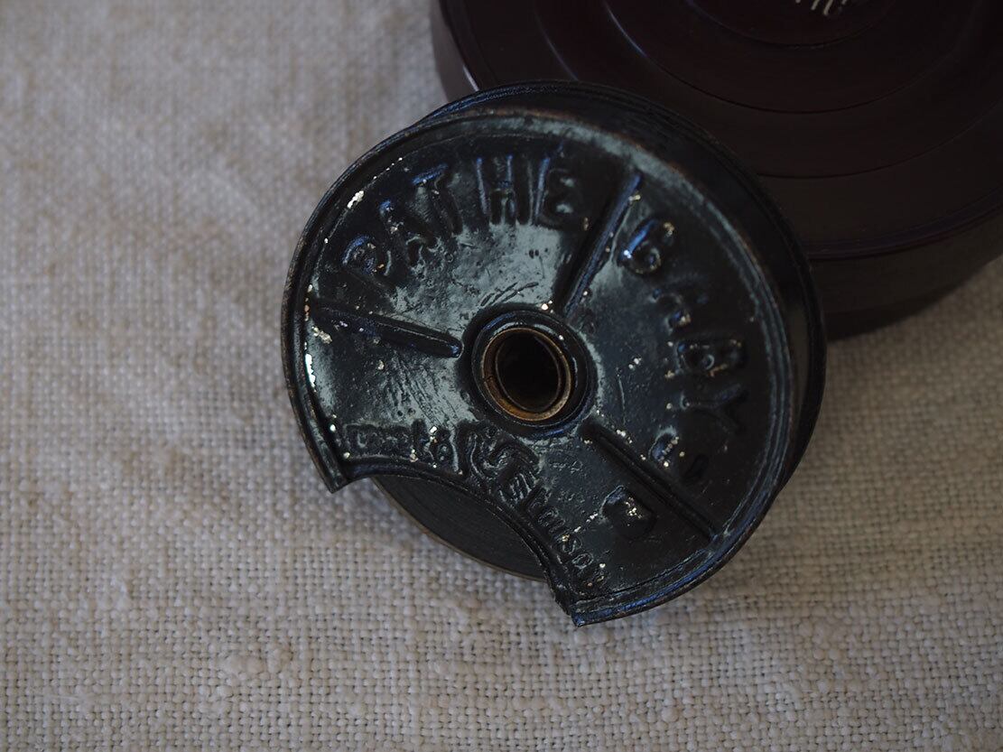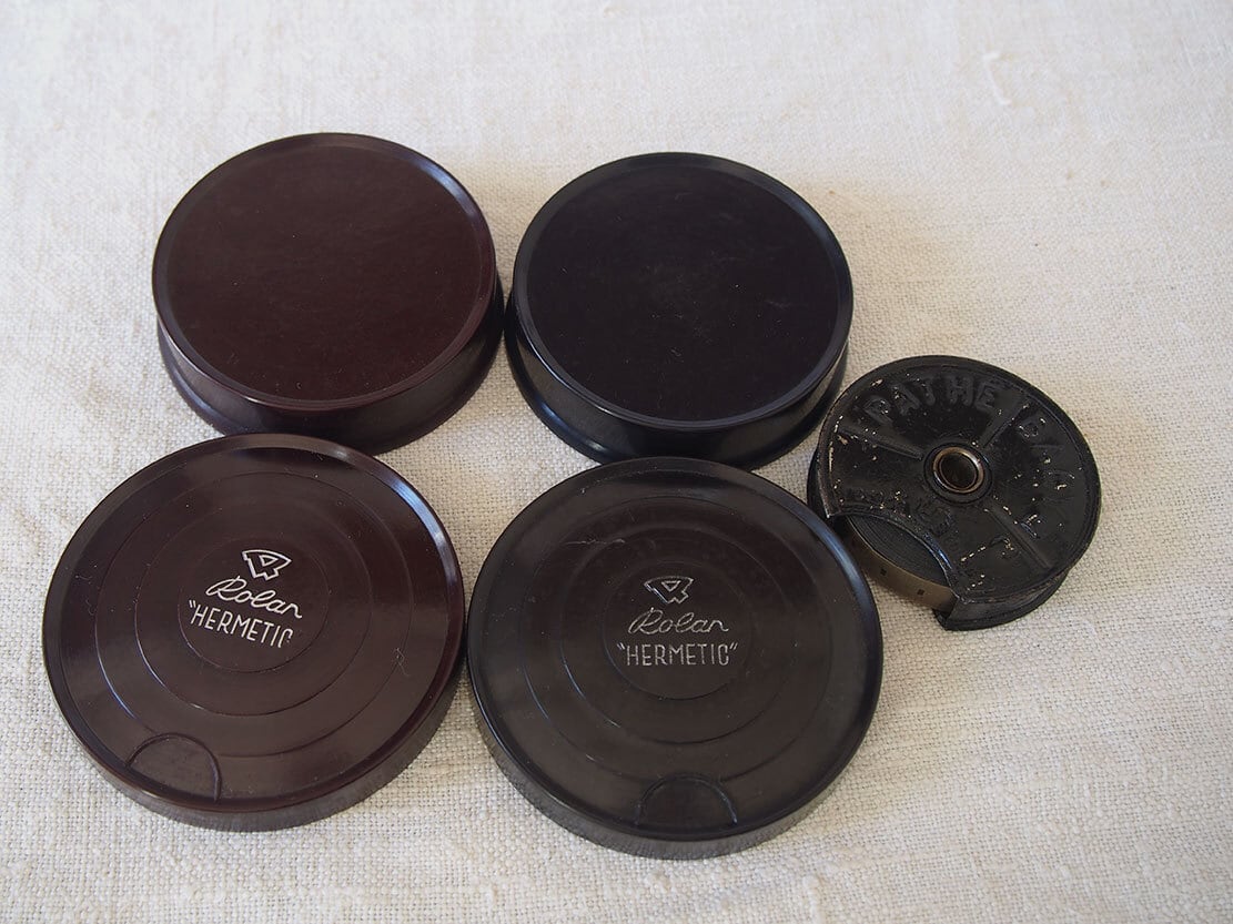 ヨーロッパの蚤の市で入手。1950年代ぐらい。ヴィンテージのタイプライター用インクリボンケースです。ベークライト製と思われる重厚感のある素材で、「Rolan “HERMETIC”」の刻印があります。2点同じものですが、色が若干異なります。シンプルなデザインで、工業系・デスク周りのコレクションとしても魅力的なアイテムです。片方の中にフランス Path社の家庭用フィルム「Path Baby」(1920年代〜30年代)用リールが入っていました。コレクションやディスプレイ、資料用途に。が入っていたので、そのままお譲りします。ケースは2個セットでの出品となります。写真参照。コレクションにいかがでしょう。