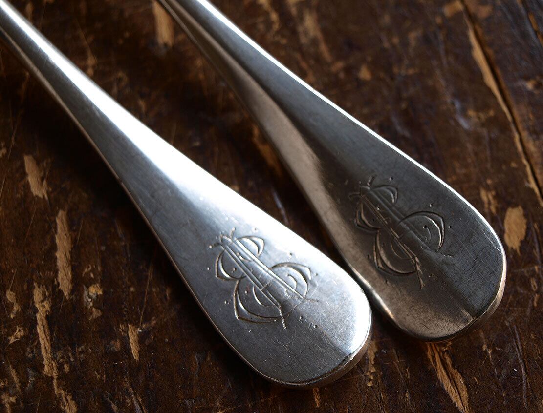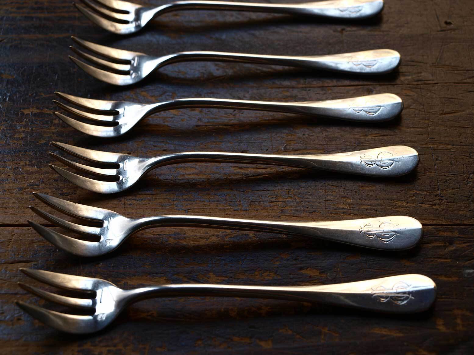 ヨーロッパのアンティーク市にて入手。1920年前後。ケンタウロスのホールマークあり、フランスのクリストフルと並ぶ銀食器メーカーエルキュイ ERCUISのカトラリー6本。多少の小さな傷程度はあります、写真をよくご覧ください。