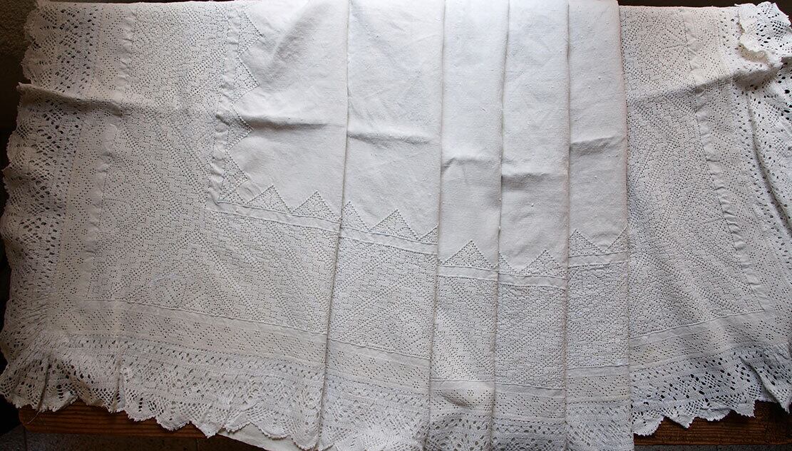 手刺繍とニードルレース シーツ幅240cm×長150cm ドロンワーク ベッドカバー シャンブル リネン ベッドリネン フランス アンティーク/ G955