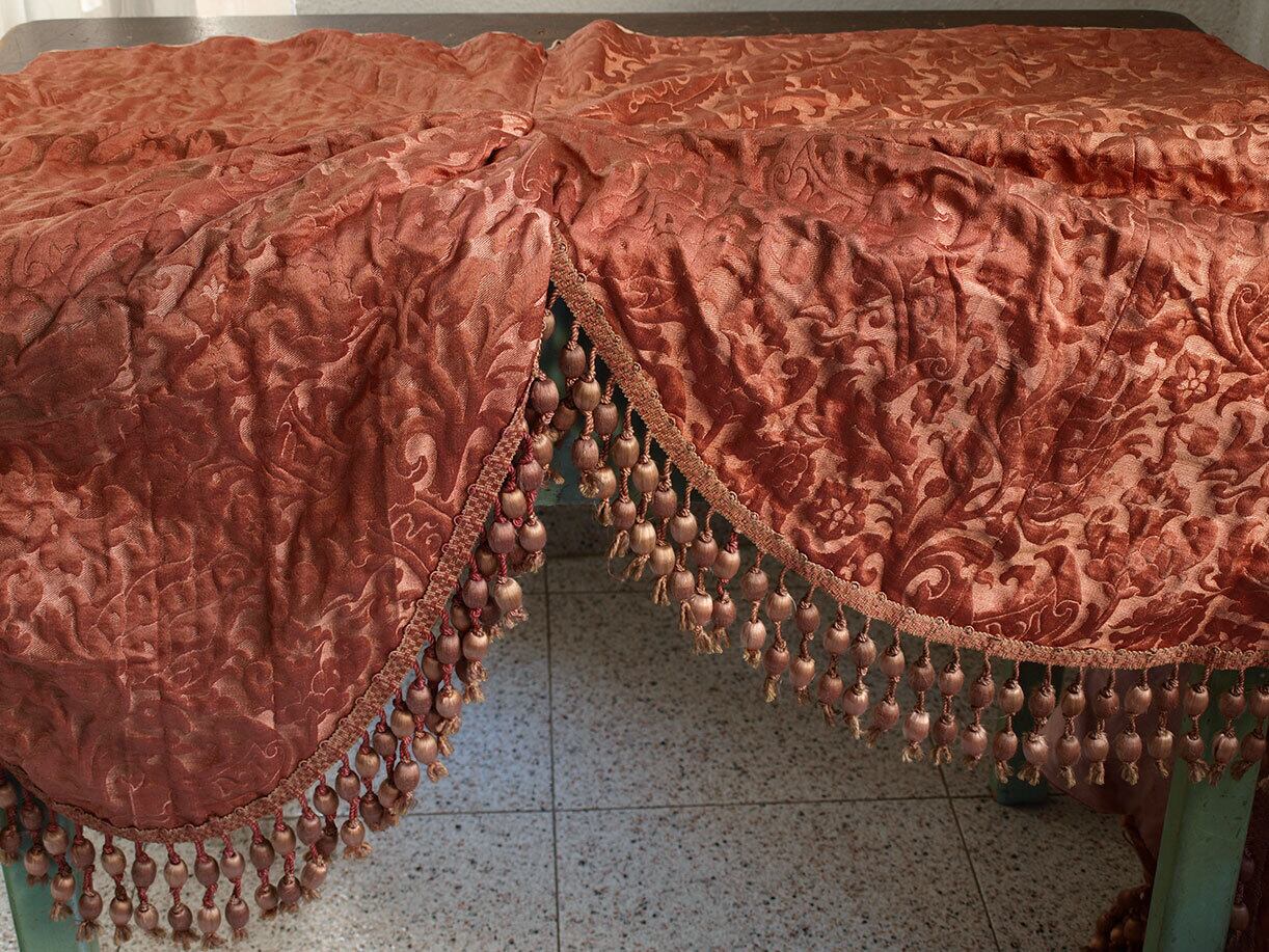 ヨーロッパのアンティーク市にて入手。1930年前後。少しオレンジ系のくすんだピンクのジャカードカーテンバランス。綿の裏地あり、手縫い、一部ミシン利用があるかもしれません。両脇の垂部分:幅42cm, 長93cm(フリンジ10cm含)、中央:幅77cm, 長77cm(フリンジ10cm含)。ドレープの谷になった部分に薄汚れあり。実用可能だと思います。 陰干し程度の手入れしてあります。昔の生地です、家庭での洗濯はお勧めしません。参考資料、リメイクなどにどうぞ。古いテキスタイルは埃や特有の匂いが有る物があります。そのようなコンディション、古布にご理解のある方、手入れの手間を惜しまない方のご入札をお願い致します。 参考資料、リメイクなどにもどうぞ。アンティーク衣装、ファブリックを得意としています、他の商品も是非ご覧ください。