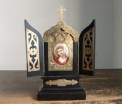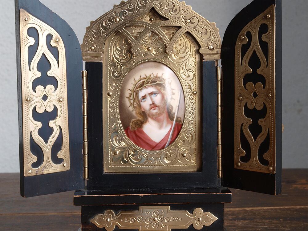 ヨーロッパのアンティーク市にて入手。「Ecce homo エッケ・ホモ この人を見よ」のスーベニールのフレーム。旅行などに持参した礼拝堂。黒木の枠に細工を施した真鍮のプレート、中央には磁器に手描きのプレート。向かって右の扉が左と同じように開きません。木製部分に傷などあります。磁器プレートにはヒビや欠けなどなく良い状態。Ecce homo の礼拝堂は今回初めての入手です。お見逃しなく。
