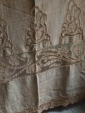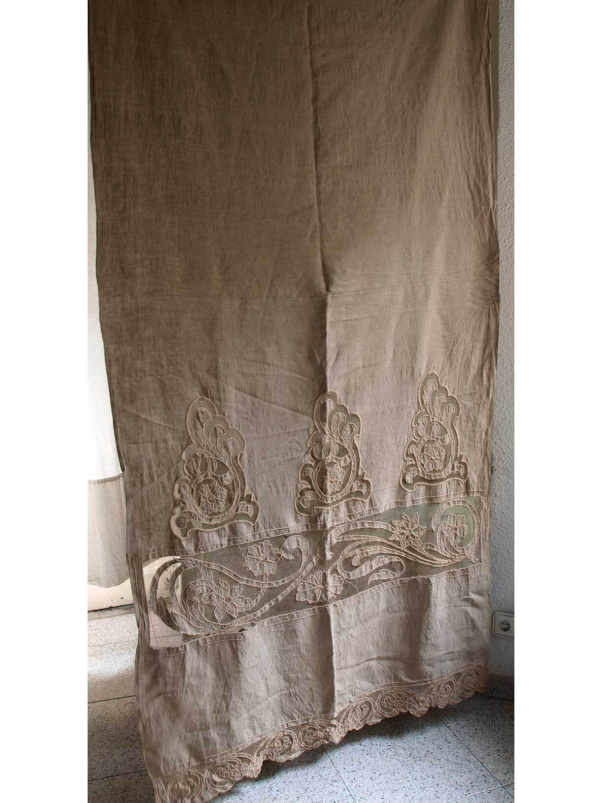 ヨーロッパのアンティーク市にて入手。1940年前後。サンドベージュのリネンのカーテン。上三つ折り、裾から柄部分12cm、無地31cm、三角の柄部分64cm、合計裾から110cmまで柄。右角、上37cm×69cmにシミあり。洗濯済み。参考資料、リメイクにもどうぞ。ファブリック、衣装、手芸関連を得意としております。他の商品も是非ご覧下さい。