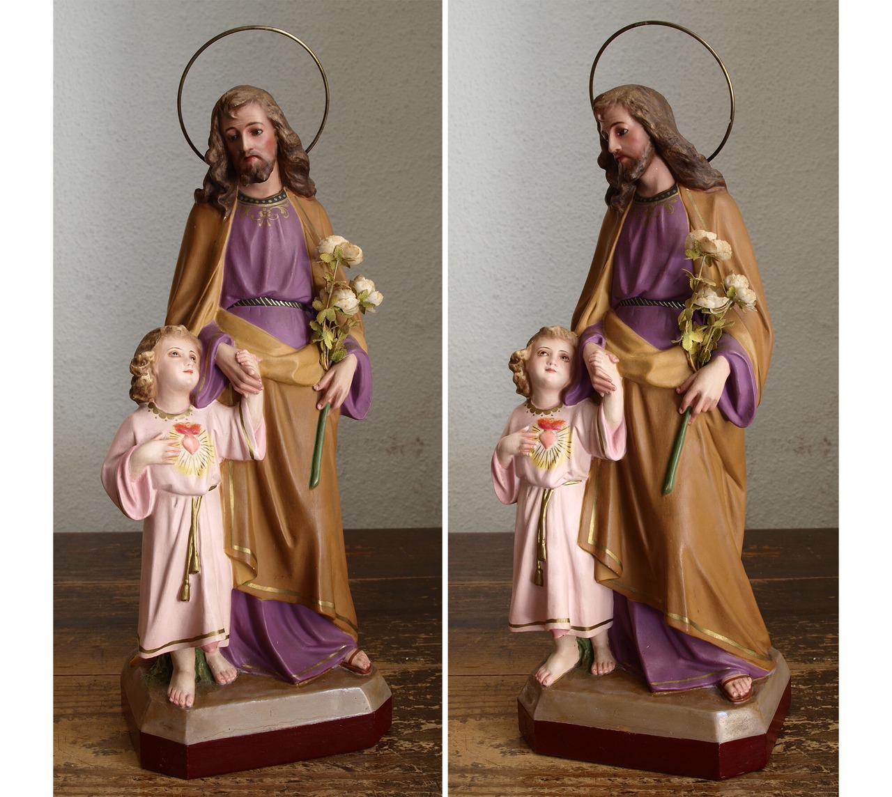 幼子イエス、聖ジョセフ共にグラスアイ。イエスはぷっくりとしたほっぺにつぶらな瞳をしています。修理箇所無し。小さなキズ、塗装のハゲや薄汚れ程度はありますが修理箇所のないおおむね良い保存状態。 バックスタンプ有り、18世紀より秀作を数多く欧州各地に送り出したスペイン/オロットの物。特に古いと言われる工房のマルタ十字のスタンプあり。破損防止のため光輪を取り外してお送りします。聖ジョセフ(ナザレのヨセフ)祝日:3月19日。教会、父親、大工、旅人などの守護聖人。