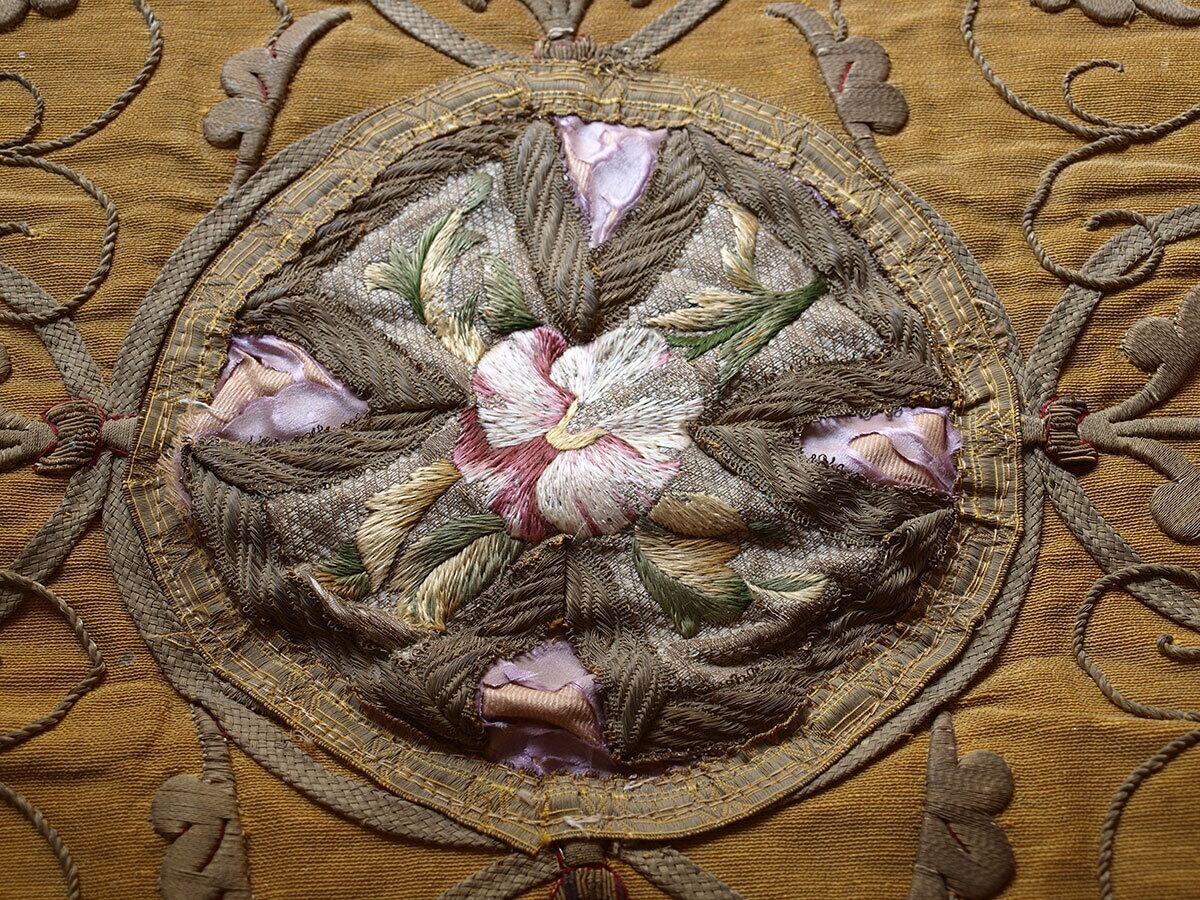 ヨーロッパのアンティーク市にて入手。 欧州のアンティーク市で入手した手刺繍のタペストリ。 金属糸のブレードを用いて立体的な刺繍。中央にはパンジーの手刺繍。