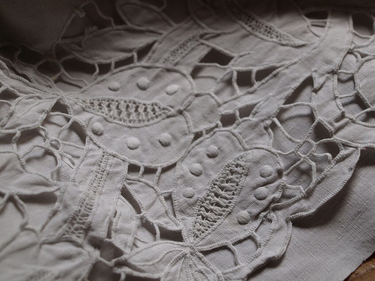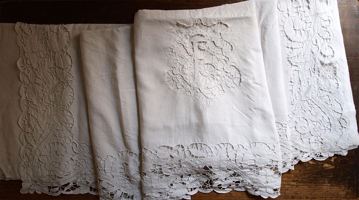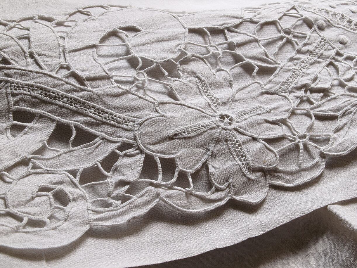 豪華なカットワーク刺繍のベッドシーツ1910年ぐらい? 手刺繍は上部端周囲コの字型に幅15cm、両端92cmまでとかなり長くまで施されています。刺繍部分を表に折り返して使います。手刺繍はアルファベットEF、20cm×25cm。特に目立つ醜いダメージはありません。サイズの大きなシーツです。このような豪華なシーツは主に贈答用で実用というよりはほとんど使用しないで大切に保管される物でした。家族や親戚の女性たちが集まって皆で作ったりしていたそうです。 シーツとしてご利用頂けるお品です。洗濯済み。1点モノです、量産品ではないので同じ物はありません。昔の手作業をご堪能下さい。参考資料、リメイクにもどうぞ。ファブリック、衣装、手芸関連を得意としております。他の商品も是非ご覧下さい。