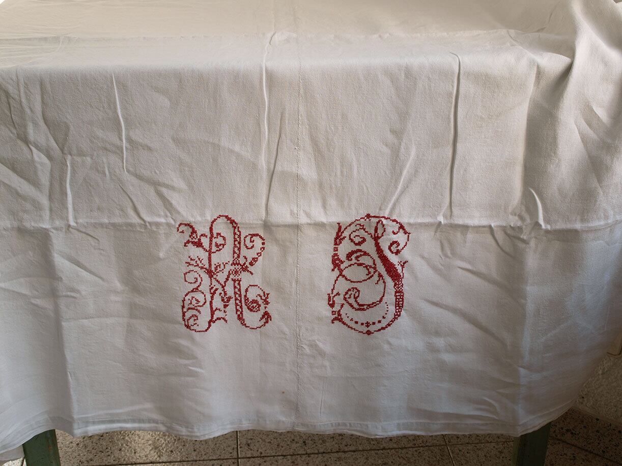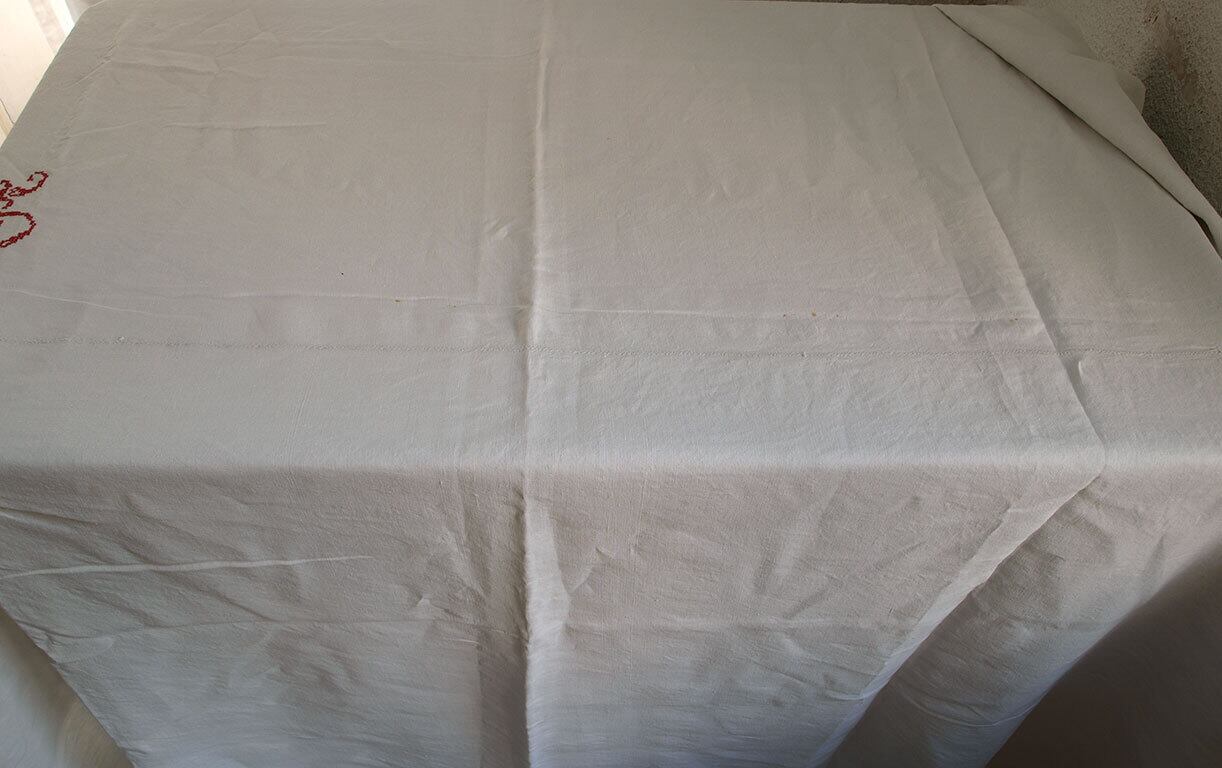 イニシャル クロス刺繍のベッドシーツ AT 190cm×長304cm ホワイトリネン ベッドリネン フランス アンティーク / H134