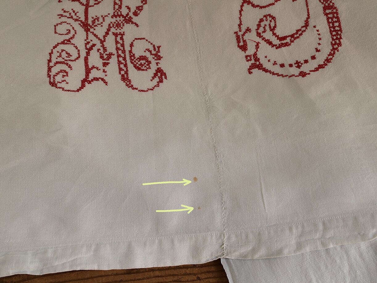 上部端に手刺繍。刺繍部分を表に折り返して使います。手刺繍はアルファベットAT、34cm×20cm。刺繍のそばにごく小さなシミ。広幅織機が普及する以前のものでしょう、2枚の生地を中央で 手ではぎ合わせてあります。 シーツとしてご利用頂けるお品です。洗濯済み。1点モノです、量産品ではないので同じ物はありません。昔の手作業をご堪能下さい。参考資料、リメイクにもどうぞ。ファブリック、衣装、手芸関連を得意としております。他の商品も是非ご覧下さい。