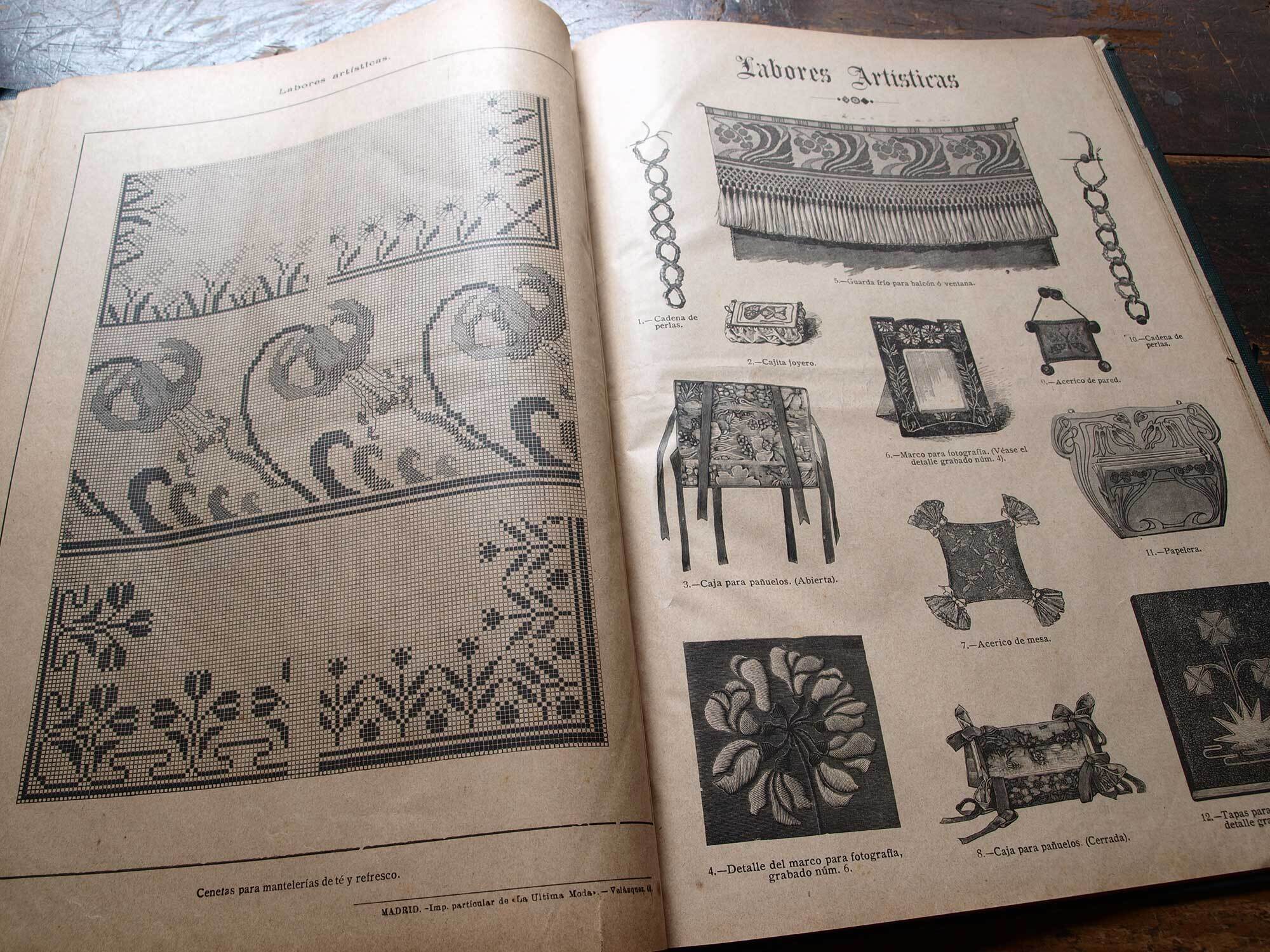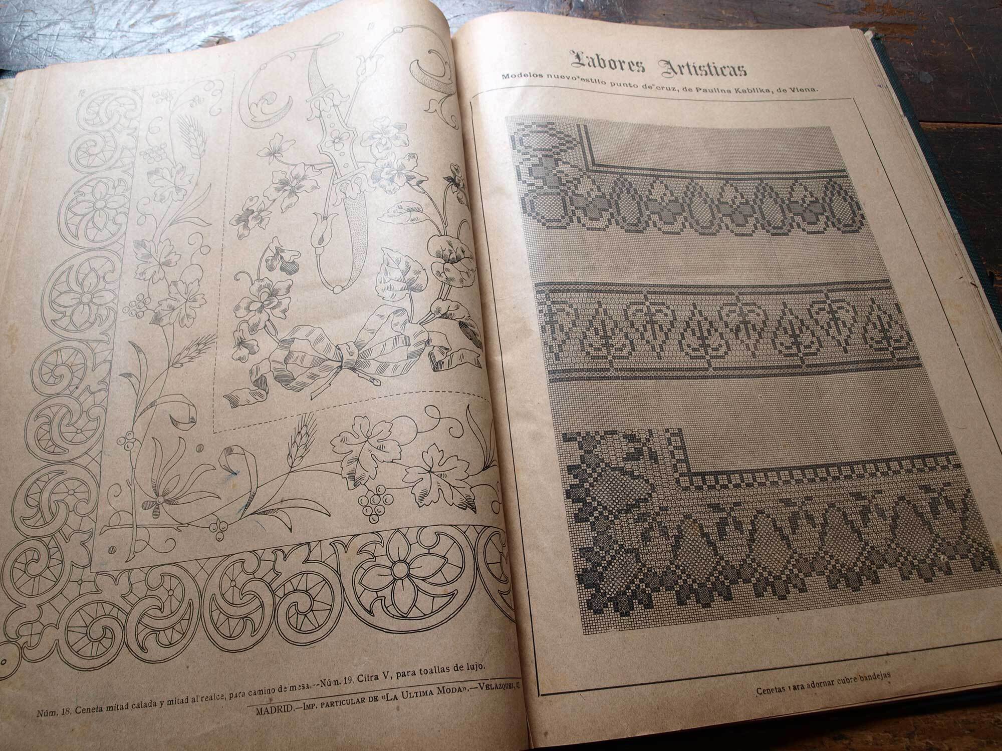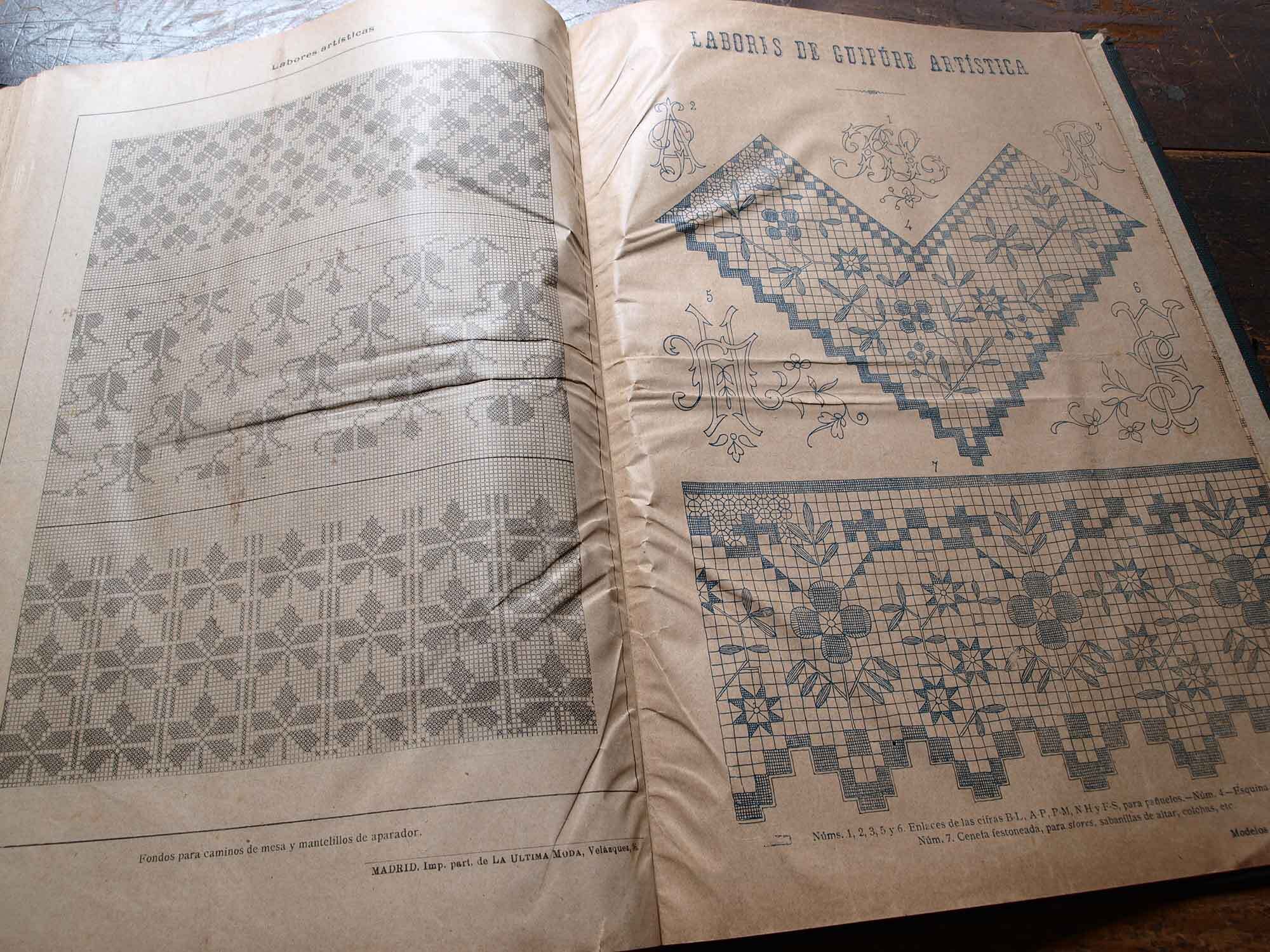 ヨーロッパのアンティーク市にて入手。1899年から1903年ぐらいまでの刺繍とレースの図案集を再編集したもののようです。約206ページ。背表紙に本革、表紙に擦れあり、本編の破れなどはないと思います。参考資料などに。