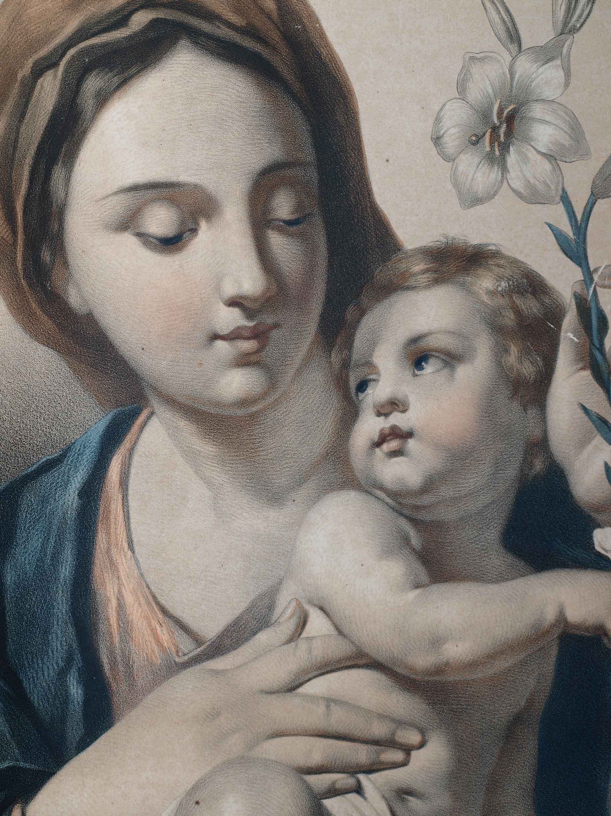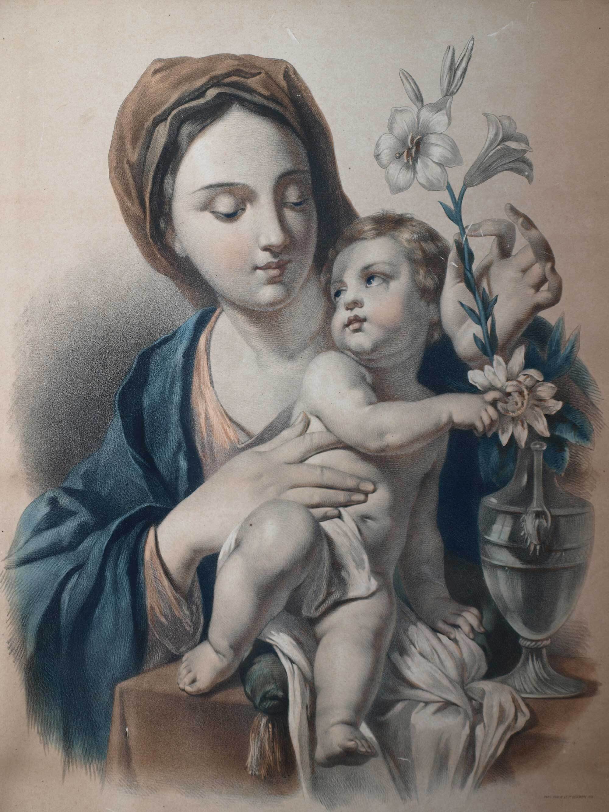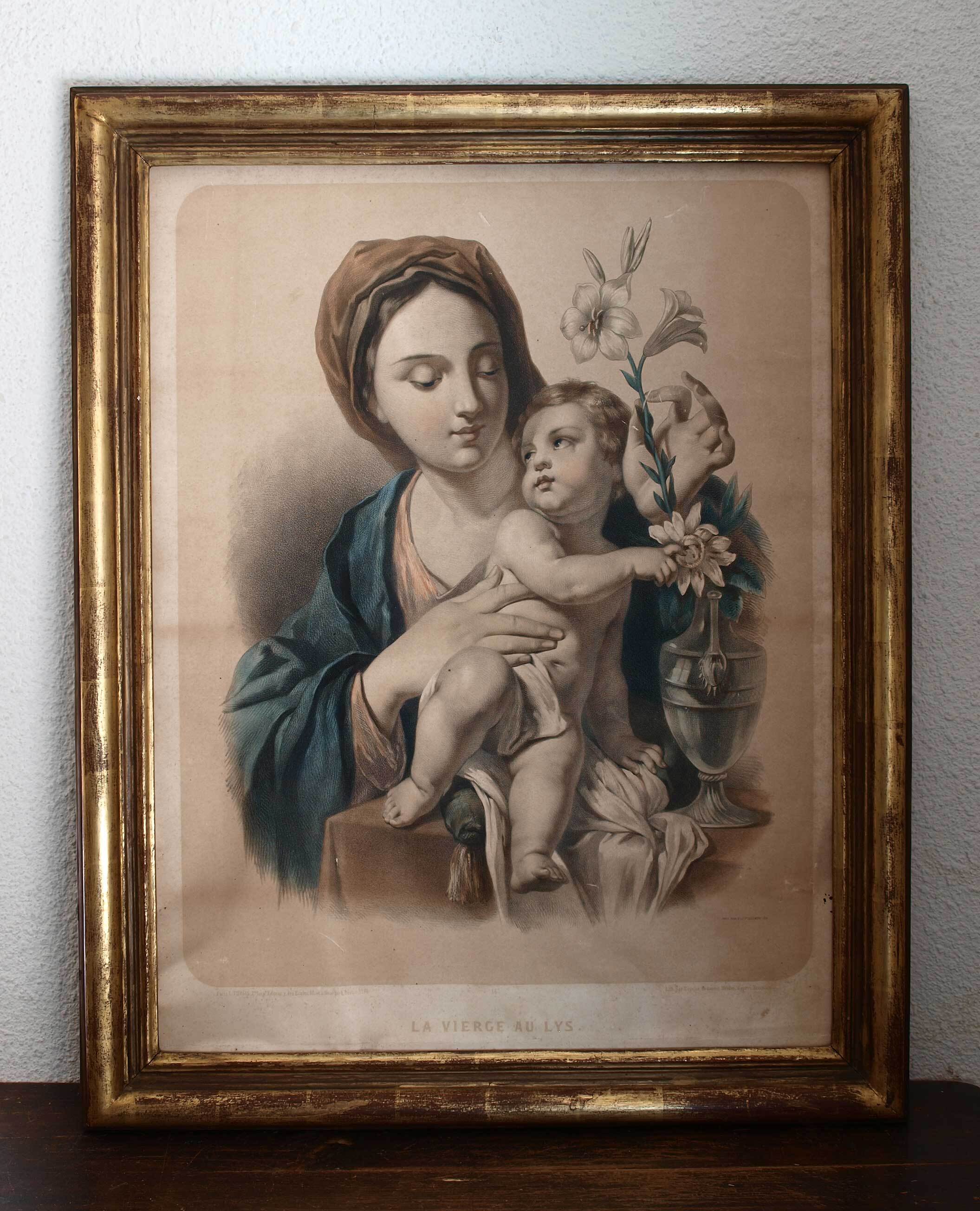 1800年代中期、フランス。 Regnier Bettannier Morlon フランスのの版画作家によるもので、オリジナルはイタリアのロココ初期またはバロック後期の画家フランチェスコ・トレヴィザーニの「百合の聖母」。当時はこのようなリトグラフの人気が高く、カニヴェ等も多数制作されていました。記載されている文字上から「PARIS PUBLIE LE 1er DECEMBRE 1859 / Paris L TURGIS J ne Imp. Editeur des Ecoles. 80, et a New York Duane st 78 / 16 / Lith. par Regnier Bettanier Morlon d'apres Trevisani / LA VIERGE AU LYS」。初版パリ1859年12月、L.Turgis Parisは版元、以下は住所、数字「16」は図版番号、 ガラス板なし、底板あり。リトグラフに傷数箇所あり。他には特に目立つダメージ無し。珍しい物です、この機会をお見逃し無く。