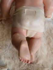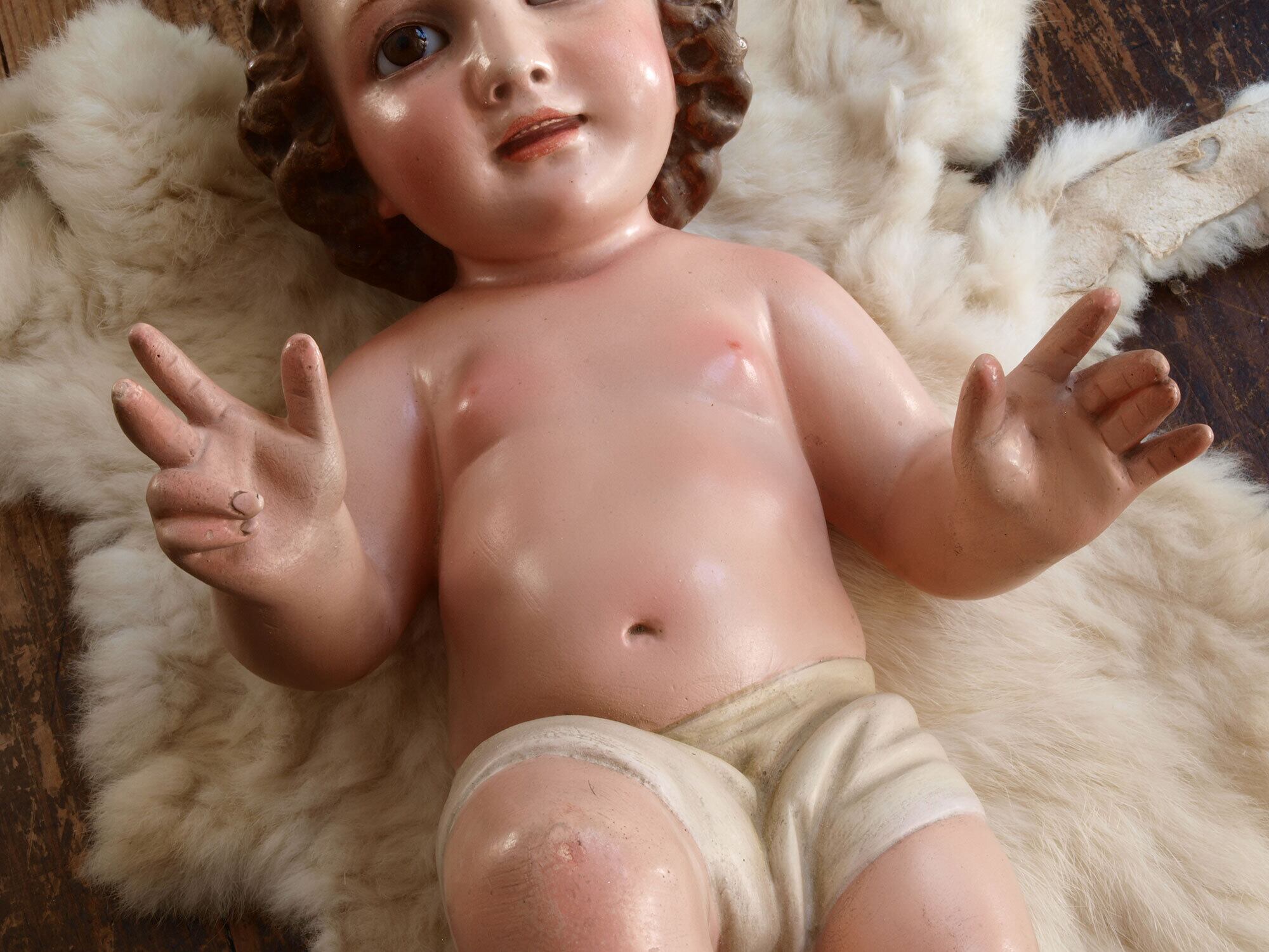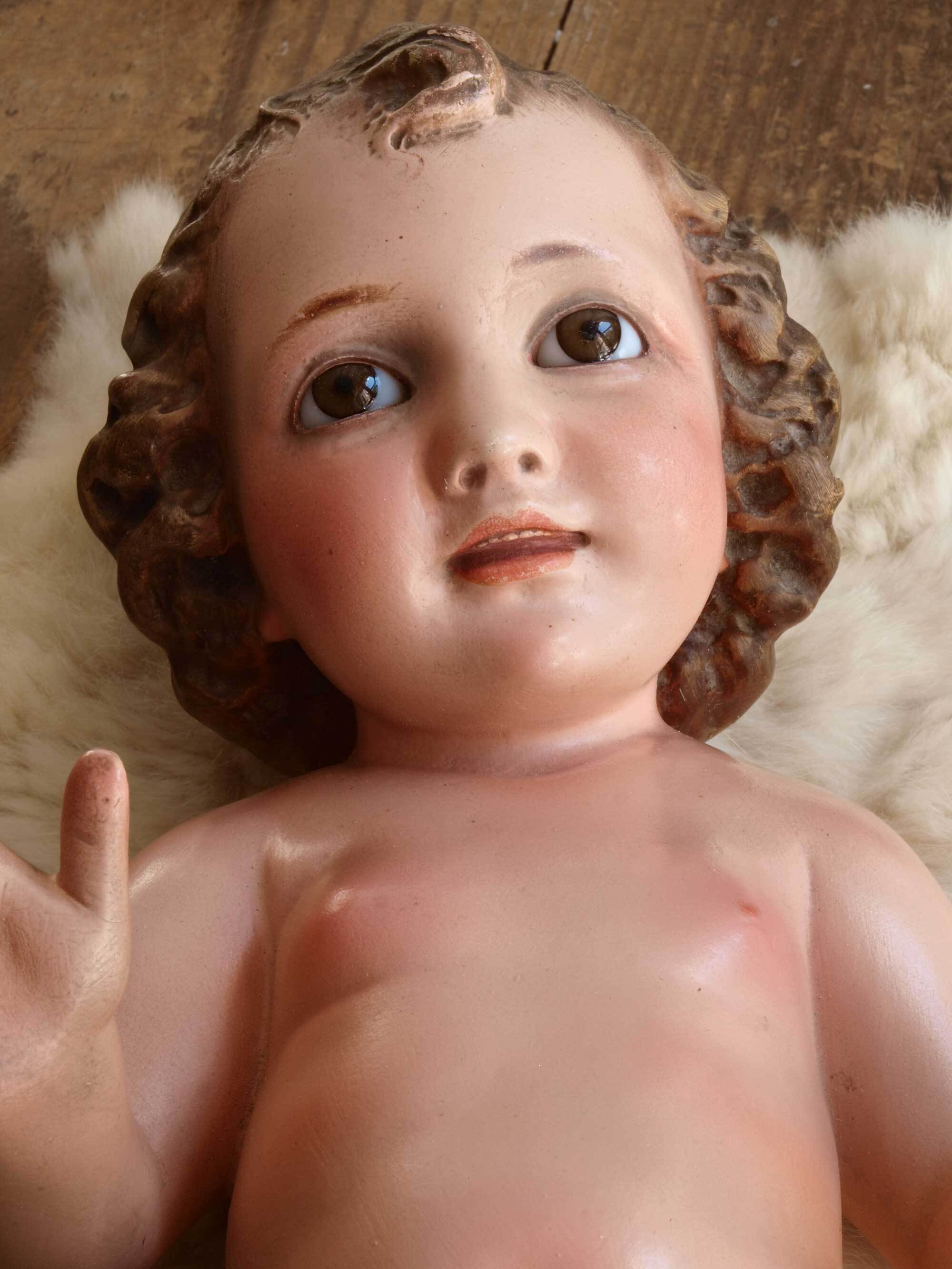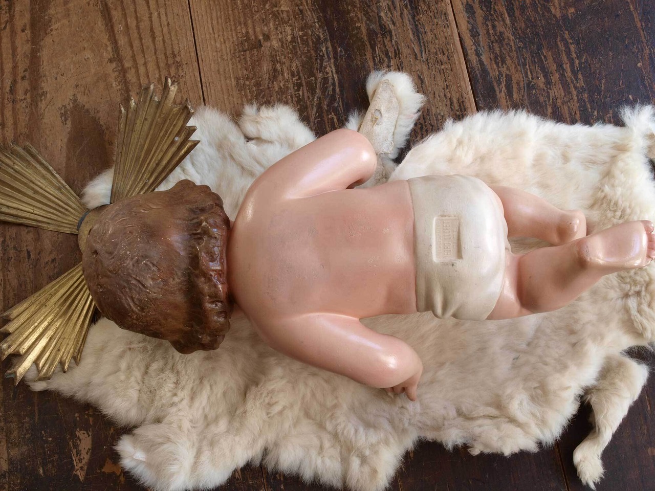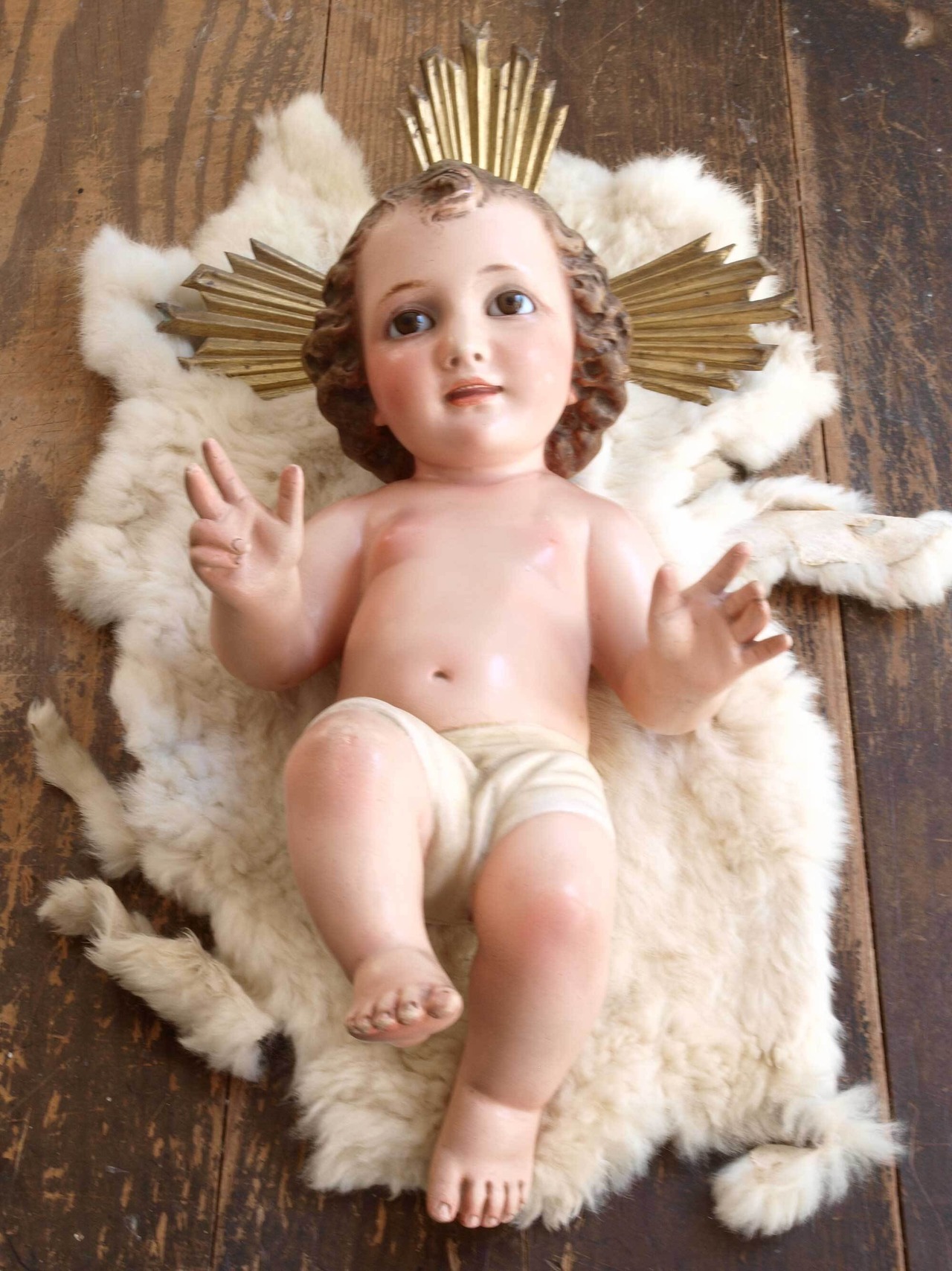 南欧の骨董市にて入手、1950年前後。大きなガラスの瞳の幼子イエス像。大きな瞳。内部は一部空洞。多少の擦れあり。バックスタンプ有り、18世紀より秀作を数多く欧州各地に送り出したスペインの物。大さは光輪の上からつま先まで42cm、本体のみ31cm、光輪22cm×13.5cm。特に目立つ醜いダメージ無し。ラビットファーの敷物付き。この幼子はクリスマスに飾る為の像で、カトリックの信仰の厚い国、特にスペイン、南仏、イタリアではクリスマスにキリスト生誕のシーンをジオラマで作ります。その為の中心となる赤子のイエスの彫刻です。周囲には聖母、聖ホセ、東方の三賢人などが囲みます。