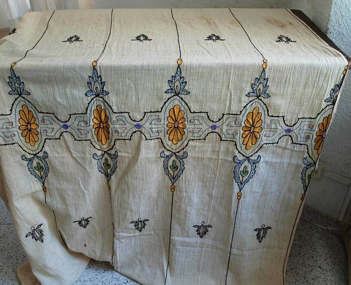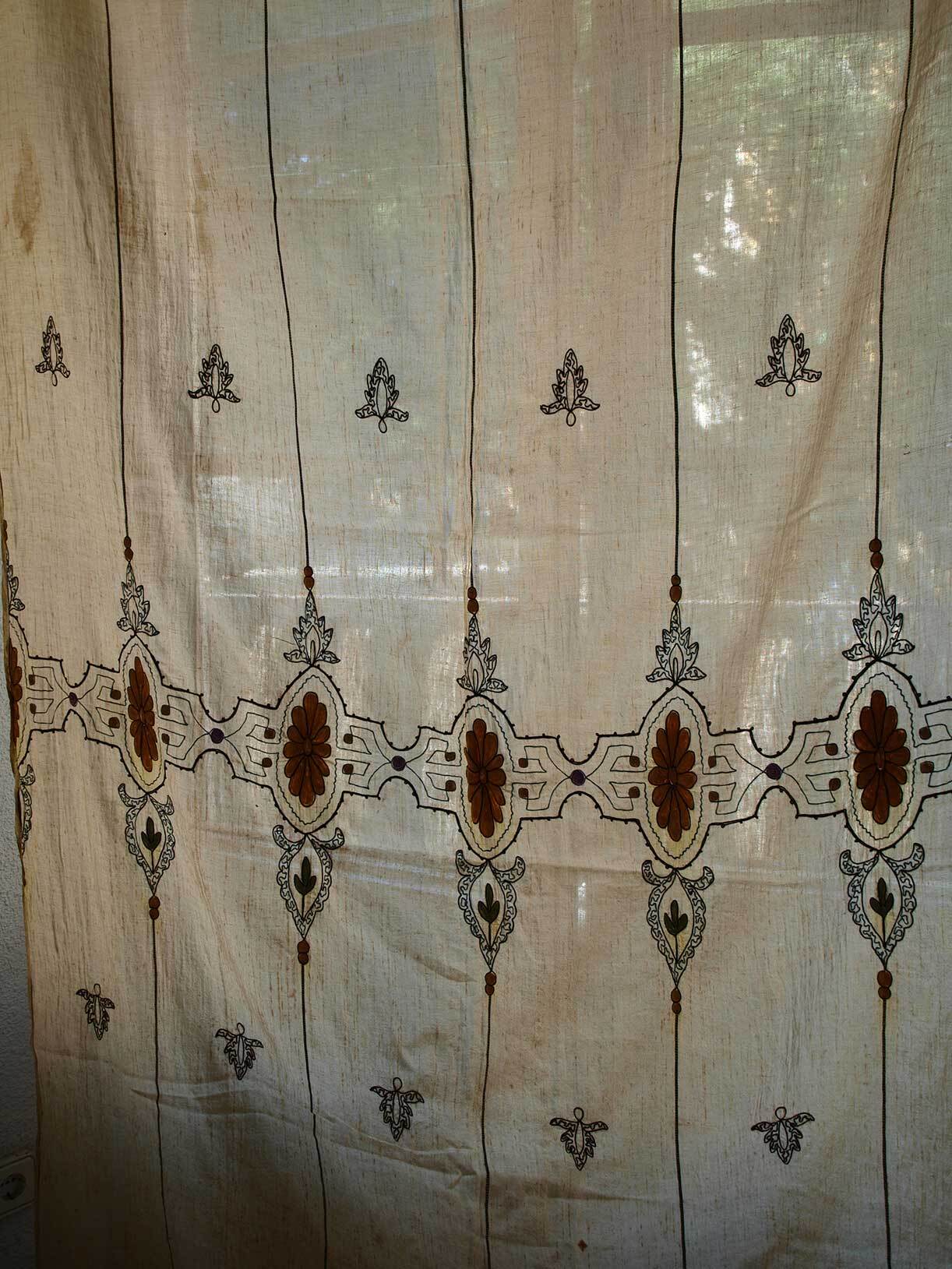 ヨーロッパのアンティーク市で入手、1940年から1960年ぐらい。薄手のコットンにコーネリー刺繍のカーテン。上下縫代三つ折りミシン。主な刺繍部分の寸法87cm。軽く洗濯してありますが、まだシミが残っています、ご家庭で洗濯可能です。ご利用頂けるアンティークです。参考資料、リメイク等にもいかがでしょう。ファブリック、衣装、手芸関連を得意としております。他の商品も是非ご覧下さい。