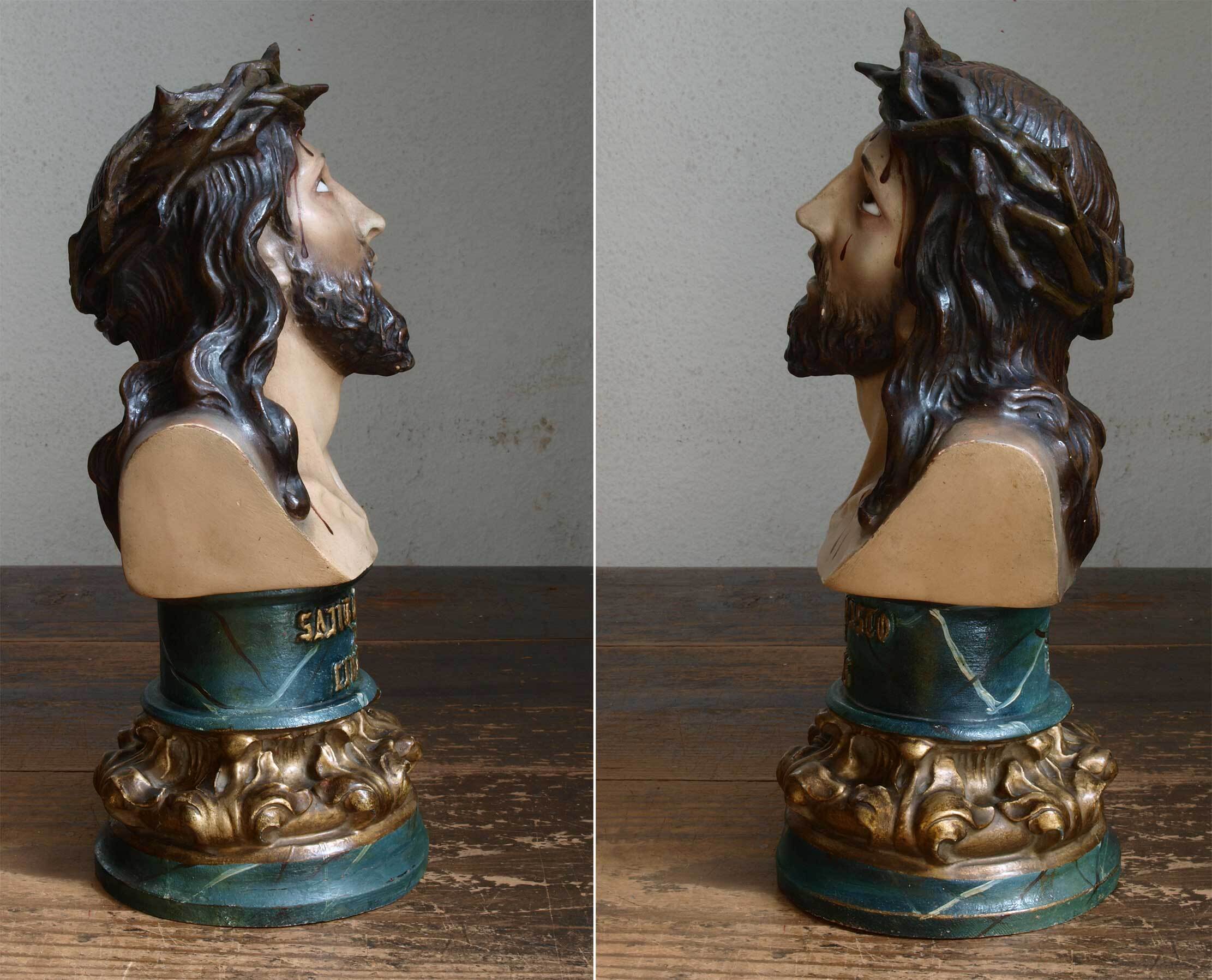 1940年前後。十字架にかけられた際のキリストの胸像。大きなグラスアイ。「リンピアスのキリスト」スペイン北部、カンタブリア州のリンピアスに17世紀初頭に建てられた後期ゴシックとルネッサンス様式の教会に納められている物がオリジナルとされています。イバラの冠は乾燥させた植物で作られています。 バックスタンプ有り、18世紀より秀作を数多く欧州各地に送り出したスペイン/オロットの物。 イバラの冠の刺に修理あり。日本では見られない様な珍しい古い聖人像を多数取り扱っています。1点1点工房で手作りされた像です、同じ物は一つとありません。この機会をお見逃し無く。