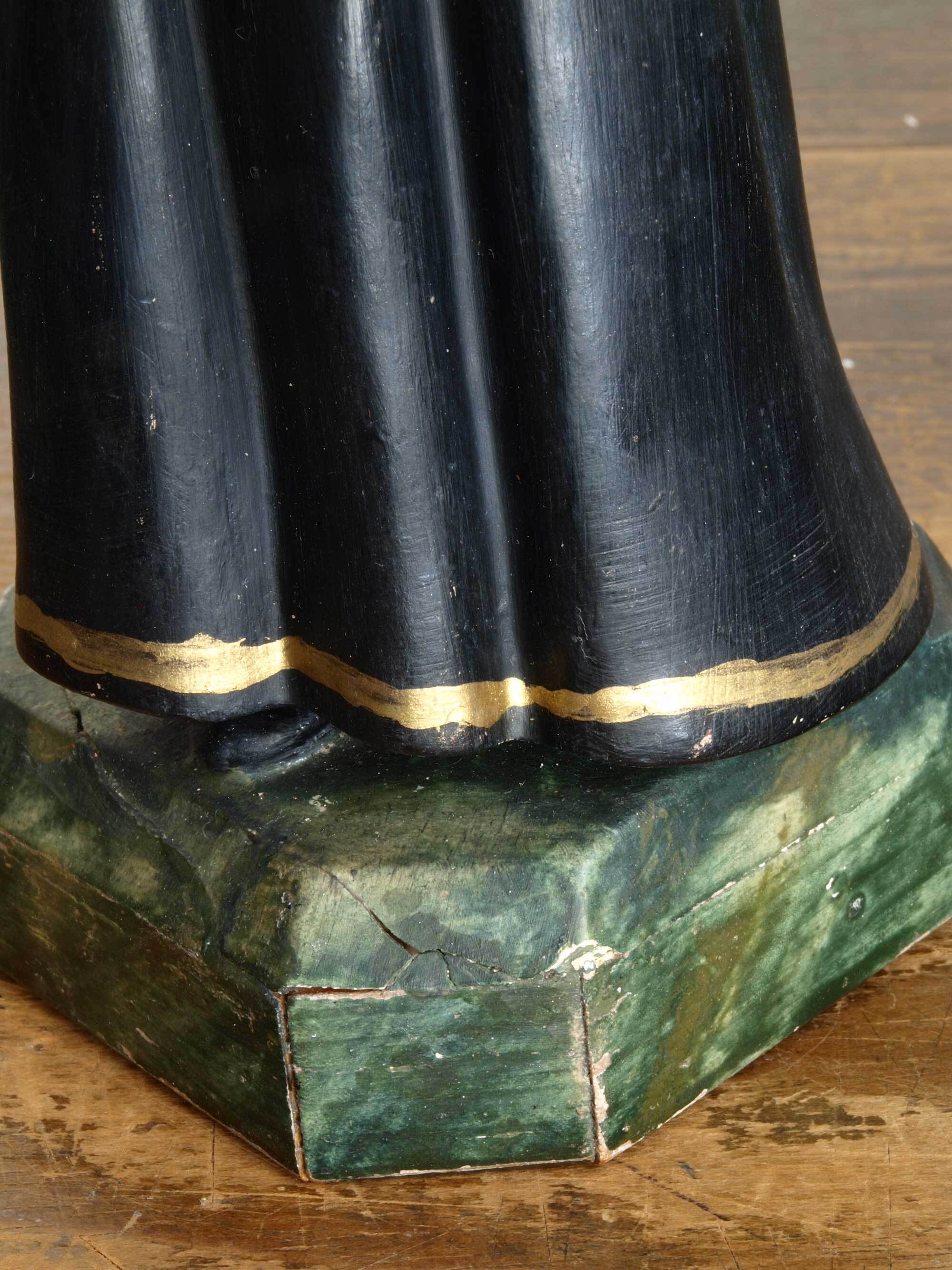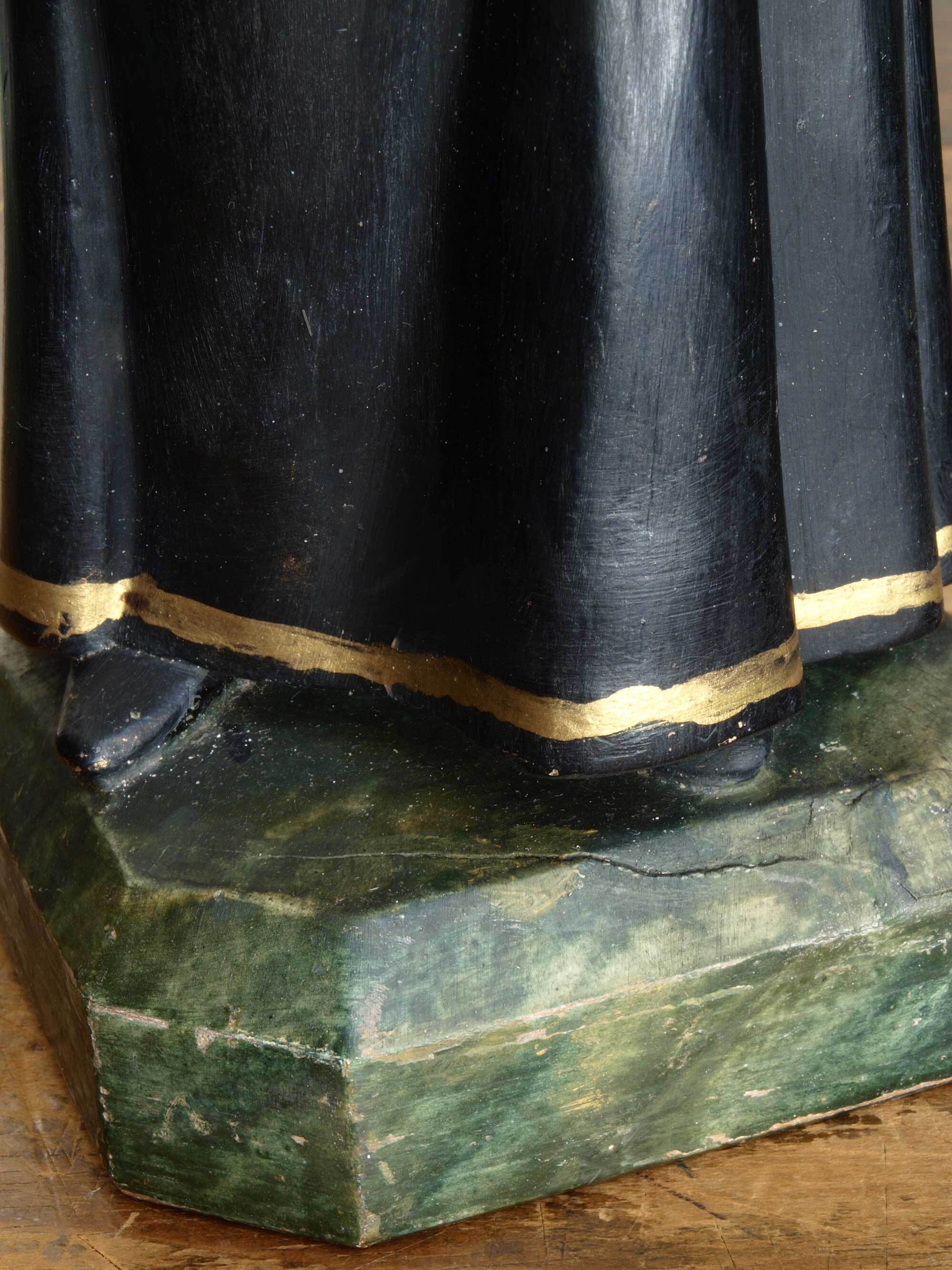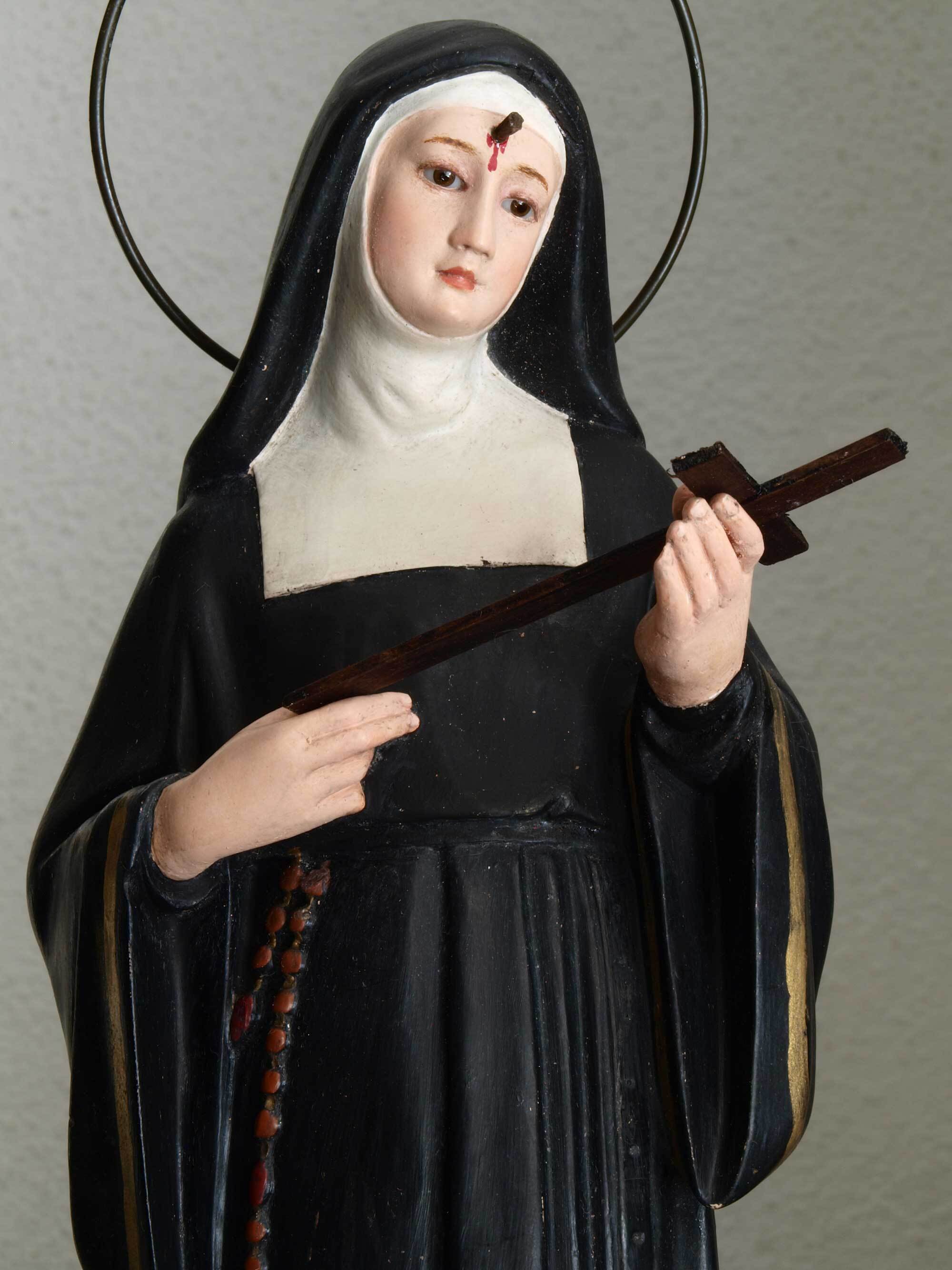 聖リタ/サンタ・リタ像、1940年前後 。美しい顔立ちをしています。修理箇所はないようです。木製の台座に亀裂があります。写真でご確認ください。 バックスタンプ有り、18世紀より秀作を数多く欧州各地に送り出したスペイン/オロトの物。 高さは光輪上から台座下まで。破損防止のため光輪と十字架を取り外してお送りします。1点1点手作りされたものです。大量生産された物ではないので、同じものは二つとありません。この機会をお見逃しなく。 カッシアのリタと呼ばれるイタリア15世紀のカトリック教会の聖人。とても不幸な身の上を過ごし1457年に死去、死語半世紀以上も経過した1900年に聖人として認められた。額のキズは青銅で祈りを捧げている時に キリストの茨の冠の棘が飛んで刺さったと言われています。聖リタは未亡人の守護聖人、祝日は5月22日。