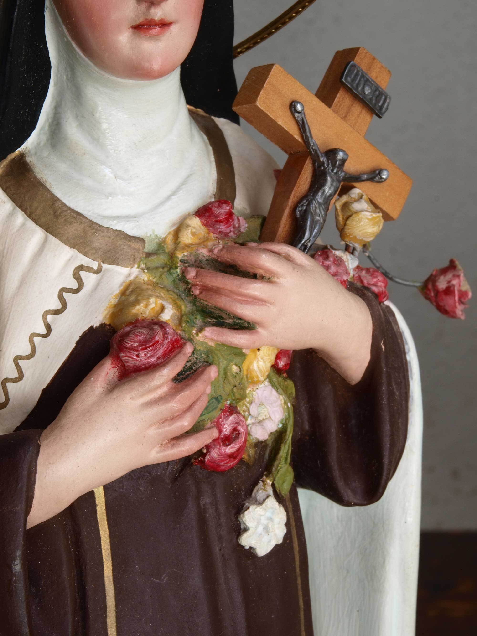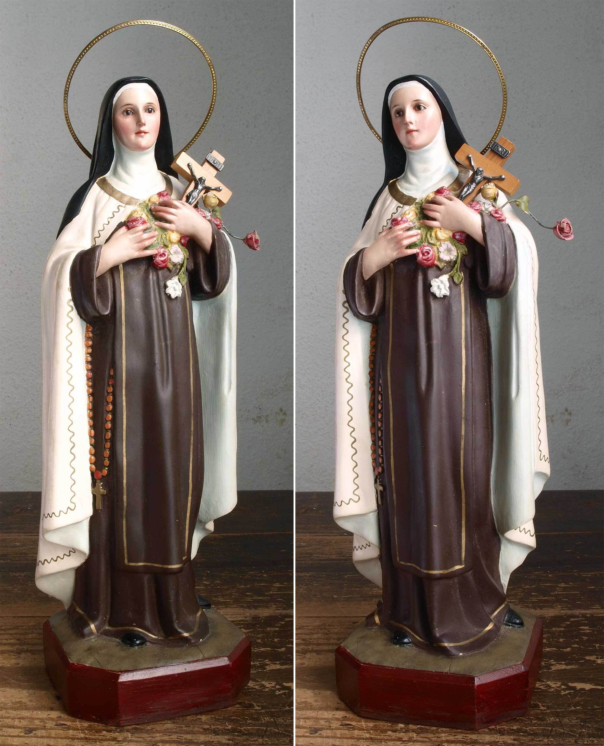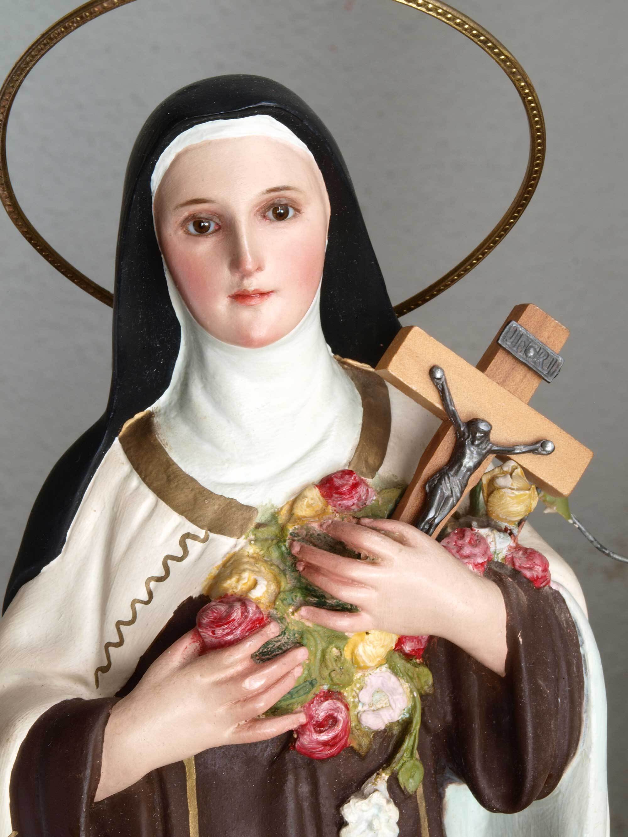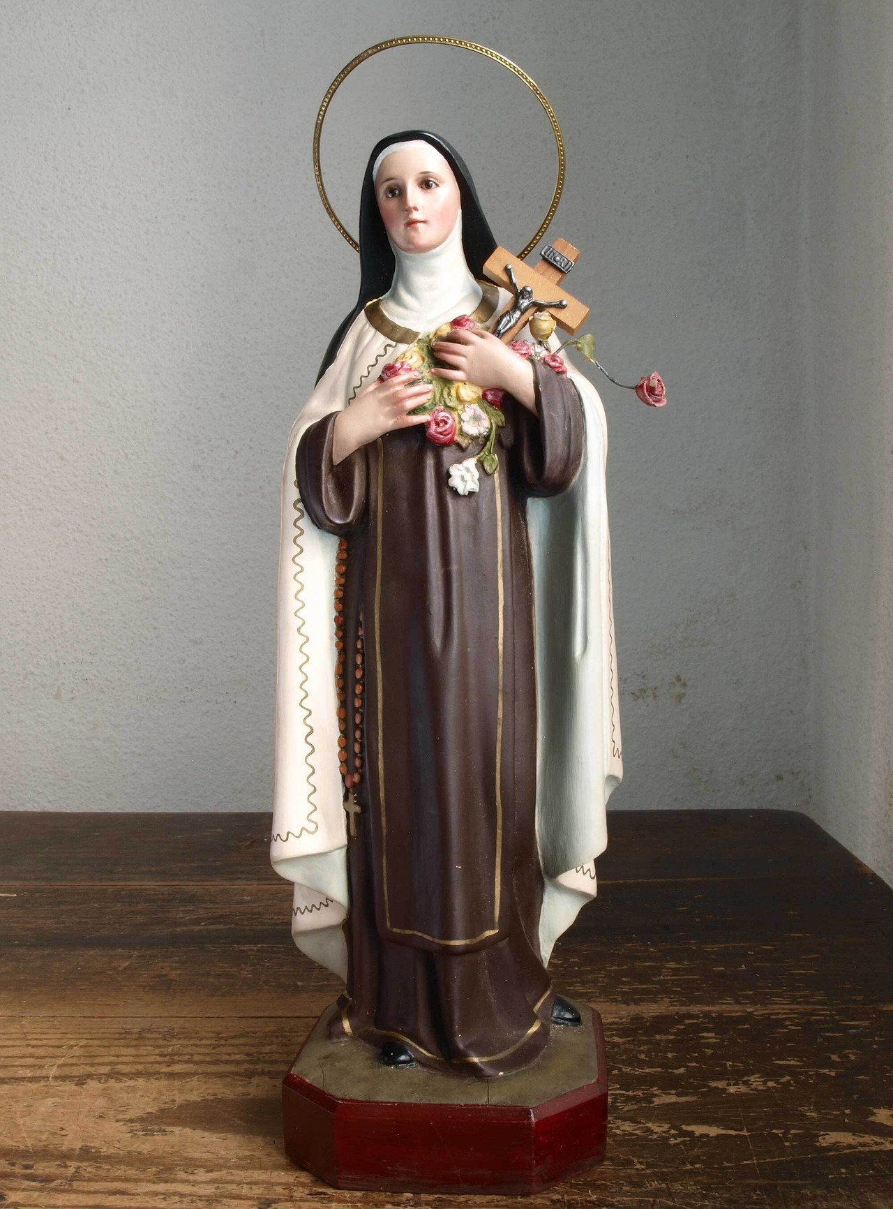 幼きイエスのテレーズ像。1930年ぐらい。若干24歳でこの世を去った若く美しいフランスの聖人、死没1897年9月30日。リジューのテレーズは花屋、子供や弱者の守護聖人 祝日は10月1日。フランスではジャンヌ・ダルクに次ぐ第二の守護聖人として奉られています。細かな傷を目立たなくするための塗装がされています。バックスタンプ有り、18世紀より秀作を数多く欧州各地に送り出したスペイン/オロットの物。高さは光輪から台座下まで。破損防止のため光輪と十字架を取り外してお送りします。1点1点手手で描かれた物です。大量生産ではないので、同じものは二つとありません。この機会をお見逃しなく。