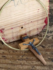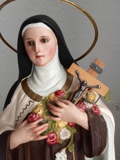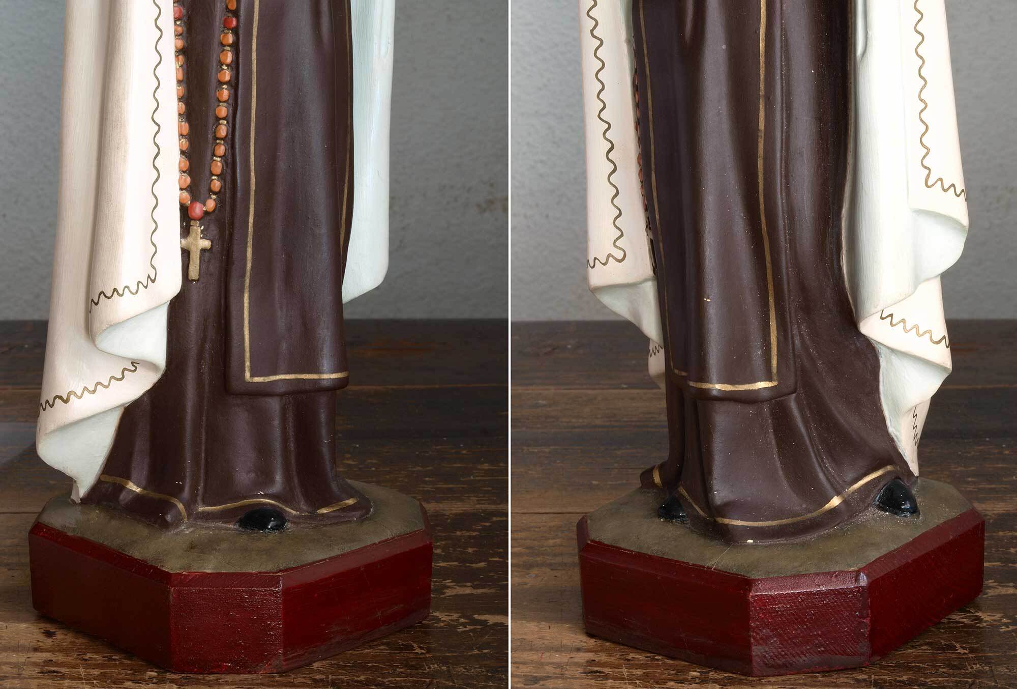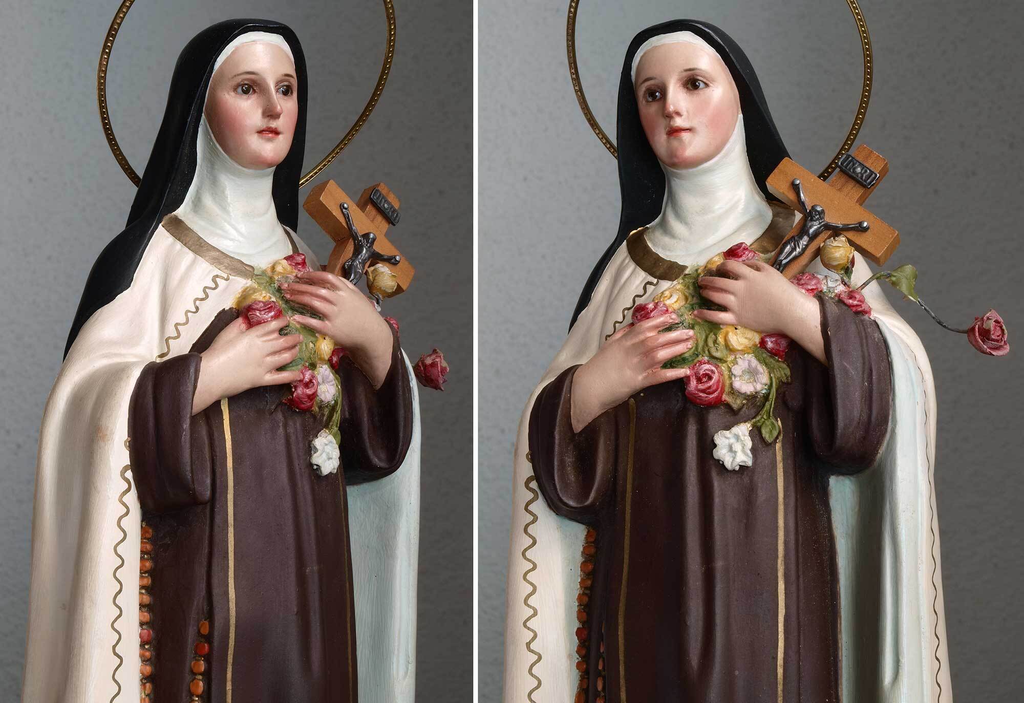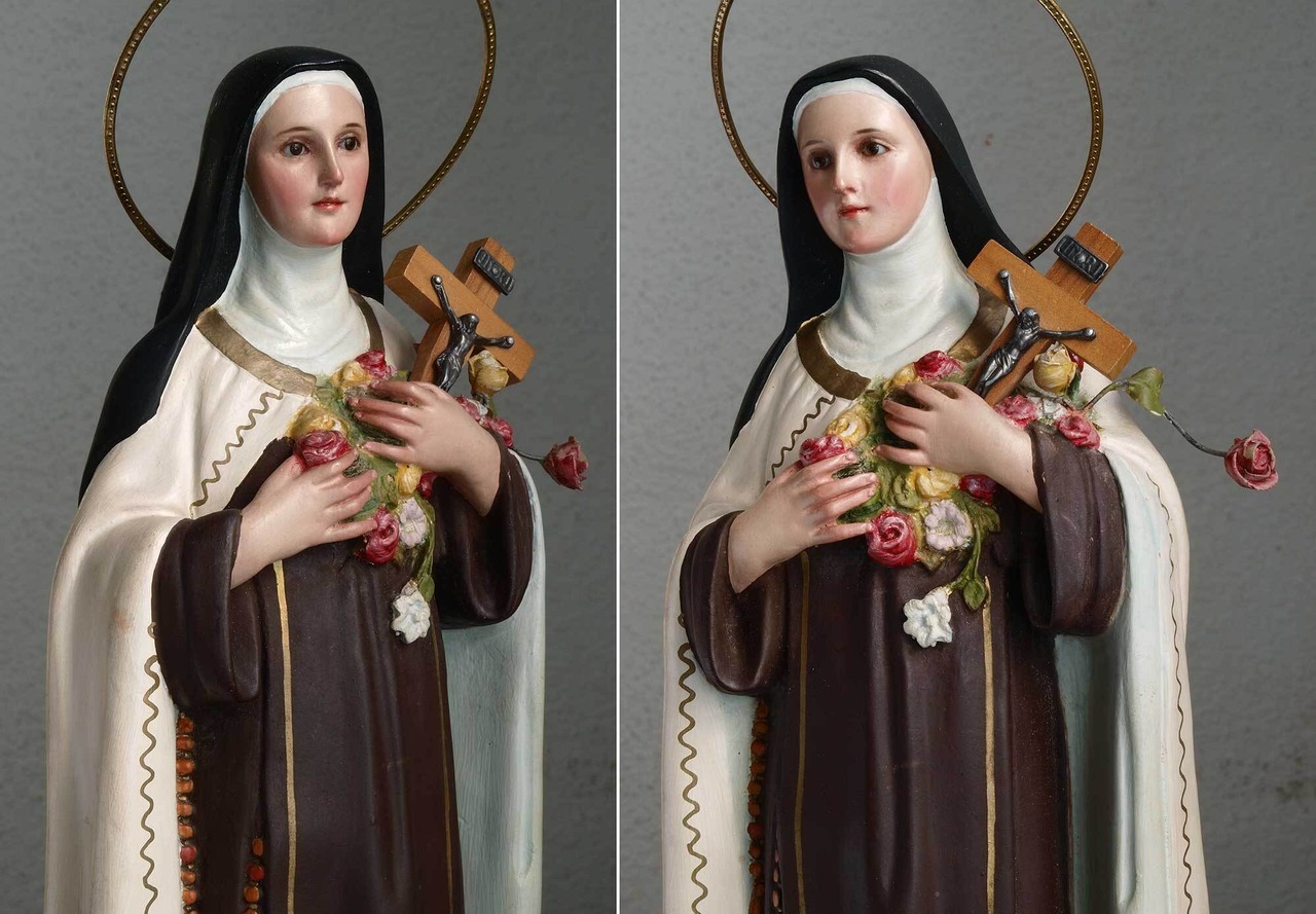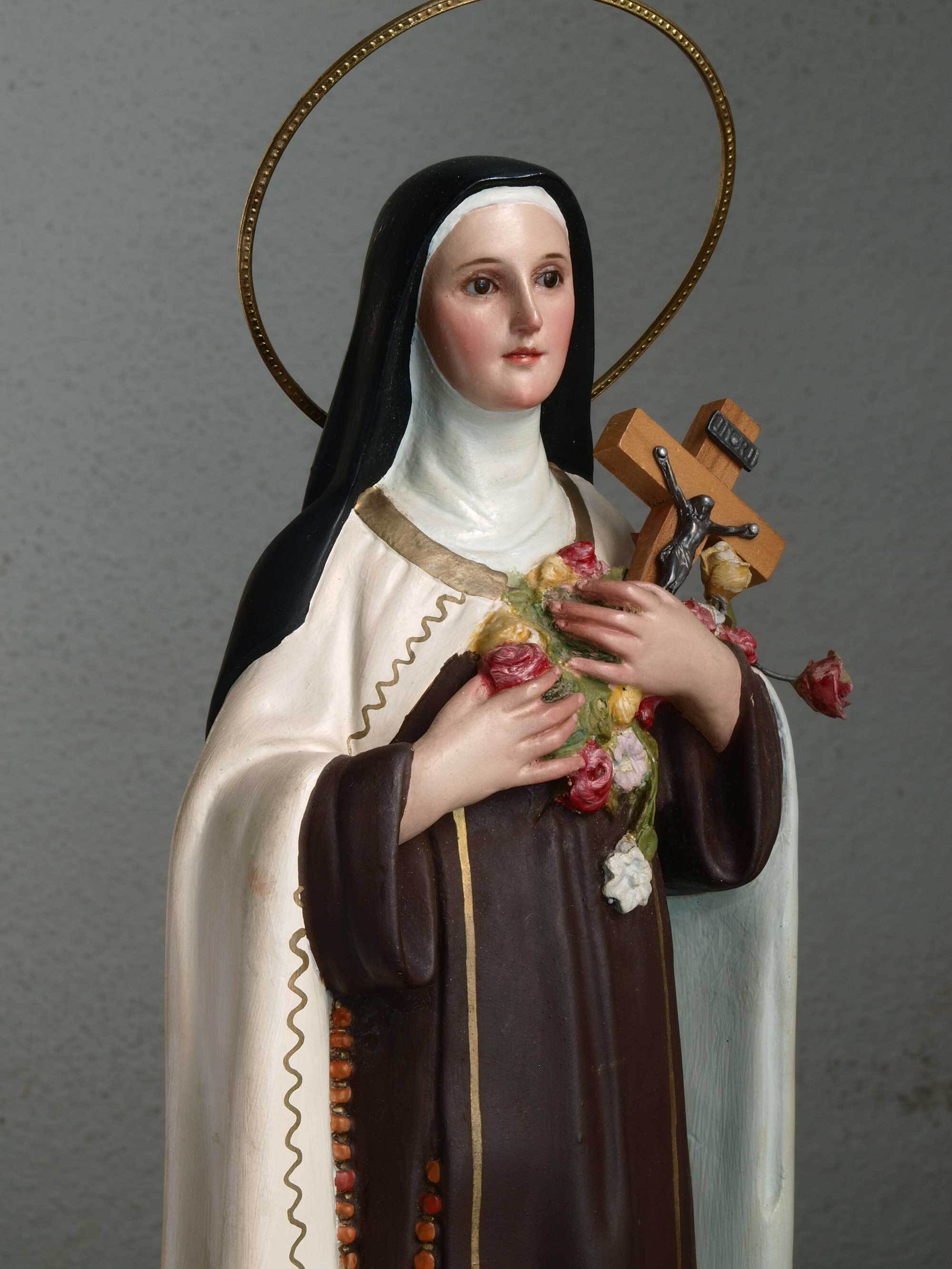 幼きイエスのテレーズ像。1930年ぐらい。若干24歳でこの世を去った若く美しいフランスの聖人、死没1897年9月30日。リジューのテレーズは花屋、子供や弱者の守護聖人 祝日は10月1日。フランスではジャンヌ・ダルクに次ぐ第二の守護聖人として奉られています。細かな傷を目立たなくするための塗装がされています。バックスタンプ有り、18世紀より秀作を数多く欧州各地に送り出したスペイン/オロットの物。高さは光輪から台座下まで。破損防止のため光輪と十字架を取り外してお送りします。1点1点手手で描かれた物です。大量生産ではないので、同じものは二つとありません。この機会をお見逃しなく。