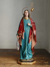 大天使聖ラファエル像、1930年ぐらい。欧州にて入手。祝日は9月29日、旅人の守護者。小ぶりの像ですが優しい表情が良く、醜い痛みのない状態の良いものです。杖も含めた全体の高さは45.5cm。おそらくペイントし直してあるようです、この状態で入手しました、当方では掃除しただけです。多少の塗装のはげ、汚れ程度はあります。古い聖人像としてもまず日本では入手できないのではないかと思います。 バックスタンプ有り、18世紀より秀作を数多く欧州各地に送り出したスペイン/オロットの物。日本では見られない様な珍しい古い聖人像を多数取り扱っています。1点1点工房で手作りされた像です、同じ物は一つとありません。この機会をお見逃し無く。 破損防止のため光輪と杖を取り外してお送りします。