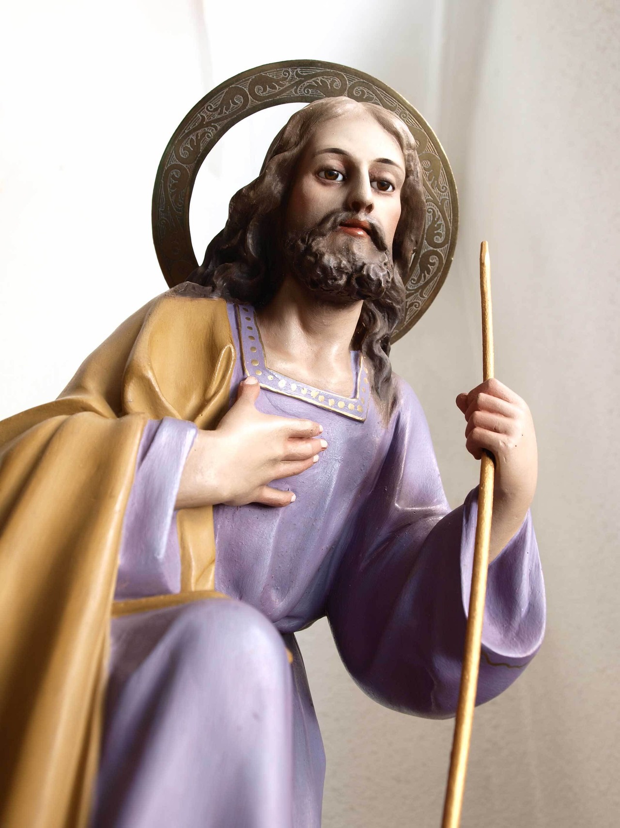 イエスの父、聖ジョセフ像、グラスアイ、1940年ぐらい。修理箇所無し。小さなキズ、塗装のハゲや薄汚れ程度はありますが修理箇所のないおおむね良い保存状態。杖は取り外すことができません。 バックスタンプ有り、18世紀より秀作を数多く欧州各地に送り出したスペイン/オロットの物。破損防止のため光輪を取り外してお送りします。聖ジョセフ(ナザレのヨセフ)祝日:3月19日。教会、父親、大工、旅人などの守護聖人。