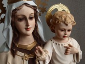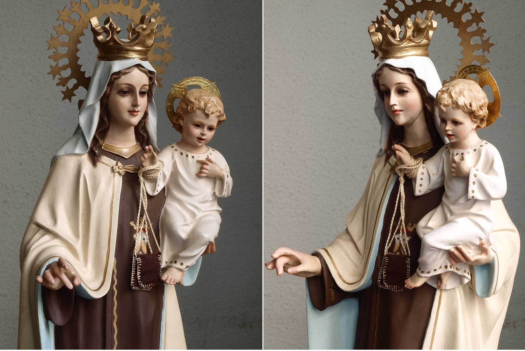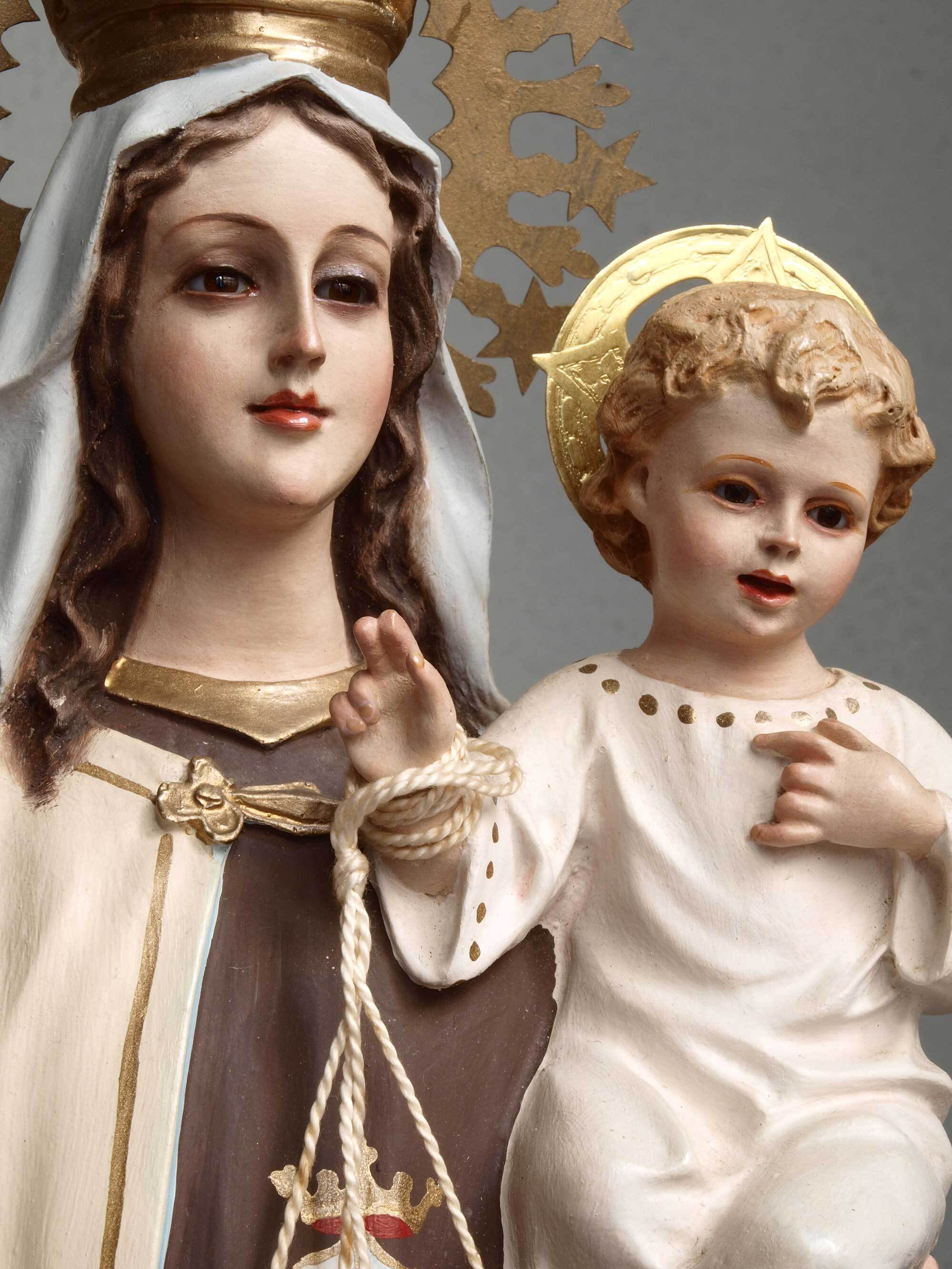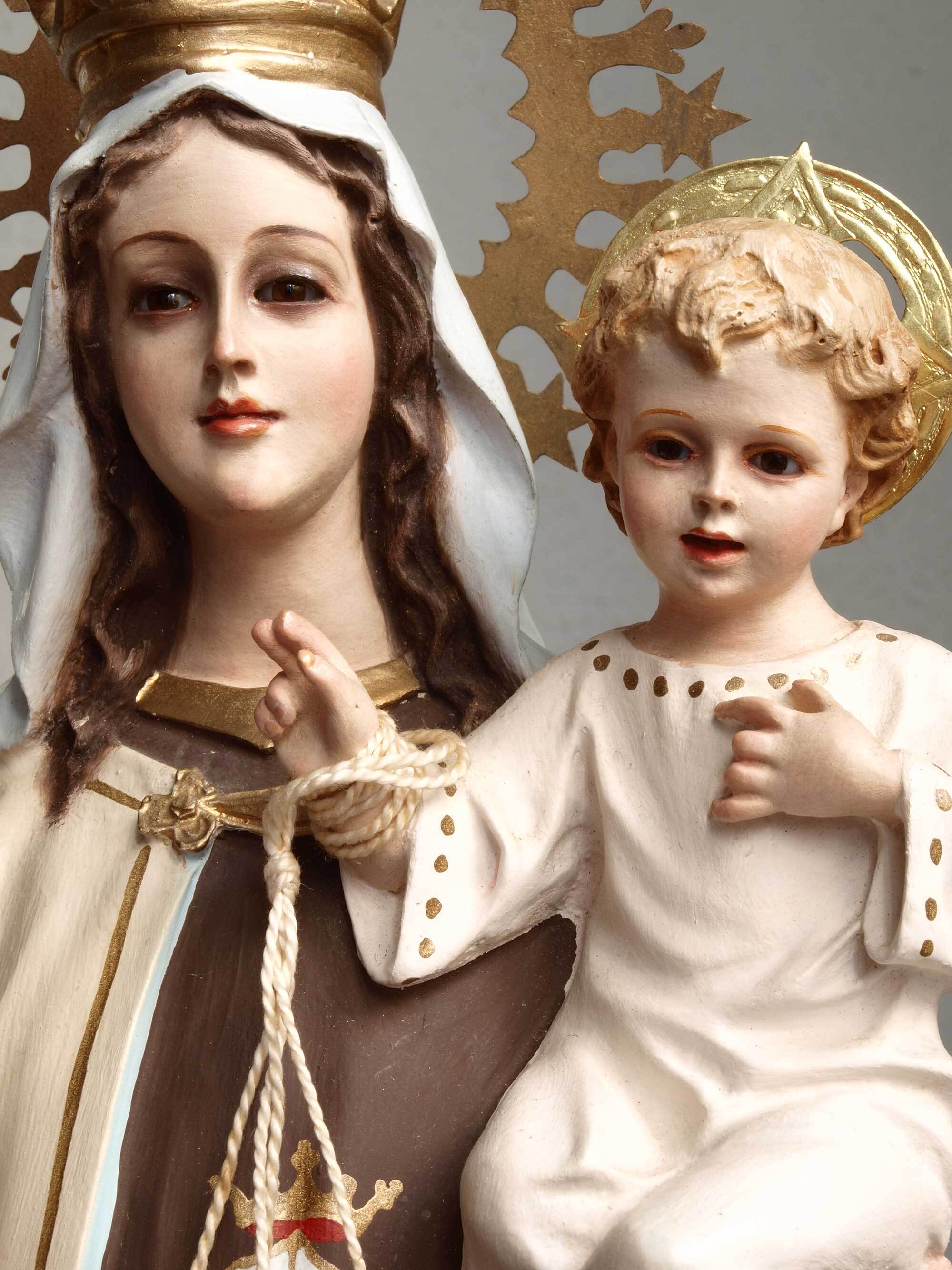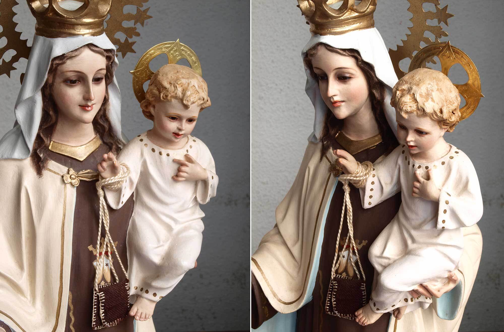 カルメル山の聖母子像、小さなキリストを抱える聖母、1940年ぐらい。聖母、イエス共にグラスアイ。胸にはカルメル会の山と星のシンボルマーク。カルメル山の聖母子は漁師達の守護聖人、祝日は7月16日。聖母のローブの胸にあるのは「カルメル会」の紋章で起源となったパレスチナのカルメル山と星のモチーフ。 小さなチップや塗装のハゲなどあります。 聖母の右手指に修理あざります、入手時にはすでに修理されていました。バックスタンプませんがスペインの物だと思います。高さは光輪から台座下まで、破損防止のため光輪、を取り外してお送りします。