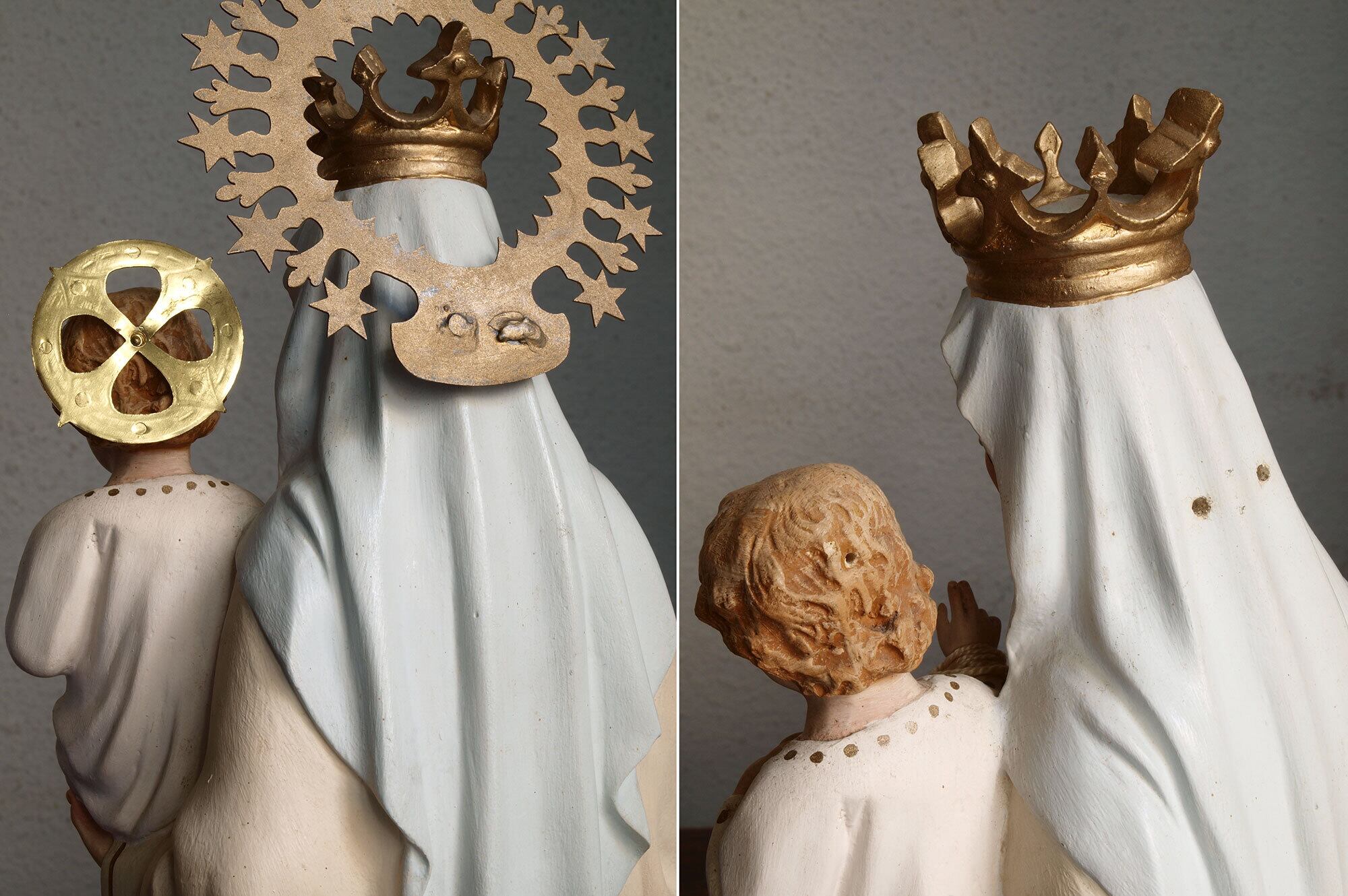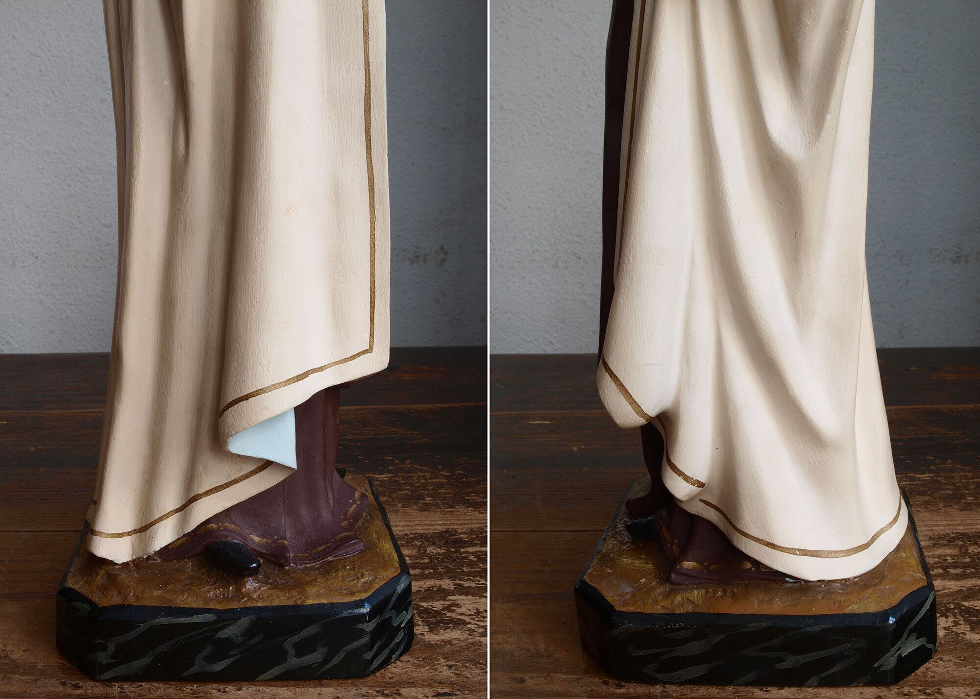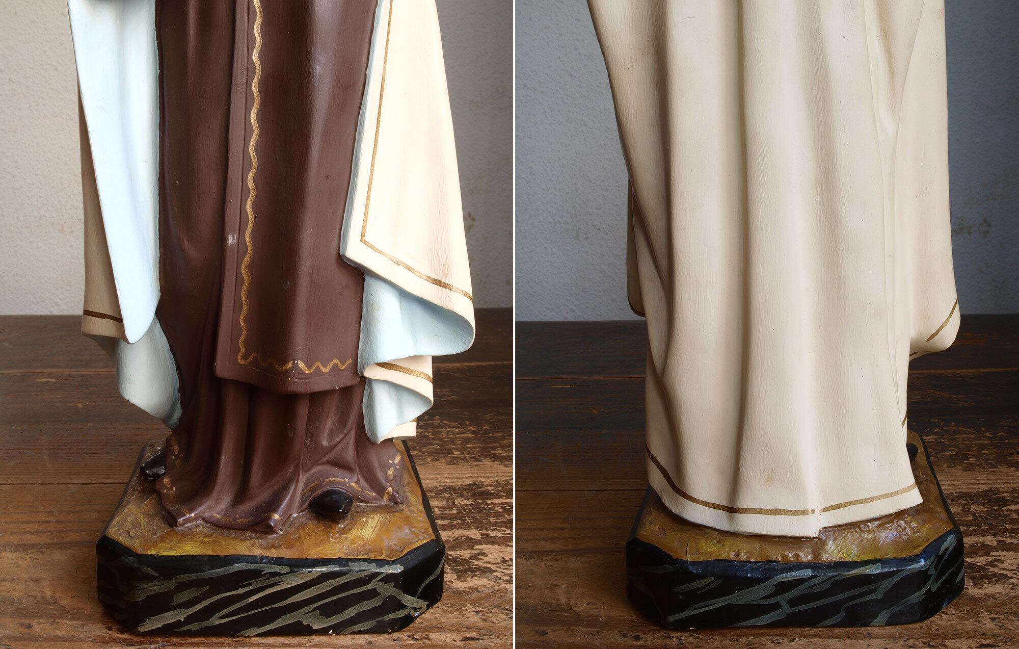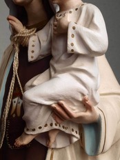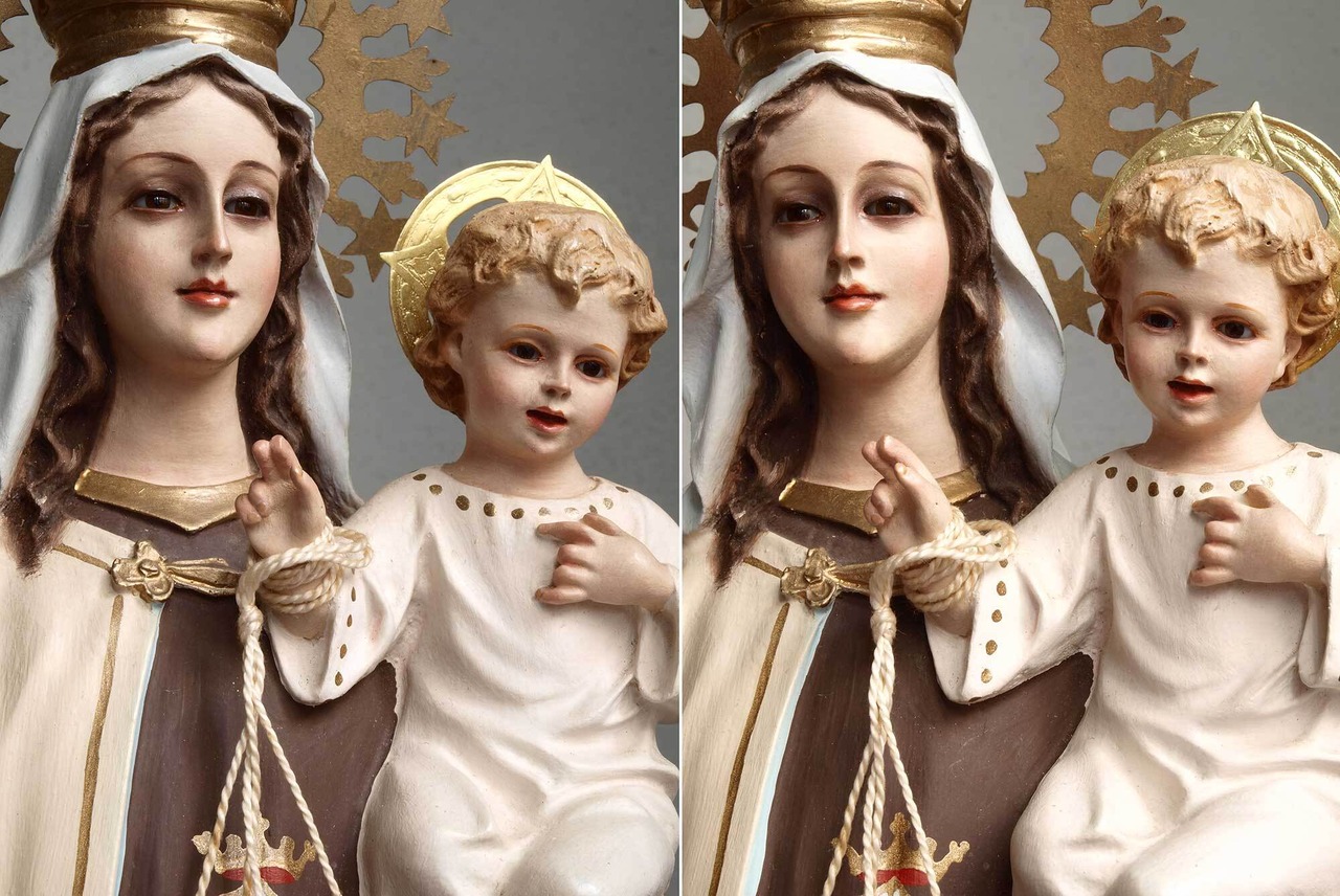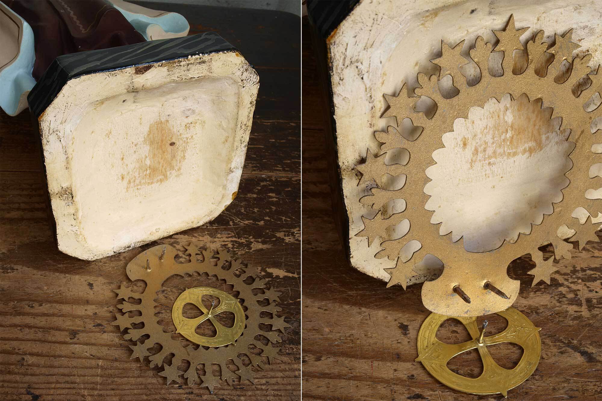 カルメル山の聖母子像、小さなキリストを抱える聖母、1940年ぐらい。聖母、イエス共にグラスアイ。胸にはカルメル会の山と星のシンボルマーク。カルメル山の聖母子は漁師達の守護聖人、祝日は7月16日。聖母のローブの胸にあるのは「カルメル会」の紋章で起源となったパレスチナのカルメル山と星のモチーフ。 小さなチップや塗装のハゲなどあります。 聖母の右手指に修理あざります、入手時にはすでに修理されていました。バックスタンプませんがスペインの物だと思います。高さは光輪から台座下まで、破損防止のため光輪、を取り外してお送りします。