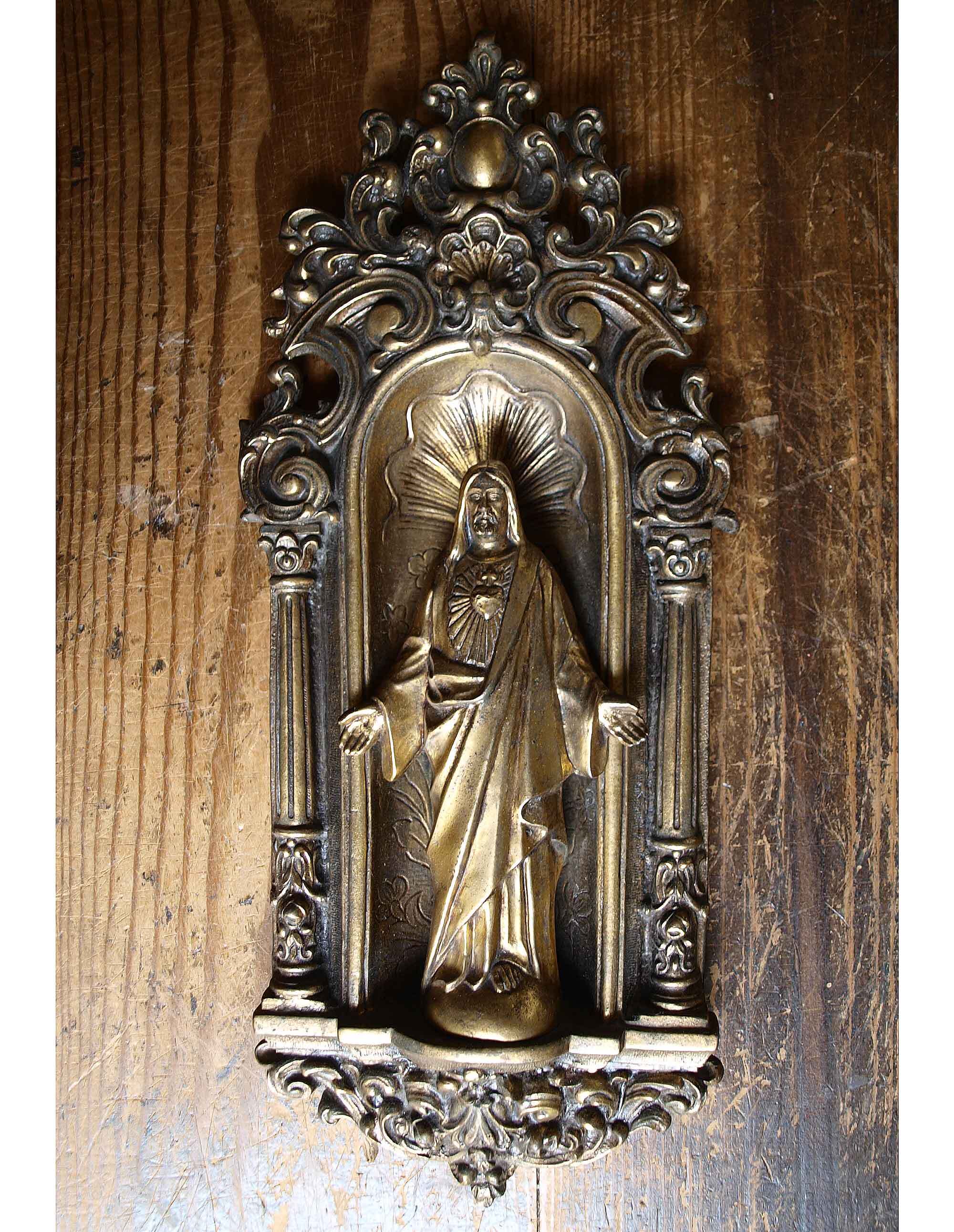 欧州のアンティーク市にて入手。教会や礼拝堂、家庭に祀られていたものでしょう。年代は1940年ぐらい? キャストモールドで作られています。素材は真鍮はたはブロンズだと思われます、船舶部品などに用いられる黄金色のアルミニウム青銅ではないでしょうか。歪みなど醜いダメージはありません。参考資料、リメイクなどにもどうぞ。