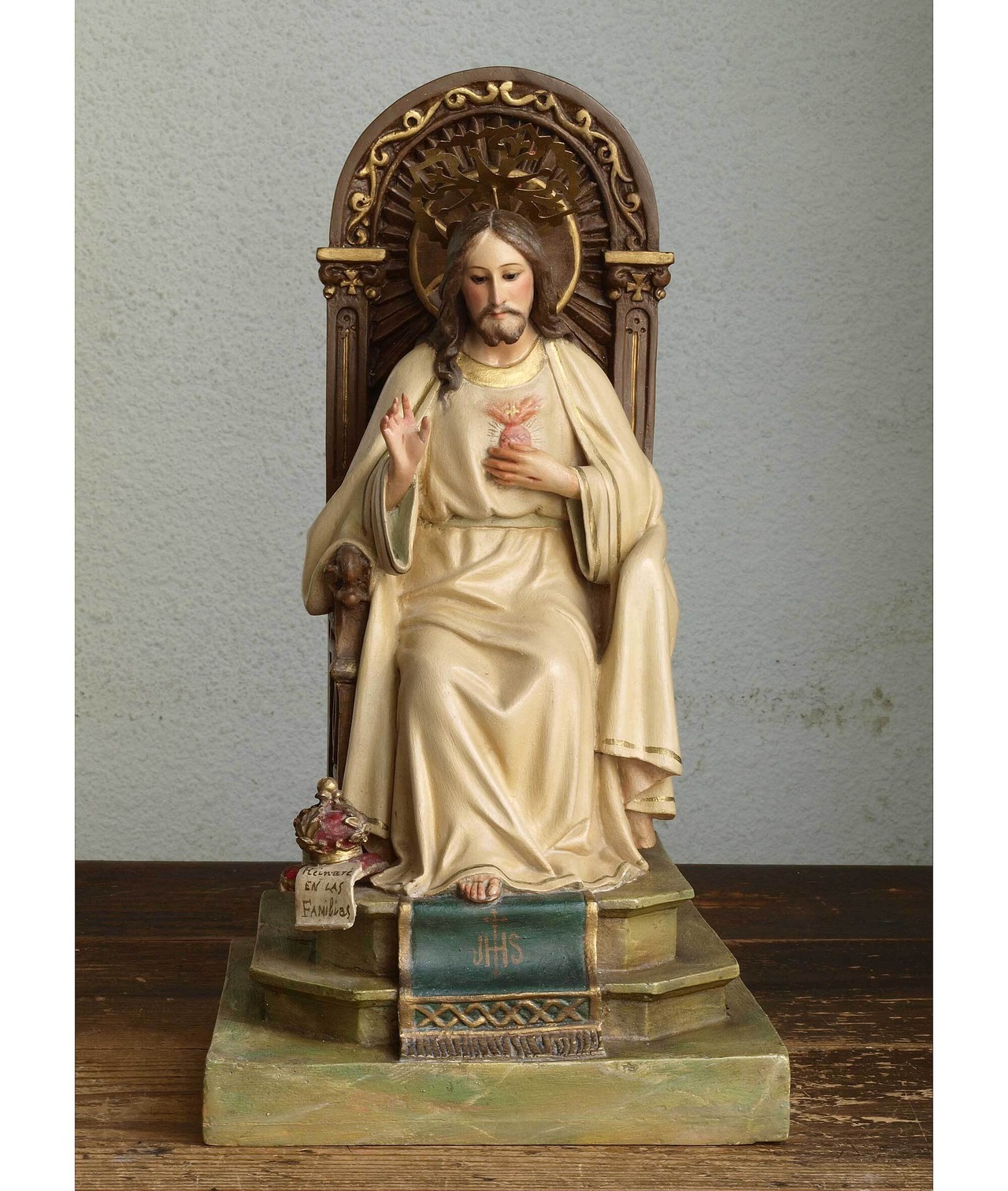 1940年前後。「聖なる心臓」(清心)のキリスト像。優しい眼差しはグラスアイ。塗装は全て手描き。多少の塗装のハゲ、擦れなどあります。落ち着いた表情で、味のある像となっています。トータルの高さは背もたれ上から台座下まで。破損防止のため光輪を取り外してお送りします。 バックスタンプありませんが、スペインの物でしょう。日本では見られない様な珍しい古い聖人像を多数取り扱っています。1点1点工房で手作りされた像、職人の腕によって同じ物はひとつとありません。この機会をお見逃し無く。