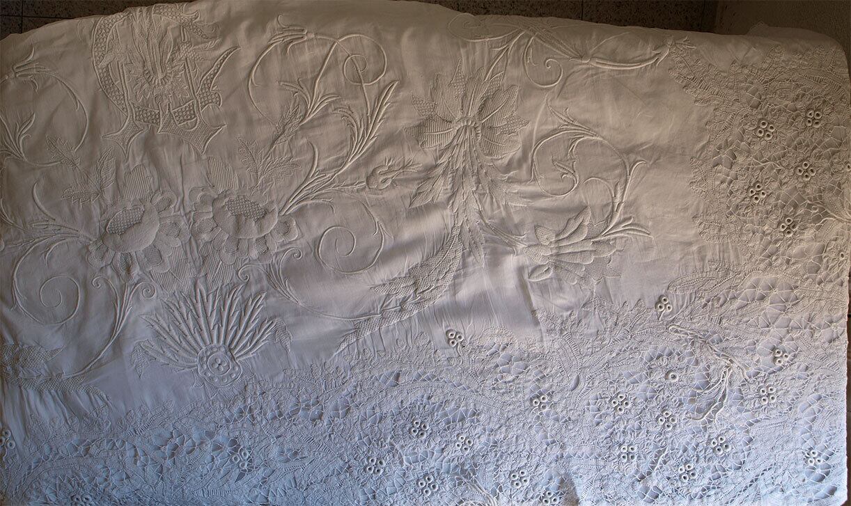 婚礼用 豪華手刺繍イニシャルとバテンレースベッドリネン巾230cm×長280cm シーツ ホワイトリネン レース フランスアンティーク/H352