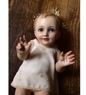 南欧の骨董市にて入手、1950年前後。大きなガラスの瞳の幼子イエス像。大きな瞳。ブラウスも含みます内部は一部空洞。多少の擦れあり。バックスタンプありませんが、スペインで作られた物のはずです。大さは光輪の上からつま先まで32cm、本体のみ27.5m、光輪11cm×7.5cm。特に目立つ醜いダメージ無し。この幼子はクリスマスに飾る為の像で、カトリックの信仰の厚い国、特にスペイン、南仏、イタリアではクリスマスにキリスト生誕のシーンをジオラマで作ります。その為の中心となる赤子のイエスの彫刻です。周囲には聖母、聖ホセ、東方の三賢人などが囲みます。日本では見られない様な珍しい古い聖人像を多数取り扱っています。1点1点工房で手作りされた像です、同じ物は一つとありません。この機会をお見逃し無く。破損防止のため光輪を取り外してお送りします。