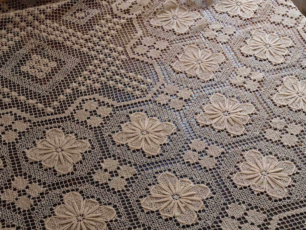 総刺繍 フィレレース テーブルクロス 225cm×240cmカーテン ベッドカバー 美品モチーフ アイリッシュクロシェ ヨーロッパ ヴィンテージ/H385