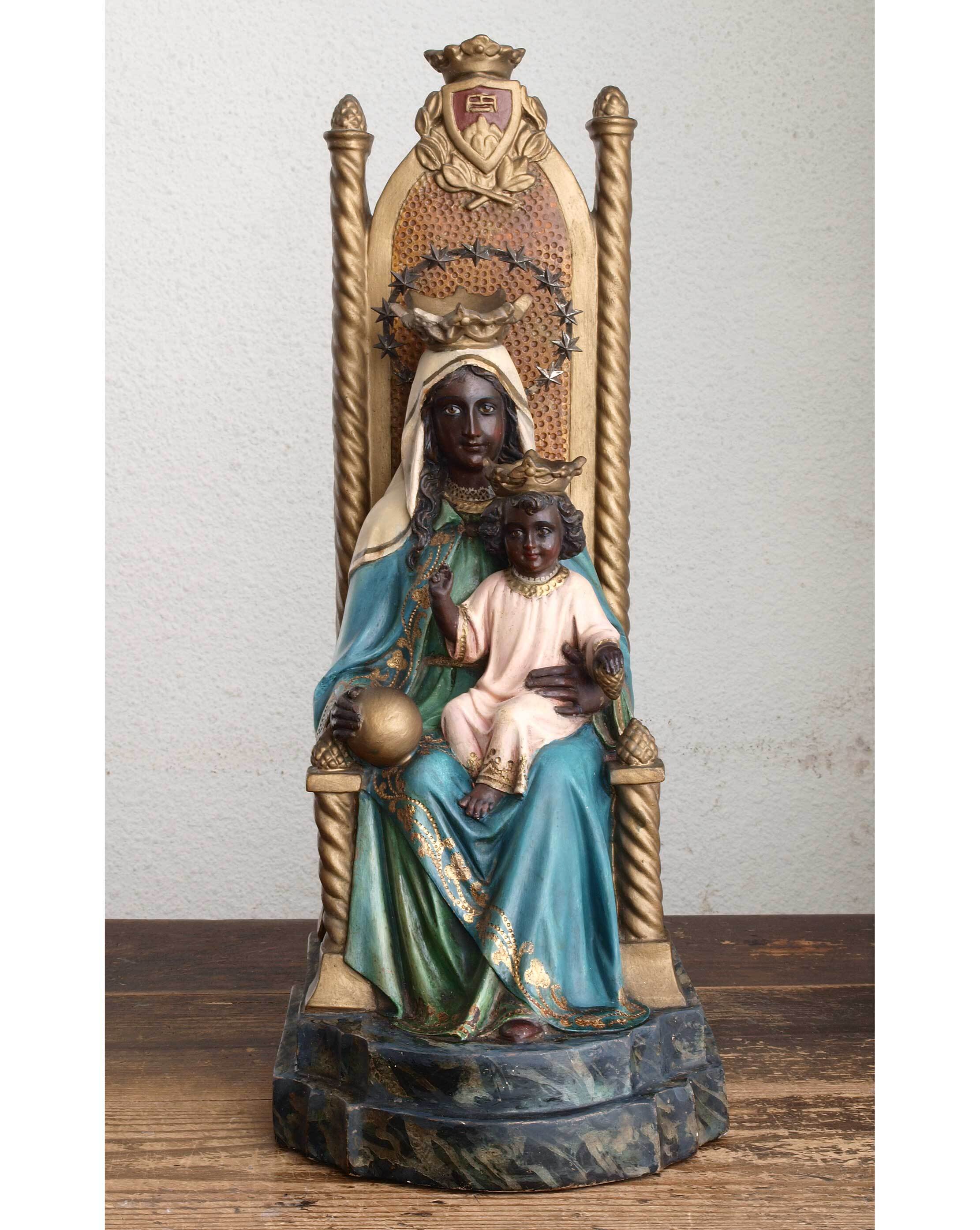 ヨーロッパのアンティーク市にて入手。カタルーニャの聖地モンセラの守護聖人のスーベニール品、1940年ぐらい。バルセロナ郊外にあるモンセラ修道院におさめられてあるマリア像は「黒いマリア像」として世界的に知られています。聖母、幼子イエスともにグラスアイ。背もたれの一番上に鋸のレリーフがあります、これはモンセラの山が鋸の歯のようだという由来です。木粉を樹脂を混ぜたものを型に流して作られたもので、内部は一部空洞。多少のキズ、欠け、小さな傷や塗装のハゲ、またはそれらを目立たなくするための手入れ及び塗装程度はしてあります。詳細は写真でご確認ください。バックスタンプ有りませんがスペインの物でしょう。装飾はエストファードという金箔を貼った後に型押しの模様を施す技法。高さは背もたれ上から台座下まで。破損防止のため光輪と背もたれを取り外してお送りします。1点1点工房で手作りされた像です。高さは光輪から台座下まで。参考資料、リメイクなどにもどうぞ。日本では見られない様な珍しい古い聖人像を多数取り扱っています。背もたれ: 32cm×14cm×2.5cm