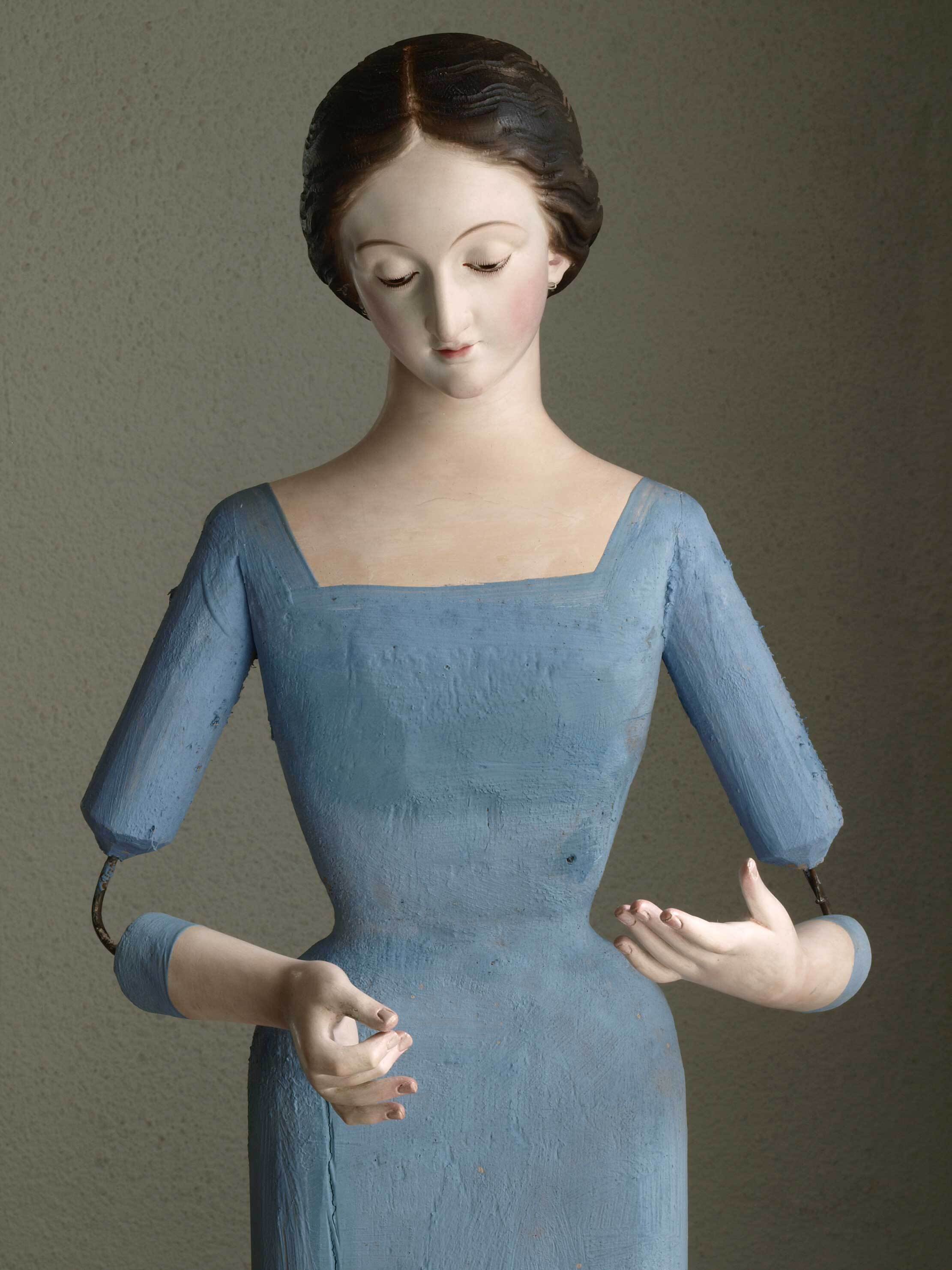 聖母マリアののケージドール、1900年ぐらい? シルクやレースで施された衣装を着せてお祀りしてあった物です。ドレス、ローブなどの衣装を着せる為、服に隠れて見えない部分は簡素に作られています。おそらく悲しみの聖母像ではないかと思いますが、ローブがないので詳細不明。本体は木製、頭部の一部や手などは粘土などを使っている場合もあります。手の指先の表現が美しい。経年による亀裂がああります。高さは頭の上からから台座下まで。破損防止のために分解して梱包発送します。日本では見られない様な珍しい古い聖人像を多数取り扱っています。1点1点工房で手作りされた像、大量生産された物ではないので、顔立ちなどが微妙に異なり、同じものは二つとありません。この機会をお見逃しなく。台座から聖母を取りはずことはできません。