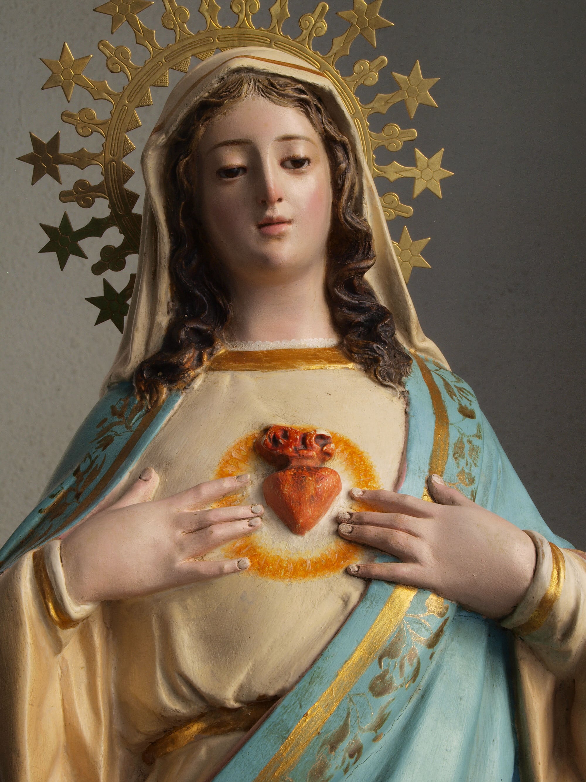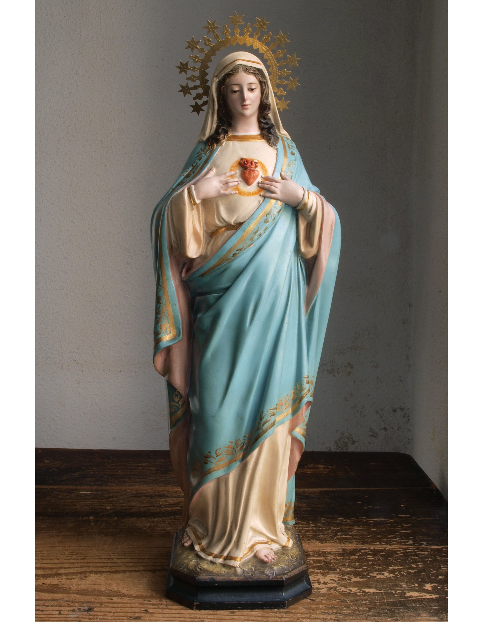 胸に手を当てる聖母マリア像 高55.5cm 聖心の聖母 宗教彫刻 スーベニール 工藝 オロット スペイン アンティーク /H477