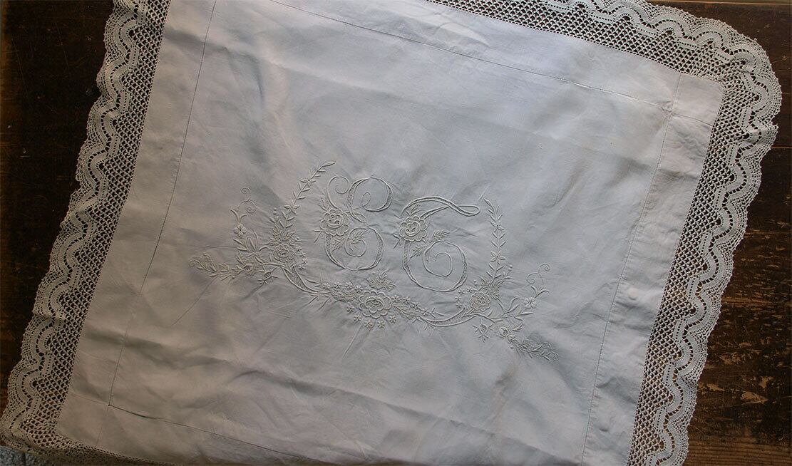 手刺繍とクロシェレースのクッションカバー65.5cm×60cm+レース7cmフランス ヴィンテージ/H470