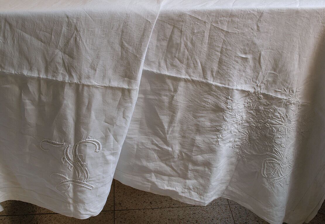 豪華手刺繍 イニシャルのシーツ 240cm×長282cm ベッドリネン ホワイトリネン シャンブルリネン フランス アンティーク/H473