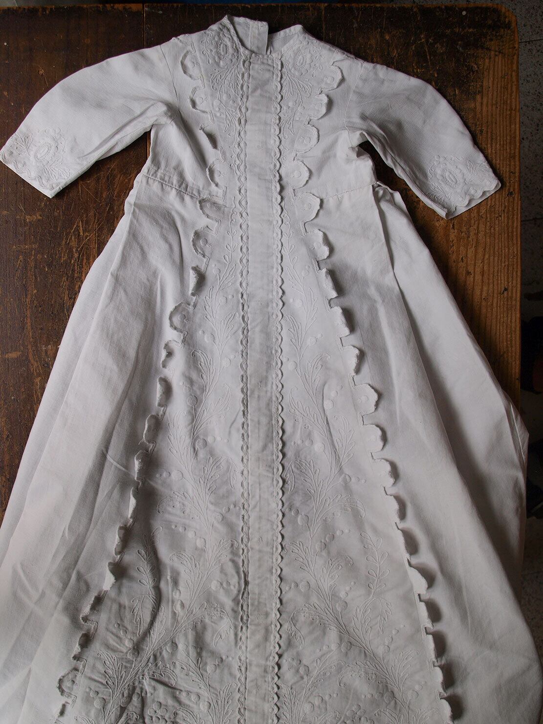 豪華なコーネリー刺繍 コットンピケ スカラップ べビー服 ワンピース 子供服 洗礼ドレス 時代衣装 フランス アンティーク/H566