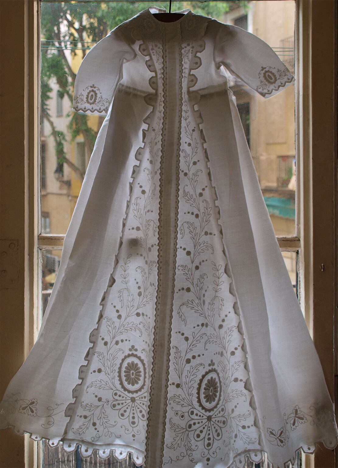 ヨーロッパのアンティーク市にて入手。1930年前後。生後数ヶ月の乳児が、洗礼式で着用するためのドレスです。手刺繍、後ろ開き、開き止まりに生地の裂けあり。右脇縫いを20cmほど解いてあります、これは洗礼服には脇にスリットがある物がほとんどなのですが、これは無いので、以前の持ち主が自分で解いたのだと思われます。ボタンが欠損しているので、予備ボタンも含めて数個つけておきます。着丈は後ろ中心から計測。洗濯済 。デザイン、縫製の資料などに。アンティーク衣装、ファブリックを得意としています、他の商品も是非ご覧ください。この当時は量産された既製品はないので、1点モノとなります、お見逃しなく。小さく畳んで発送しますのでお届け時にはシワになっている事をご承知下さい。