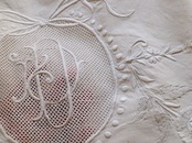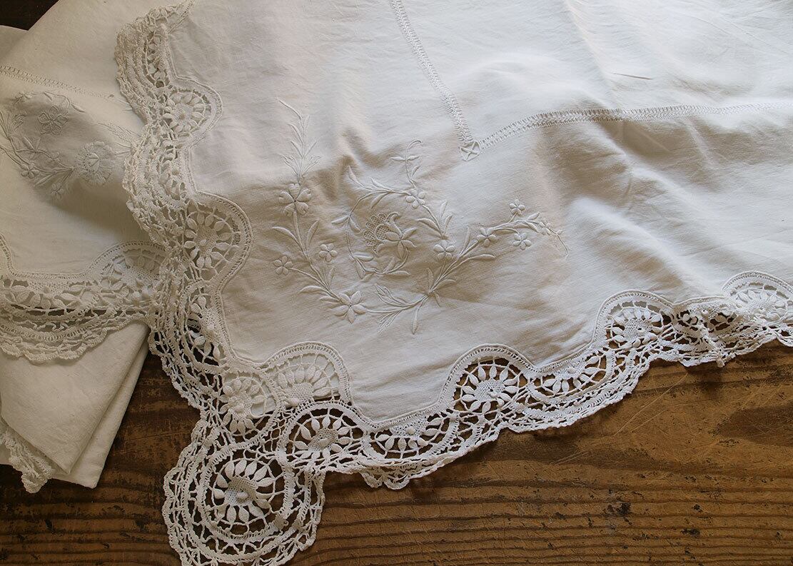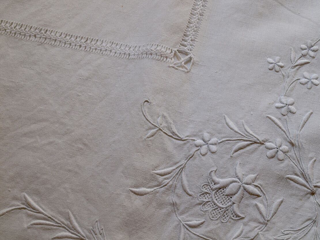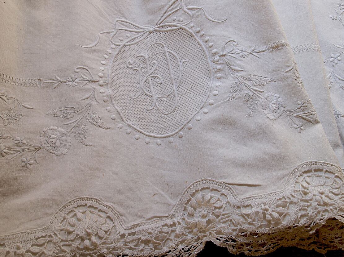 豪華手刺繍とニードルレースのシーツ 222cm×長290cm ベッドリネン ホワイトリネン シャンブルリネン フランス アンティーク/H646