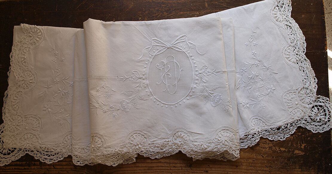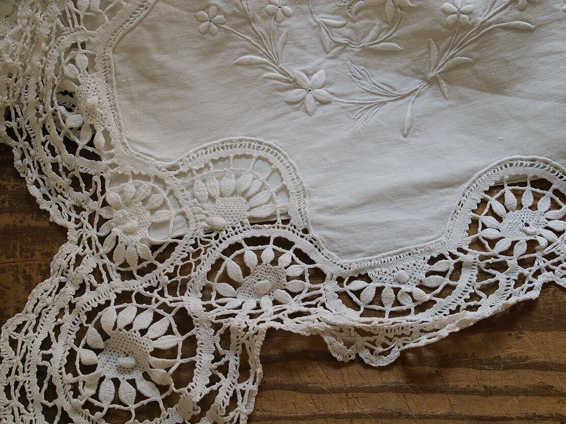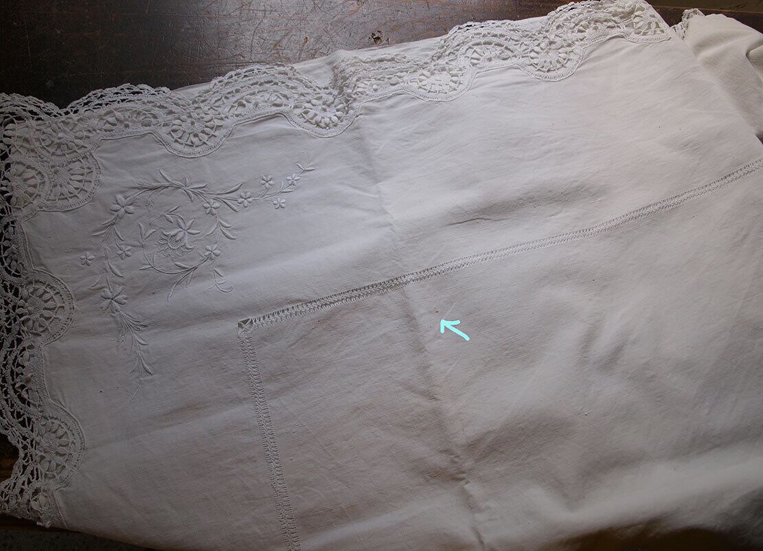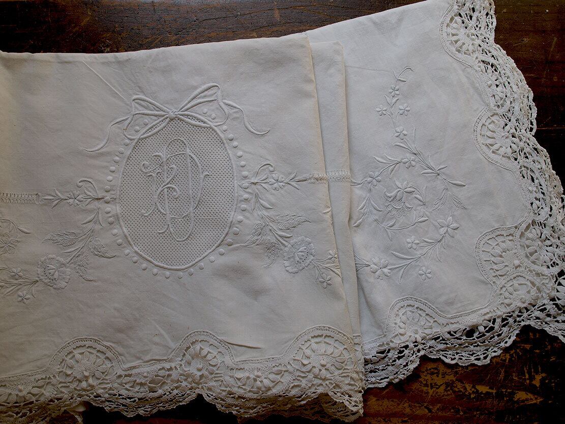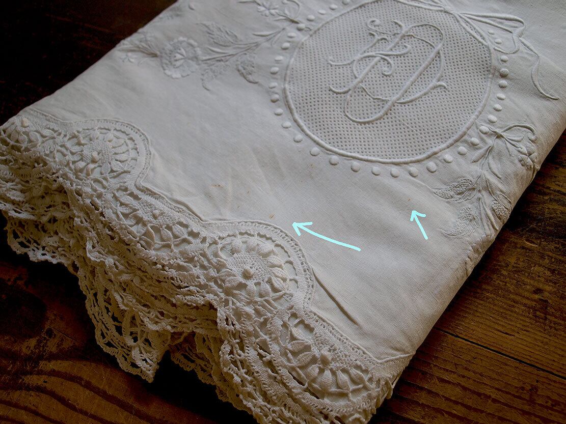 南欧のアンティーク市にて入手。1930年ぐらい。豪華な手刺繍とボビンレースのベッドリネン。刺繍部分を表に折り返して使います。刺繍イニシャル69cm×23cm、両角の73cmまでボビンレースあり。小さなシミがあります、写真でご確認いただけます。洗濯済、シーツとしてご利用頂けるアンティークです。古いものにご理解のある方のみご入札ください。参考資料、リメイクにもどうぞ。ファブリック、衣装、手芸関連を得意としております。他の商品も是非ご覧下さい。