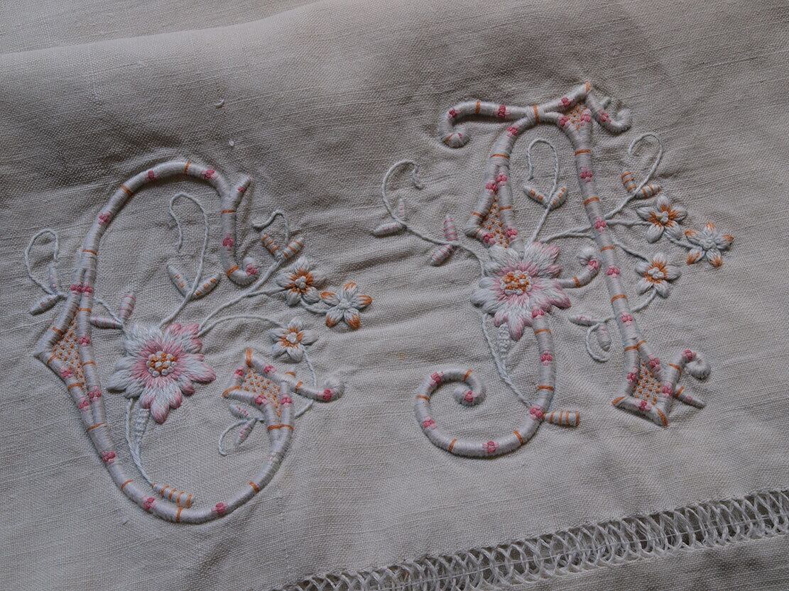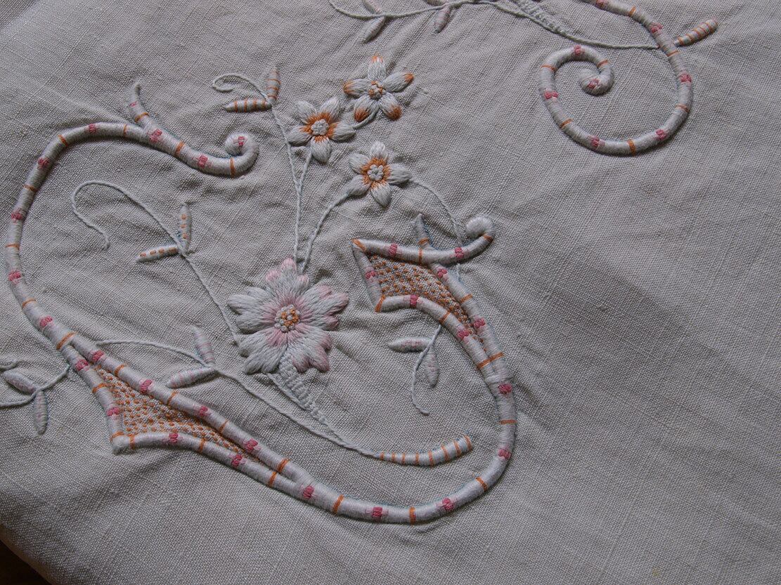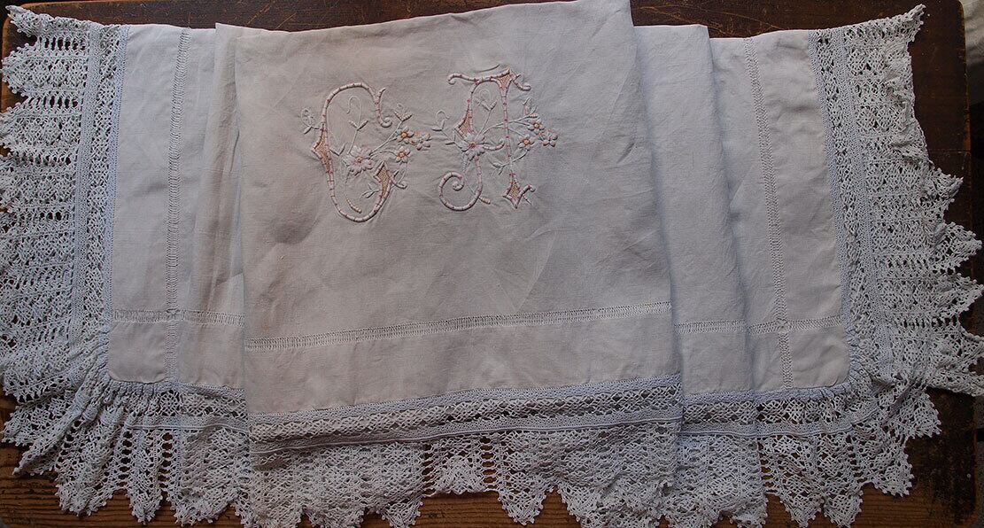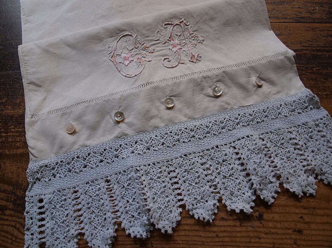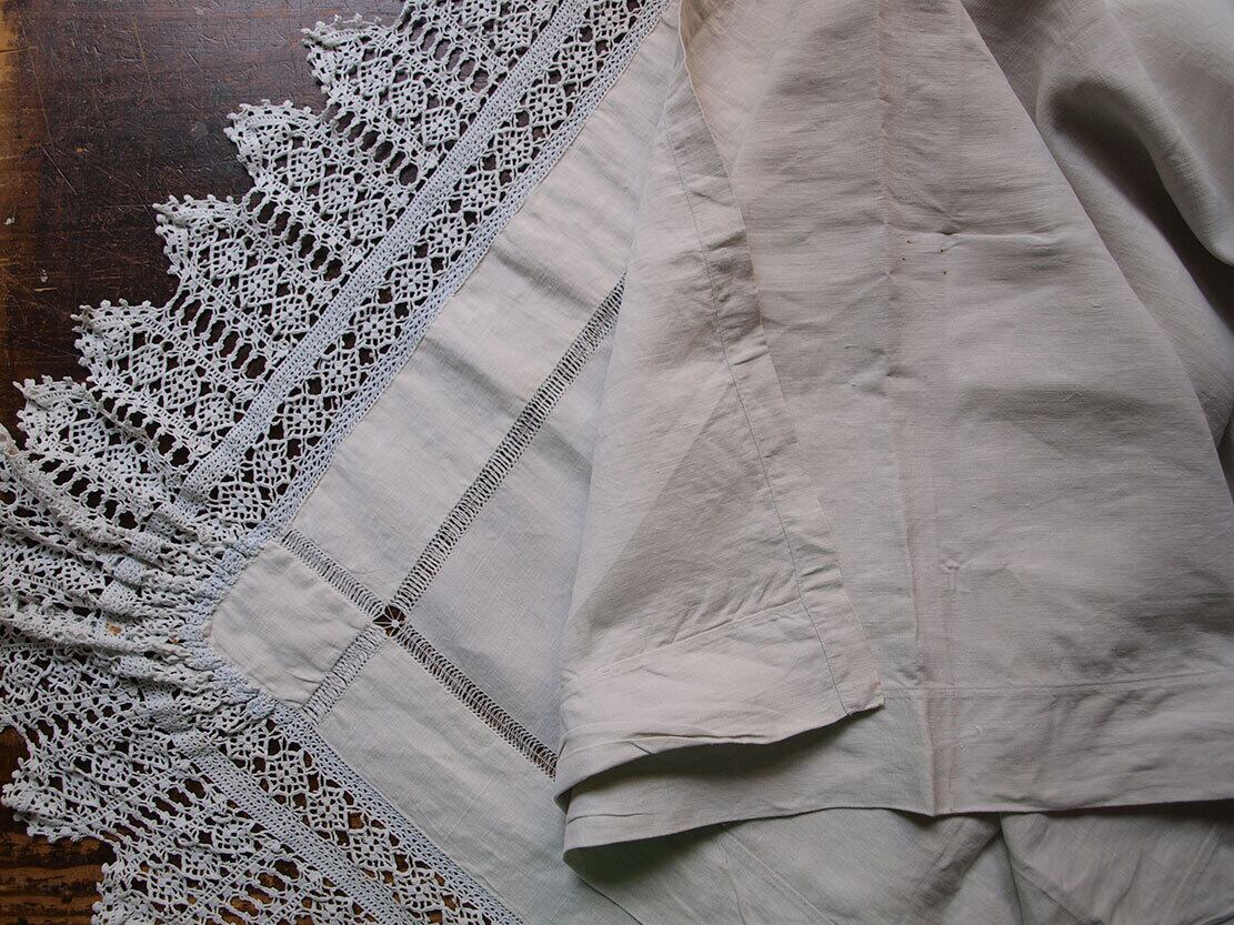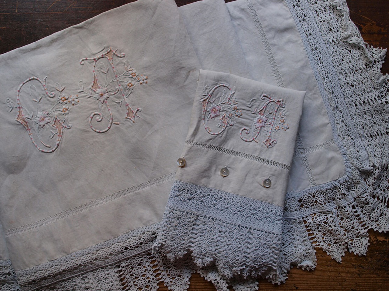 ヨーロッパのアンティーク市にて入手。1940年ぐらい。シーツ1枚とお揃いのピローケース1枚のセット。上部中央に手刺繍25cm×13.5cm、レース16cm、レースは角から両端75cmまで。刺繍部分を表に折り返して使います。ピローは袋状で入り口に手刺しのボタンホールとシェルボタン、閉じた際の内径77cm、刺繍サイズ16cm×9cm。洗濯済みですが、小さなシミがあります、ベッドリネンとしてご利用可能なお品です。参考資料、リメイク等にもいかがでしょう。ファブリック、衣装、手芸関連を得意としております。他の商品も是非ご覧下さい。バラ売りはいたしません。