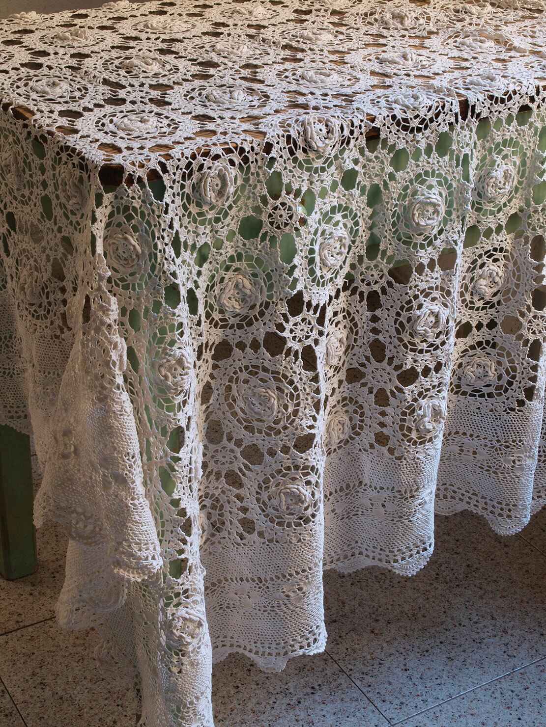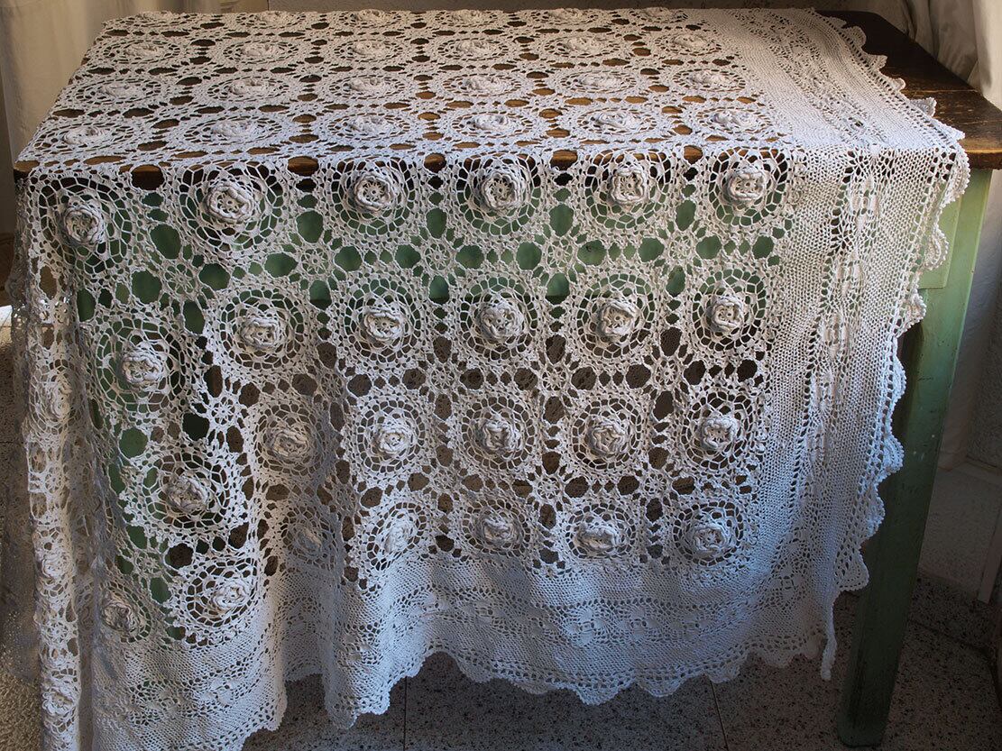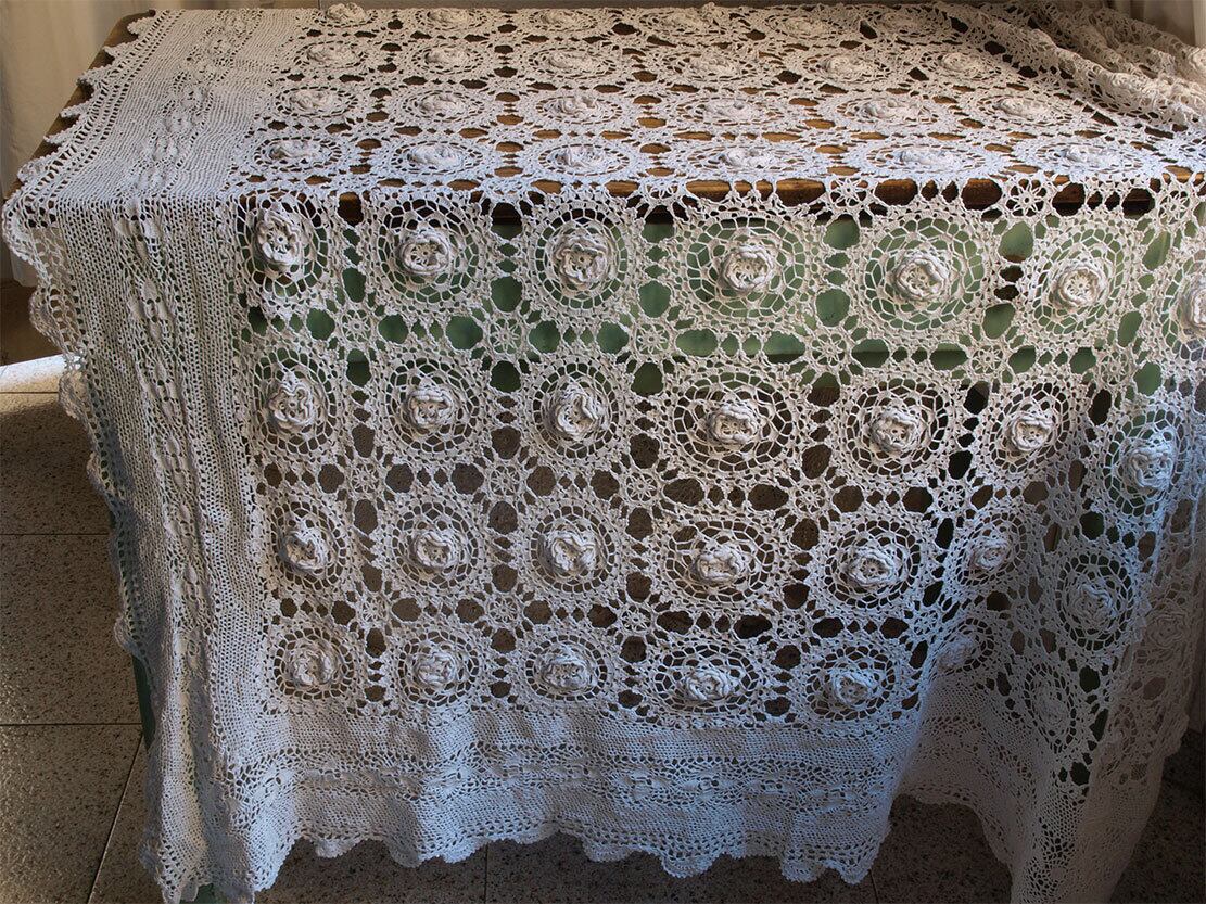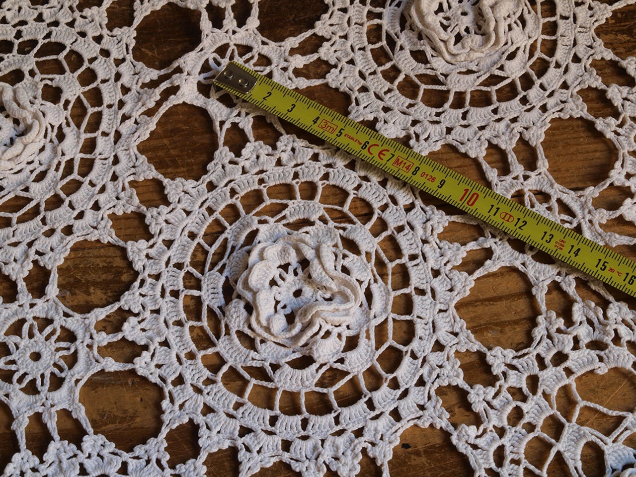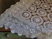 ヴィンテージのかぎ針テーブルクロスまたはベッドカバー。南欧のアンティーク市にて入手。1950年ぐらい。周囲に約12cmの縁編み。洗濯済。詳細は写真でご覧いただけます。特に目立つ痛みなし。ご家庭の洗濯機で洗うことができます。間仕切りやカーテンとして利用するのもよいでしょう。編み地の性質上、伸縮性があるため記載の寸法に誤差が生じます。大きな物でもあるので多少の寸法の誤差はご勘弁願います。参考資料、リメイクなどにもどうぞ。ファブリック、衣装、手芸関連を得意としております。他の商品も是非ご覧下さい。