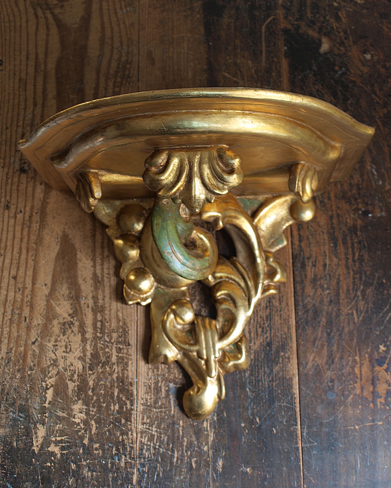 木彫刻のウォールコンソール、飾り棚。南欧の骨董市にて入手、1940年前後ぐらい? 木彫刻に何度も上塗りを重ねて塗装されてた物。多少の傷や塗装の摩耗などあります。 作りはしっかりしており、上に物を載せる事が可能。 裏の取り付け部分2箇所の中心からの寸法28.5cm。リメイク、参考資料にも。