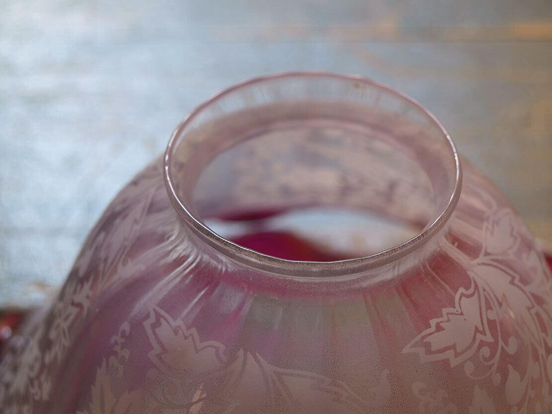 ヨーロッパのアンティーク市にて入手、1930年ぐらい? 美しいハンドメイドのガラスシェード。表面は磨りガラスに植物の模様。ソケット挿入口はカットしただけでなく、火を入れて縁を滑らかに加工してあります、内径5.5cm程度。特に目立つダメージの無い良い状態のものです。日本の規格のソケットがご利用いただけます。参考資料、リメイクなどにどうぞ。