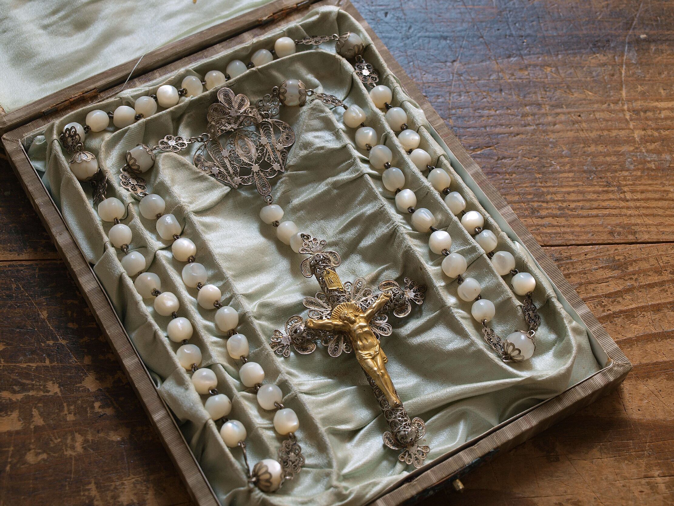 銀線細工 ロザリオ フィリグリー箱入り 十字架 シルバー マザーオブパール ビーズ 1900年代 聖遺物 ヴィクトリアン アンティーク/H793