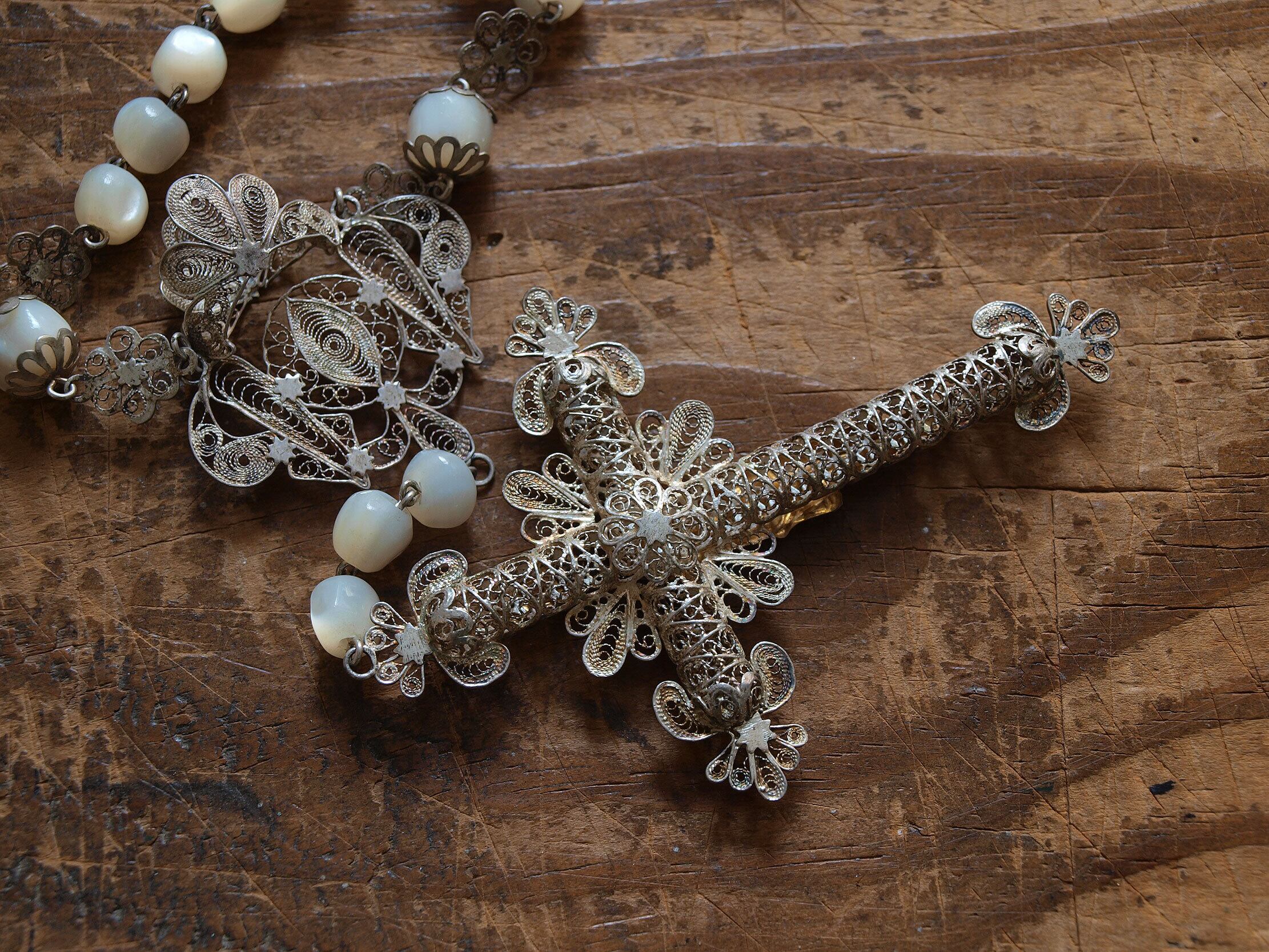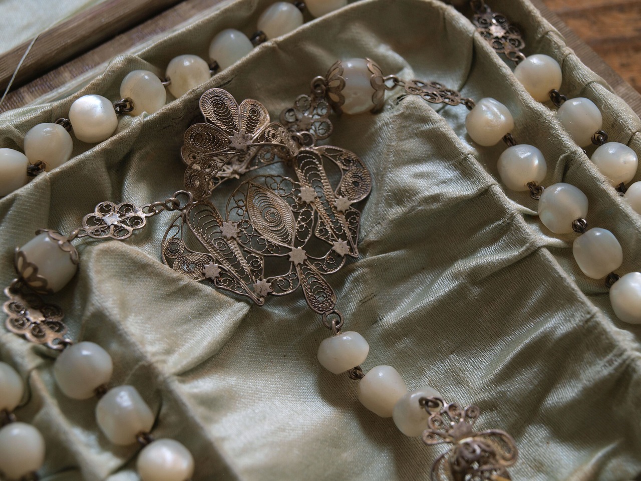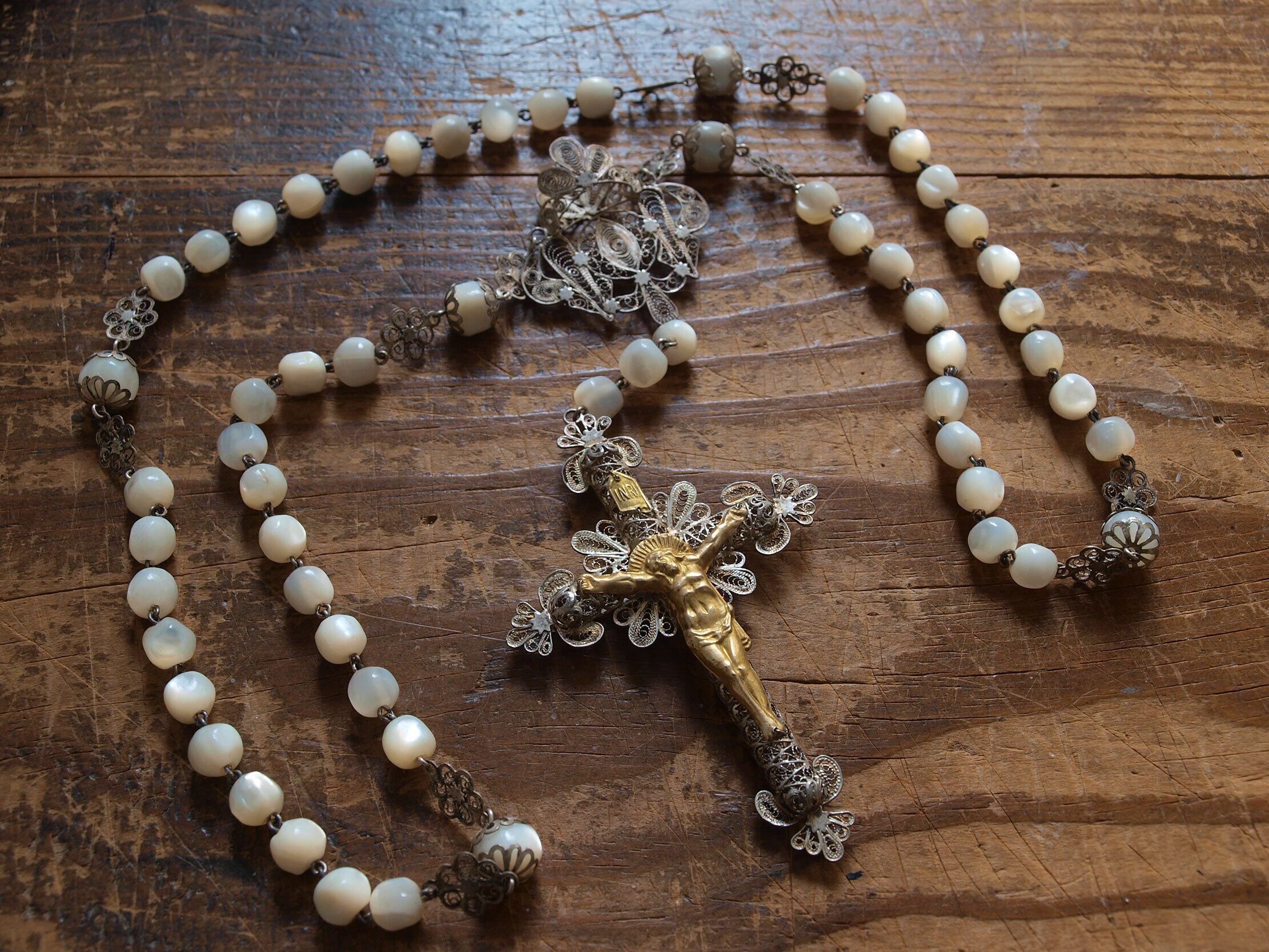手彫りのマザーオブパールのビーズと銀線細工の十字架のロザリオ。1900年ぐらい、またはもっと古い物でしょうか?。輪の部分33.5cm(伸ばした状態)。ィリグリーは細い金属線を溶接して形作られ、アラブから伝わった数千年の歴史の有る技法。フィリグリーに似せて金属板を抜いて作られた物もありますが、こちらは本来の手法で作られています。ロザリオは本来首に掛ける物ではありません。ペンダントとしてのご利用の場合は留め具が必要な場合があります。オリジナルの箱入り。パーツの欠損は無いようですが、目立たない歪み程度はあるかもしれません。箱は木製に紙貼と布張り、布に経年による痛みがあります。古い物と言う事をご理解の上のご入札をお願い致します。