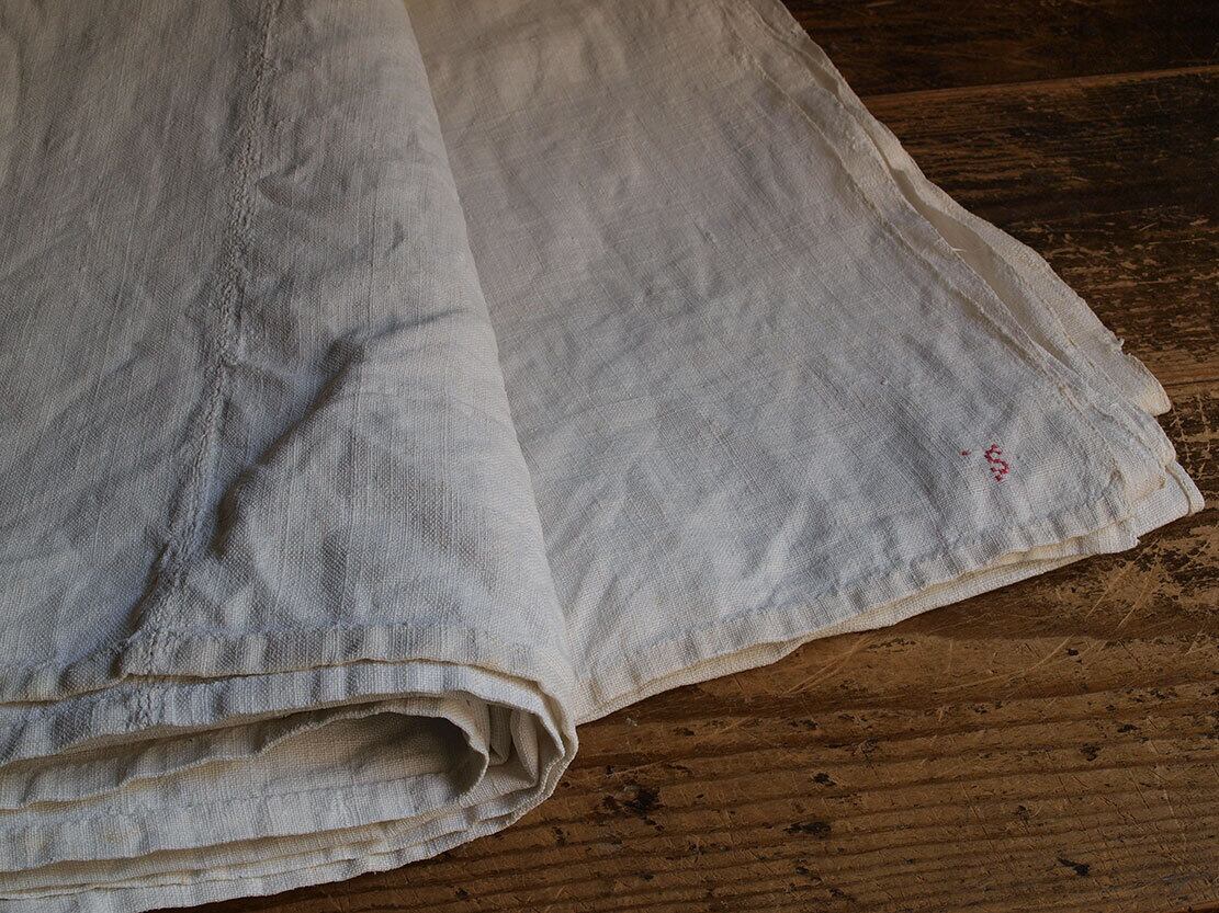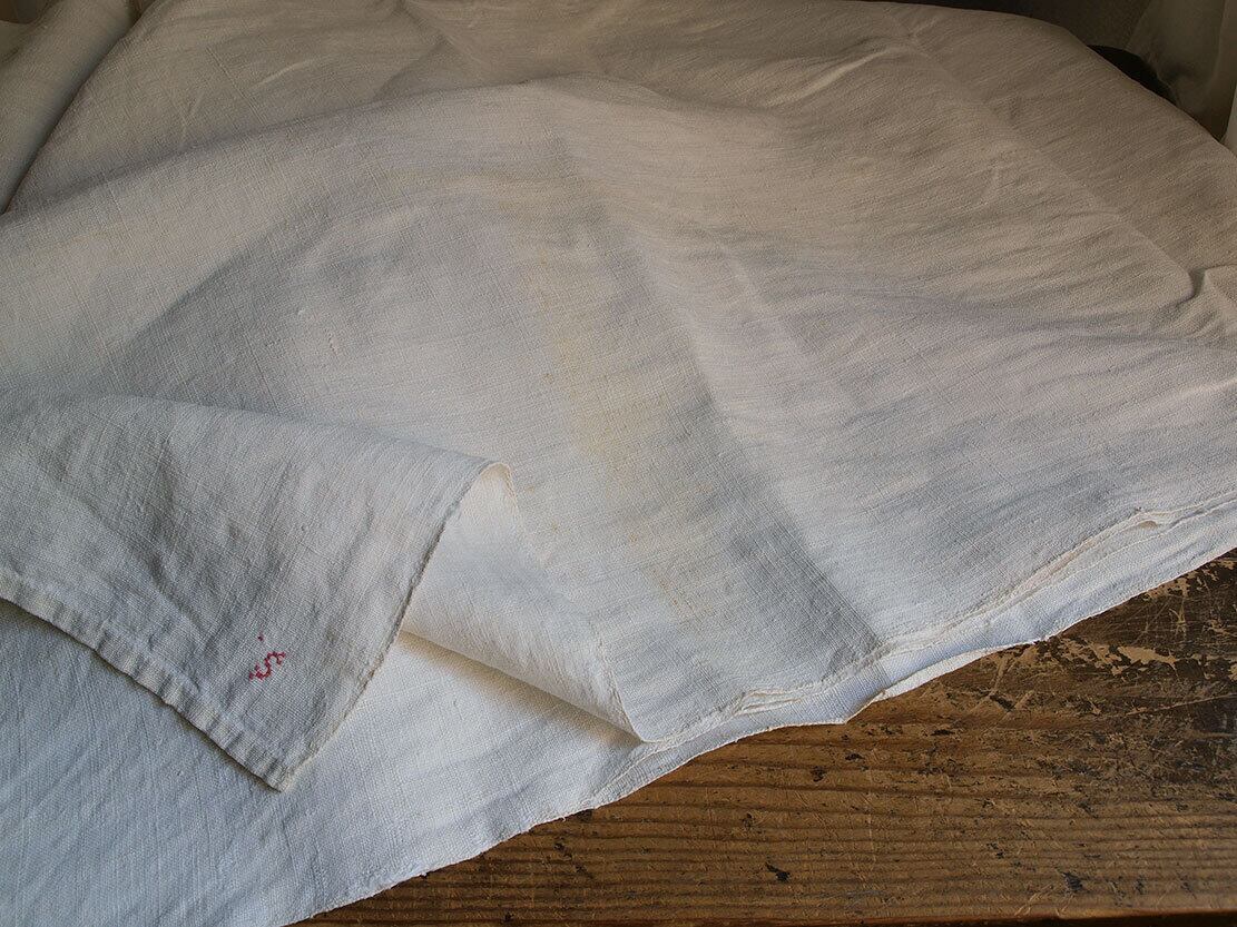 ヨーロッパのアンティーク市にて入手。1930年ぐらい。 少し厚手の平織り、昔のナイティなどにも使われた素材です。細幅の生地を2枚手で丁寧にかがりつけて幅を出してあります、広幅織機が一般的でなかった時代の物です。角に小さなイニシャル刺繍、昔は共同洗濯場で自分の家のものがわかるように刺繍していました。洗濯してありますが、シミなどあります、未晒しの生地です、全体的に糸の色むらもあります、写真参照。洗濯済、実用可能なアンティーク。量産品ではありません。昔の手作業をご堪能下さい。参考資料、リメイクにもどうぞ。ファブリック、衣装、手芸関連を得意としております。他の商品も是非ご覧下さい。