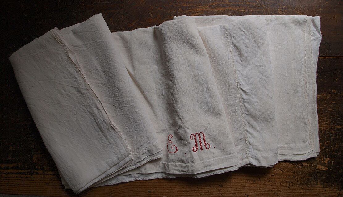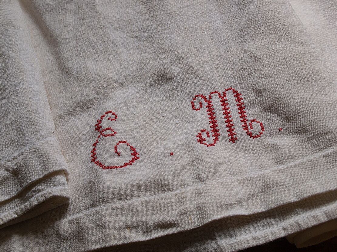 少し厚手の平織り、昔のナイティなどにも使われた素材です。細幅の生地を3枚手で丁寧にかがりつけて幅を出してあります、広幅織機が一般的でなかった時代の物です。中央にイニシャル刺繍、昔は共同洗濯場で自分の家のものがわかるように刺繍していました。中程に別の生地のハギがあります16cm×23cm。未晒しの生地です、洗濯済、実用可能なアンティーク。量産品ではありません。昔の手作業をご堪能下さい。参考資料、リメイクにもどうぞ。ファブリック、衣装、手芸関連を得意としております。他の商品も是非ご覧下さい。